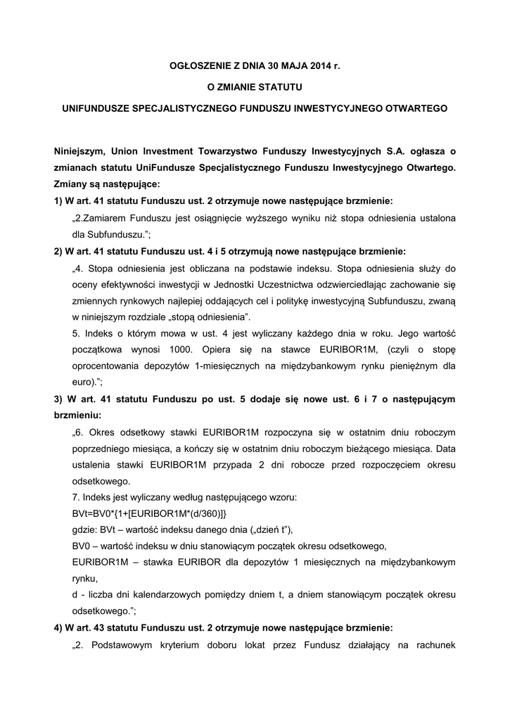 zmianach statutu UniFundusze Specjalistycznego Funduszu Inwestycyjnego Otwartego.