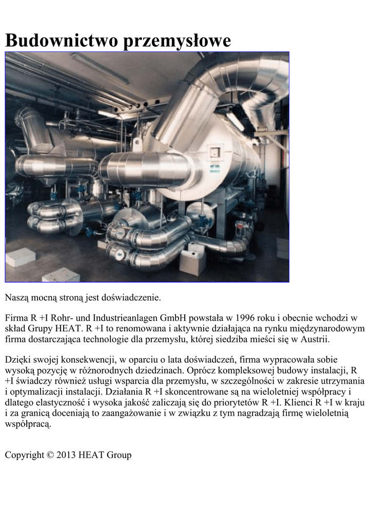 Budownictwo przemysłowe Naszą mocną stroną jest doświadczenie. Firma R +I Rohr- und Industrieanlagen GmbH powstała w 1996 roku i obecnie wchodzi w skład Grupy HEAT. R +I to renomowana i aktywnie działająca na rynku międzynarodowym firma dostarczająca technologie dla przemysłu, której siedziba mieści się w Austrii. Dzięki swojej konsekwencji, w oparciu o lata doświadczeń, firma wypracowała sobie wysoką pozycję w różnorodnych dziedzinach. Oprócz kompleksowej budowy instalacji, R +I świadczy również usługi wsparcia dla przemysłu, w szczególności w zakresie utrzymania i optymalizacji instalacji. Działania R +I skoncentrowane są na wieloletniej współpracy i dlatego elastyczność i wysoka jakość zaliczają się do priorytetów R +I. Klienci R +I w kraju i za granicą doceniają to zaangażowanie i w związku z tym nagradzają firmę wieloletnią współpracą. Copyright © 2013 HEAT Group