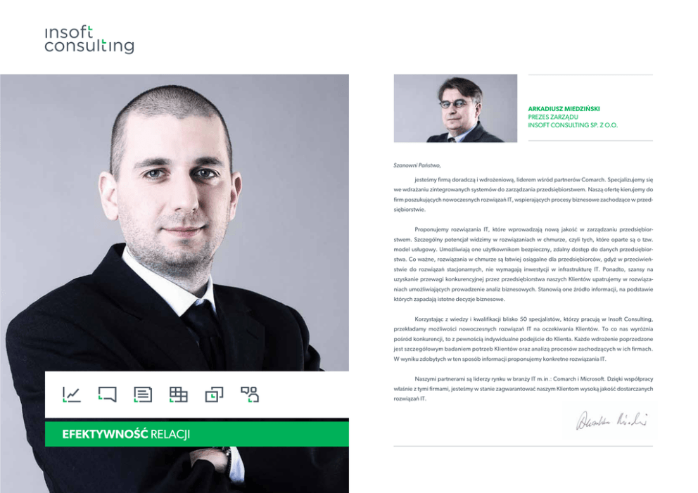 ARKADIUSZ MIEDZIŃSKI PREZES ZARZĄDU INSOFT CONSULTING SP. Z O.O. Szanowni Państwo, jesteśmy firmą doradczą i wdrożeniową, liderem wśród partnerów Comarch. Specjalizujemy się we wdrażaniu zintegrowanych systemów do zarządzania przedsiębiorstwem. Naszą ofertę kierujemy do firm poszukujących nowoczesnych rozwiązań IT, wspierających procesy biznesowe zachodzące w przedsiębiorstwie. Proponujemy rozwiązania IT, które wprowadzają nową jakość w zarządzaniu przedsiębiorstwem. Szczególny potencjał widzimy w rozwiązaniach w chmurze, czyli tych, które oparte są o tzw. model usługowy. Umożliwiają one użytkownikom bezpieczny, zdalny dostęp do danych przedsiębiorstwa. Co ważne, rozwiązania w chmurze są łatwiej osiągalne dla przedsiębiorców, gdyż w przeciwieństwie do rozwiązań stacjonarnych, nie wymagają inwestycji w infrastrukturę IT. Ponadto, szansy na uzyskanie przewagi konkurencyjnej przez przedsiębiorstwa naszych Klientów upatrujemy w rozwiązaniach umożliwiających prowadzenie analiz biznesowych. Stanowią one źródło informacji, na podstawie których zapadają istotne decyzje biznesowe. przekładamy możliwości nowoczesnych rozwiązań IT na oczekiwania Klientów. To co nas wyróżnia pośród konkurencji, to z pewnością indywidualne podejście do Klienta. Każde wdrożenie poprzedzone jest szczegółowym badaniem potrzeb Klientów oraz analizą procesów zachodzących w ich firmach. W wyniku zdobytych w ten sposób informacji proponujemy konkretne rozwiązania IT. właśnie z tymi firmami, jesteśmy w stanie zagwarantować naszym Klientom wysoką jakość dostarczanych rozwiązań IT. WDROŻENIA staniu rozwiązań IT, usprawnić procesy biznesowe i skutecznie kierować przedsiębiorstwem. Nasi specjaliści, po przeanalizowaniu procesów zachodzących w firmach Klientów, proponują im najkorzystniejsze rozwiązania w zakresie systemów do zarzą- O dzania przedsiębiorstwem oraz projektują niezbędną rozbudowę infrastruktury IT. Wspieramy naszych Klientów w każdym AN AL IZ A POTRZ EB ENIA OŻ DR W Od ponad 10 lat doradzamy naszym Klientom jak, przy wykorzy- DORA DZ TW DORADZTWO Wdrażamy systemy do zarządzania przedsiębiorstwem. Podstawą naszych wdrożeń są rozwiązania standardowe, które konfigurujemy zgodnie z unikalnymi potrzebami Klientów. Posiadamy również duże doświadczenie w integracji systemów do zarządzania przedsiębiorstwem z innymi aplikacjami. Każdy projekt wdrożeniowy realizowany jest w oparciu o ścisłą współpracę z Klientami i sprawdzoną metodykę okresie współpracy. Przykładamy dużą uwagę do efektywnej wdrożeniową. Zespół specjalistów stale czuwa nad prawidło- komunikacji z Klientami, ponieważ dzięki niej możemy pełnić wym przebiegiem wdrożenia i wspiera Klientów w pierw- rolę skutecznego doradcy i reagować na pojawiające się potrze- szych dniach eksploatacji systemu. by w ich przedsiębiorstwach. I „ skutecznie wdraża oprogramowanie, ale także doradza jak je dobrze wykorzystać dla znaczącej poprawy efektywności.” „ Klienta oraz sprawnie i profesjonalnie przeprowadzić cały trudny proces wdrożenia zintegrowanego systemu.” PAWEŁ HAPANIUK, WSPÓŁWŁAŚCICIEL PH ROTOR SP.J. JANUSZ KROLL, V-CE PREZES DS.HANDLU I MARKETINGU AGROMA OLSZTYN GRUPA SZNAJDER SP. Z O.O. WSPARCIE POWDROŻENIOWE Udzielamy naszym Klientom wsparcia w zakresie bieżącej obsługi, utrzymywania i rozwi- Więcej referencji na jania wdrożonego rozwiązania IT. W sytuacji pojawienia się nowych potrzeb w przedsiębiorstwach naszych Klientów, z pewnością dostosujemy ich aktualne rozwiązania IT do kolejnych wymagań. Ponadto, w ramach usługi wsparcia powdrożeniowego, realizujemy szkolenia dla użytkowników i administratorów wdrożonego rozwiązania IT. „ udziela nam wsparcia technicznego i merytorycznego w eksploatacji Comarch ERP Optima, dostarcza sprzęt komputerowy itp.“ BOGUMIŁA KUJAWA, PREZES ALFIN SP. Z O.O. PARTNERZY : Nasze wartości. Kontakt. wspierają wszystko co robimy i wyrażają wyznawaną przez nas filozofię biznesową. ul. Łużycka 3B 81-537 Gdynia + 48 (58) 661 43 77 Oddział Bydgoszcz EFEKTYWNOŚĆ STABILNOŚĆ ul. Fordońska 246 lok.3 +48 (52) 321 09 39 Oddział Olsztyn ul.Towarowa 9 +48 (89) 532 02 04 DORADZTWO RELACJE ZAANGAŻOWANIE WIEDZA