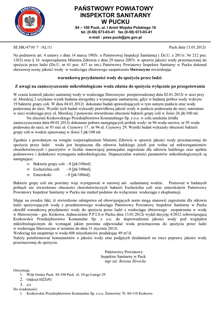 PAŃSTWOWY POWIATOWY INSPEKTOR SANITARNY W PUCKU 84 – 100 Puck, ul. I Armii Wojska Polskiego 16 tel. (0-58) 673-03-41 fax (0-58) 673-03-41 e-mail : [email protected] SE.HK/4710/ 7 /AL/11 Puck dnia 13.01.2012r Na podstawie art. 4 ustawy z dnia 14 marca 1985r. o Państwowej Inspekcji Sanitarnej ( Dz.U. z 2011r. Nr 212 poz. 1263) oraz § 16 rozporządzenia Ministra Zdrowia z dnia 29 marca 2007r. w sprawie jakości wody przeznaczonej do spożycia przez ludzi (Dz.U. nr 61 poz. 417 ze zm.) Państwowy Powiatowy Inspektor Sanitarny w Pucku dokonał okresowej oceny jakości wody w wodociągu zbiorowego zaopatrzenia Sławoszyno stwierdzając warunkową przydatności wody do spożycia przez ludzi. Z uwagi na zanieczyszczenie mikrobiologiczne woda zdatna do spożycia wyłącznie po przegotowaniu W czasie kontroli jakości sanitarnej wody w wodociągu Sławoszyno przeprowadzonej dnia 02.01.2012r w sieci przy ul. Morskiej 2 uzyskano wynik badania niezgodny z wymogami sanitarnymi, gdyż w badanej próbce wody wykryto 19 bakterie grupy coli. W dniu 04.01.2012r dokonano badań sprawdzających w tym samym punkcie oraz wody podawanej do sieci. Wyniki tych badań wykazały prawidłową jakość wody w punkcie podawania do sieci, natomiast w sieci wodociągu przy ul. Morskiej 2 ponownie stwierdzono obecność bakterii grupy coli w ilości 26 jtk/100 ml. Na zlecenie Krokowskiego Przedsiębiorstwa Komunalnego Sp. z o.o. w celu ustalenia źródła zanieczyszczenia dnia 09.01.2012r dokonano poboru następujących próbek wody: nr 96 woda surowa, nr 95 woda podawana do sieci, nr 93 sieć ul. Ceynowy 17 , nr 94 ul. Ceynowy 29. Wyniki badań wykazały obecność bakterii grupy coli w wodzie ujmowanej w ilości 5 jtk/100 ml. Zgodnie z powołanym na wstępie rozporządzeniem Ministra Zdrowia w sprawie jakości wody przeznaczonej do spożycia przez ludzi woda jest bezpieczna dla zdrowia ludzkiego jeżeli jest wolna od mikroorganizmów chorobotwórczych i pasożytów w liczbie stanowiącej potencjalne zagrożenie dla zdrowia ludzkiego oraz spełnia podstawowe i dodatkowe wymagania mikrobiologiczne. Dopuszczalne wartości parametrów mikrobiologicznych są następujące: • Bakterie grupy coli - 0 [jtk/100ml] • Escherichia coli - 0 [jtk/100ml]. • Enterokoki - 0 [jtk/100ml]. Bakterie grupy coli nie powinny więc występować w surowej ani uzdatnianej wodzie. Ponieważ w badanych próbach nie stwierdzono obecności chorobotwórczych bakterii Escherichia coli oraz enterokoków Państwowy Powiatowy Inspektor Sanitarny w Pucku nie znalazł podstaw do wyłączenia wodociągu z eksploatacji. Mając na uwadze fakt, iż stwierdzone odstępstwa od obowiązujących norm mogą stanowić zagrożenie dla zdrowia ludzi spożywających wodę z przedmiotowego wodociągu Państwowy Powiatowy Inspektor Sanitarny w Pucku określił warunkową przydatności wody do spożycia przez ludzi z wodociągu zbiorowego zaopatrzenia w wodę w Sławoszynie - gm. Krokowa. Jednocześnie P.P.I.S.w Pucku dnia 13.01.2012r wydał decyzję 4/2012 zobowiązującą Krokowskie Przedsiębiorstwo Komunalne Sp. z o.o. do doprowadzenia jakości wody pod względem mikrobiologicznym do wymagań jakim powinna odpowiadać woda przeznaczona do spożycia przez ludzi w wodociągu Sławoszyno w terminie do dnia 31 stycznia 2012r. Wodociąg ten zaopatruje w wodę 608 mieszkańców produkując 49 m3/d. Należy poinformować konsumentów o jakości wody oraz podjętych działaniach na rzecz poprawy jakości wody przeznaczonej do spożycia. Państwowy Powiatowy Inspektor Sanitarny w Puck mgr inż. Bożena Śliwicka Otrzymują: 1. Wójt Gminy Puck 84-100 Puck ul. 10-go Lutego 29 2. Oddział HŻŻiPU 3. a/a Do wiadomości: 1. Krokowskie Przedsiębiorstwo Komunalne Sp. z o.o. Żarnowiec 76 84-110 Krokowa