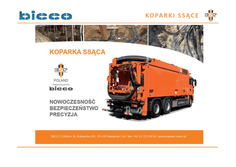KO PA R K I S S Ą C E KO PA R K I S S Ą C E Nasz zakład produkuje koparki ssące i urządzenia stacjonarne od 1993 roku. Posiadamy blisko 20-to letnie doświadczenie w konstruowaniu i wytwarzaniu koparek ssących. Dzięki utrzymywaniu stałych kontaktów z naszymi klientami jesteśmy w stanie stale rozwijać nasze produkty i dopasowywać je do potrzeb klientów KO PA R K I S S Ą C E Produkujemy zabudowy, które montujemy na podwoziach 2,3,4 i 5 osiowych,. Wytwarzamy także stacjonarne jednostki ssące oraz wysoko specjalistyczne urządzenia do zadań specjalnych KO PA R K I S S Ą C E KO PA R K I S S Ą C E Dlaczego odsysanie? •Brak ryzyka uszkodzenia instalacji podziemnych •Nie rozsypywanie urobku wokół obszaru pracy •Mniejsze wykopy •Redukcja kosztów – wykopujesz ile potrzebujesz •Poziom hałasu niższy niż w tradycyjnych koparkach •Większa wydajność w krótszym czasie •Mniejsze utrudnienia w ruchu KO PA R K I S S Ą C E KO PA R K I S S Ą C E KO PA R K I S S Ą C E DZIĘKUJĘ ZA UWAGĘ BICCO Al. Katowicka 49, Wolica 05-830 Nadarzyn tel. 022 374 75 01 tel. 0606 707 430 fax. 022 435 79 37 [email protected] www.bicco.pl www.koparki-ssace.pl