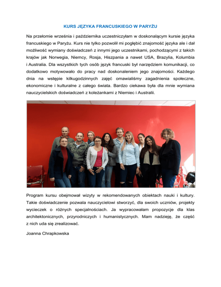 KURS JĘZYKA FRANCUSKIEGO W PARYŻU Na przełomie września i października uczestniczyłam w doskonalącym kursie języka francuskiego w Paryżu. Kurs nie tylko pozwolił mi pogłębić znajomość języka ale i dał możliwość wymiany doświadczeń z innymi jego uczestnikami, pochodzącymi z takich krajów jak Norwegia, Niemcy, Rosja, Hiszpania a nawet USA, Brazylia, Kolumbia i Australia. Dla wszystkich tych osób język francuski był narzędziem komunikacji, co dodatkowo motywowało do pracy nad doskonaleniem jego znajomości. Każdego dnia na wstępie kilkugodzinnych zajęć omawialiśmy zagadnienia społeczne, ekonomiczne i kulturalne z całego świata. Bardzo ciekawa była dla mnie wymiana nauczycielskich doświadczeń z koleżankami z Niemiec i Australii. Program kursu obejmował wizyty w rekomendowanych obiektach nauki i kultury. Takie doświadczenie pozwala nauczycielowi stworzyć, dla swoich uczniów, projekty wycieczek o różnych specjalnościach. Ja wypracowałam propozycje dla klas architektonicznych, przyrodniczych i humanistycznych. Mam nadzieję, że część z nich uda się zrealizować. Joanna Chrapkowska