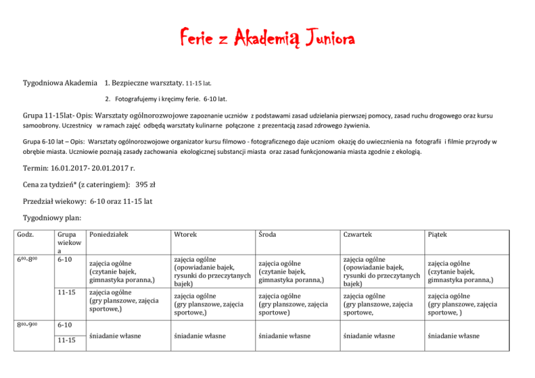 Ferie z Akademią Juniora Tygodniowa Akademia 1. Bezpieczne warsztaty. 11-15 lat. 2. Fotografujemy i kręcimy ferie. 6-10 lat. Grupa 11-15lat- Opis: Warsztaty ogólnorozwojowe zapoznanie uczniów z podstawami zasad udzielania pierwszej pomocy, zasad ruchu drogowego oraz kursu samoobrony. Uczestnicy w ramach zajęć odbędą warsztaty kulinarne połączone z prezentacją zasad zdrowego żywienia. Grupa 6-10 lat – Opis: Warsztaty ogólnorozwojowe organizator kursu filmowo - fotograficznego daje uczniom okazję do uwiecznienia na fotografii i filmie przyrody w obrębie miasta. Uczniowie poznają zasady zachowania ekologicznej substancji miasta oraz zasad funkcjonowania miasta zgodnie z ekologią. Termin: 16.01.2017- 20.01.2017 r. Cena za tydzień* (z cateringiem): 395 zł Przedział wiekowy: 6-10 oraz 11-15 lat Tygodniowy plan: Godz. 600-800 800-900 Grupa wiekow a 6-10 Poniedziałek Wtorek Środa Czwartek Piątek zajęcia ogólne (czytanie bajek, gimnastyka poranna,) zajęcia ogólne (opowiadanie bajek, rysunki do przeczytanych bajek) zajęcia ogólne (czytanie bajek, gimnastyka poranna,) zajęcia ogólne (opowiadanie bajek, rysunki do przeczytanych bajek) zajęcia ogólne (czytanie bajek, gimnastyka poranna,) 11-15 zajęcia ogólne (gry planszowe, zajęcia sportowe,) zajęcia ogólne (gry planszowe, zajęcia sportowe,) zajęcia ogólne (gry planszowe, zajęcia sportowe) zajęcia ogólne (gry planszowe, zajęcia sportowe, zajęcia ogólne (gry planszowe, zajęcia sportowe, ) śniadanie własne śniadanie własne śniadanie własne śniadanie własne 6-10 11-15 śniadanie własne 900-1200 6-10 11-15 1200-1300 1300-1430 Warsztaty fotograficzne w plenerze - krajobrazy. Warsztaty fotograficzne w plenerze - uczestnicy. Warsztaty – efekty pracy w plenerze i drukowanie zdjęć. Kurs pierwszej pomocy oraz zajęcia praktyczne. Kurs pierwszej pomocy oraz zajęcia praktyczne Warsztaty kulinarne Warsztaty kulinarne obiad (catering) obiad (catering) obiad (catering) obiad (catering) obiad (catering) 11-15 obiad (catering) obiad (catering) obiad (catering) obiad (catering) obiad (catering) Zajęcia z przyrody. Warsztaty filmowe . Zajęcia ekologiczne. Warsztaty filmowe . Przygotowanie wystawy prac autorskich. Z nagrodami. Warsztaty kulinarne Warsztaty kulinarne Wprowadzenie do samoobrony. Wprowadzenie do samoobrony. Warsztaty topograficzne podwieczorek podwieczorek podwieczorek podwieczorek podwieczorek zajęcia ogólne (oglądnie bajek) zajęcia ogólne (gry komputerowe) zajęcia ogólne (zabawy kreatywne) zajęcia ogólne (oglądanie filmów) zajęcia ogólne (oglądanie bajek) zajęcia ogólne (gry komputerowe) zajęcia ogólne (zabawy kreatywne) zajęcia ogólne (oglądanie filmów) zajęcia ogólne (oglądanie bajek) zajęcia ogólne (gry komputerowe) 6-10 6-10 11-15 1500-1700 Warsztaty fotograficzne . 6-10 11-15 1430-1500 Wprowadzenie do zasad fotografii, prezentacja sprzętu. Kurs przepisów ruchu drogowego . 6-10 11-15 *zaznaczyć właściwe Zespół Szkół im. Wisławy Szymborskiej w Częstochowie ul. Jagiellońska 141, 42-200 Częstochowa tel.: 34 / 365-88-53 697-818-624 fax: 34 / 365-88-53 www: szkoly.czestochowa.zdz.pl e-mail: [email protected]