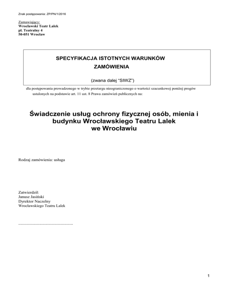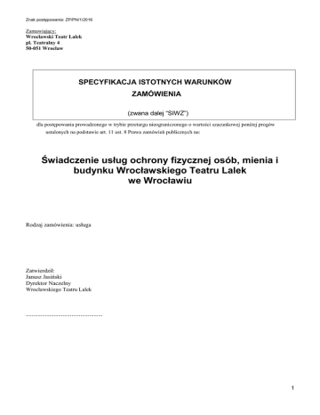 Znak postępowania: ZP/PN/1/2016 Zamawiający: Wrocławski Teatr Lalek pl. Teatralny 4 50-051 Wrocław SPECYFIKACJA ISTOTNYCH WARUNKÓW ZAMÓWIENIA (zwana dalej “SIWZ”) dla postępowania prowadzonego w trybie przetargu nieograniczonego o wartości szacunkowej poniżej progów ustalonych na podstawie art. 11 ust. 8 Prawa zamówień publicznych na: Świadczenie usług ochrony fizycznej osób, mienia i budynku Wrocławskiego Teatru Lalek we Wrocławiu Rodzaj zamówienia: usługa Zatwierdził: Janusz Jasiński Dyrektor Naczelny Wrocławskiego Teatru Lalek .................................................... 1 Znak postępowania: ZP/PN/1/2016 Rozdział I. Informacje o Zamawiającym Zamawiającym jest: Wrocławski Teatr Lalek Adres: 50-051 Wrocław, Pl. Teatralny 4 Numer telefonu (0-71) 344-12-16 Numer faksu (0-71) 335-49-05 Godziny urzędowania od 8:00- 15:00, od poniedziałku do piątku Adres strony internetowej, na której zamieszczona będzie SIWZ: http://www.teatrlalek.wroclaw.pl/ (menu głowne: O Teatrze>Teatr >Przetargi Osoby upoważnione przez Zamawiającego do kontaktów z Wykonawca w zakresie: - merytorycznym: Krzysztof Nowak email: [email protected] - proceduralnym: Krzysztof Nowak email: [email protected] Rozdział II Tryb postępowania. 1. Postępowanie prowadzone jest zgodnie z przepisami ustawy z dnia 29 stycznia 2004 roku Prawo zamówień publicznych tekst jednolity wprowadzony Obwieszczeniem Marszałka Sejmu z dnia 26 listopada 2015 r. w sprawie ogłoszenia jednolitego tekstu ustawy - Prawo zamówień publicznych, opublikowany w Dz. U. z 2015 r. poz. 2164 wraz ze zmianami wprowadzonymi ustawą z dnia 22 czerwca 2016 r. o zmianie ustawy - Prawo zamówień publicznych oraz niektórych innych ustaw (Dz. U. z 2016 r. poz. 1020), (zwanej dalej również "ustawą Pzp") a także wydane na podstawie niniejszej ustawy rozporządzenia wykonawcze dotyczące przedmiotowego zamówienia publicznego, a zwłaszcza: 1) Rozporządzenie Ministra Rozwoju z dnia 26 lipca 2016 r. w sprawie rodzajów dokumentów, jakich może żądać zamawiający od wykonawcy w postępowaniu o udzielenie zamówienia (Dz. U. z 2016 r. poz.1126), 2) Rozporządzenie Prezesa Rady Ministrów z dnia 28 grudnia 2015 r. w sprawie średniego kursu złotego w stosunku do euro stanowiącego podstawę przeliczania wartości zamówień publicznych (Dz. U. z 2015 r. poz. 2254), 3) Rozporządzenie Prezesa Rady Ministrów z dnia 28 grudnia 2015 r. w sprawie kwot wartości zamówień oraz konkursów, od których jest uzależniony obowiązek przekazywania ogłoszeń Urzędowi Publikacji Unii Europejskiej.(Dz. U. z 2015 r. poz. 2263). 2. Postępowanie prowadzone jest w trybie przetargu nieograniczonego o wartości szacunkowej poniżej progów ustalonych na podstawie art. 11 ust. 8 Prawa zamówień publicznych. 3. Podstawa prawna wyboru trybu udzielenia zamówienia publicznego: art. 10 ust. 1 oraz art. 39 - 46 Prawa zamówień publicznych. 4. W zakresie nieuregulowanym w niniejszej Specyfikacji istotnych Warunków Zamówienia (zwanej dalej "SIWZ" lub "specyfikacją"), zastosowanie mają przepisy ustawy Pzp. 5. Postępowanie jest prowadzone zgodnie z art. 24 aa Pzp ( procedura odwrócona). 6.Zamawiający nie dopuszcza składanie ofert częściowych. 7.Zamawiający nie przewiduje zawarcia umowy ramowej. 8.Zamawiający nie dopuszcza składania ofert wariantowych. 9.Zamawiający nie przewiduje aukcji elektronicznej. 10.Zamawiający nie przewiduje zwrotu kosztów udziału w postępowaniu. 11.Zamawiający nie przewiduje określania w opisie przedmiotu zamówienia wymagań związanych z realizacją zamówienia, o których mowa w art. 29 ust. 4 Ustawy Pzp. 12.Zamawiający nie przewiduje rozliczenia w walutach obcych. 13.Zamawiający nie przewiduje zorganizowania zebrania informacyjnego Wykonawców. 14.Zamawiający w okresie obowiązywania umowy nie przewiduje udzielenia zamówień, o których mowa w art. 67 ust. 1 pkt 6 ustawy Pzp Rozdział III. Opis przedmiotu zamówienia Kod CPV - 79710000-4 (usługi ochrony) 98341140-8 (Usługi dozorowania). 1. Przedmiotem zamówienia jest ochrony fizyczna osób, mienia i budynku Wrocławskiego Teatru Lalek. Ochrona osób i mienia w budynku Wrocławskiego Teatru Lalek zgodnie z ustawą z dnia 22.8.1997 r. o ochronie osób i mienia ( Dz. U. 2005 r. nr 145, poz. 1221, ze zm.) realizowana w formie: — stałej i bezpośredniej ochrony fizycznej osób, mienia i budynku w obiekcie Zamawiającego, w systemie posterunku stałego oraz w systemie patrolowo - obchodowym, — bezpośredniego stałego nadzoru (tj. przez 24 godziny na dobę, przez 365 dni w roku 2017 i przez 2 miesiące – styczeń i luty 2018 roku - czyli 59 dni w roku 2018) sygnałów przesyłanych, gromadzonych i przetwarzanych w elektronicznych urządzeniach i systemach alarmowych znajdujących się w obiekcie Zamawiającego, — obsługa rogatki przy wjeździe na teren miejsc postojowych Wrocławskiego Teatru Lalek, wpuszczanie i wypuszczanie pojazdów obsługujących Wrocławski Teatr Lalek oraz posiadających zgodę wjazdu i wyjazdu, monitorowanie miejsc postojowych; wzywanie odpowiednich służb. 2. Szczegółowy opis przedmiotu zamówienia określa Opis Przedmiotu Zamówienia wraz z wykazem posterunku i harmonogramem prac, będący załącznikiem nr 1 do SIWZ oraz wzór umowy stanowiący Załącznik nr 8 do SIWZ Opis przedmiotu zamówienia sporządzono z uwzględnieniem ustawy z dnia 22 sierpnia 1997r. o ochronie osób i mienia ( Dz. U. 2014 poz.1099), Wykonawca zamontuje w 8 miejscach wskazanych przez Zamawiającego na własny koszt w terminie do 14 dni kalendarzowych od podpisania umowy, system rejestrujący obchody chronionego terenu. System rejestrujący po zakończeniu realizacji zamówienia pozostanie własnością Wykonawcy. 2 Znak postępowania: ZP/PN/1/2016 WYMAGANIA DLA ZAKRESÓW PRZEDMIOTU ZAMÓWIENIA 1. Zamawiający stosownie do art.29 ust.3a ustawy wymaga zatrudnienia przez wykonawcę lub podwykonawcę na podstawie umowy o pr