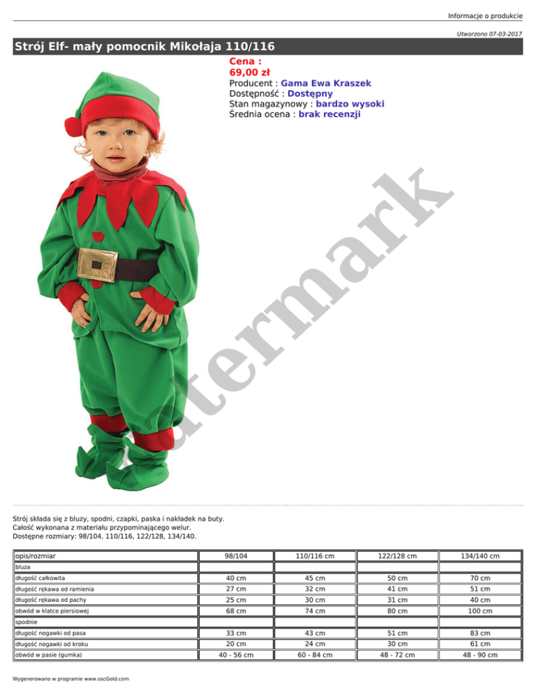 Informacje o produkcie Utworzono 07-03-2017 Strój Elf- mały pomocnik Mikołaja 110/116 Cena : 69,00 zł w at er m ar k Producent : Gama Ewa Kraszek Dostępność : Dostępny Stan magazynowy : bardzo wysoki Średnia ocena : brak recenzji Strój składa się z bluzy, spodni, czapki, paska i nakładek na buty. Całość wykonana z materiału przypominającego welur. Dostępne rozmiary: 98/104, 110/116, 122/128, 134/140. opis/rozmiar 98/104 110/116 cm 122/128 cm 134/140 cm długość całkowita 40 cm 45 cm 50 cm 70 cm długość rękawa od ramienia 27 cm 32 cm 41 cm 51 cm długość rękawa od pachy 25 cm 30 cm 31 cm 40 cm obwód w klatce piersiowej 68 cm 74 cm 80 cm 100 cm 33 cm 43 cm 51 cm 83 cm bluza spodnie długość nogawki od pasa długość nogawki od kroku obwód w pasie (gumka) Wygenerowano w programie www.oscGold.com 20 cm 24 cm 30 cm 61 cm 40 - 56 cm 60 - 84 cm 48 - 72 cm 48 - 90 cm er m ar k at w