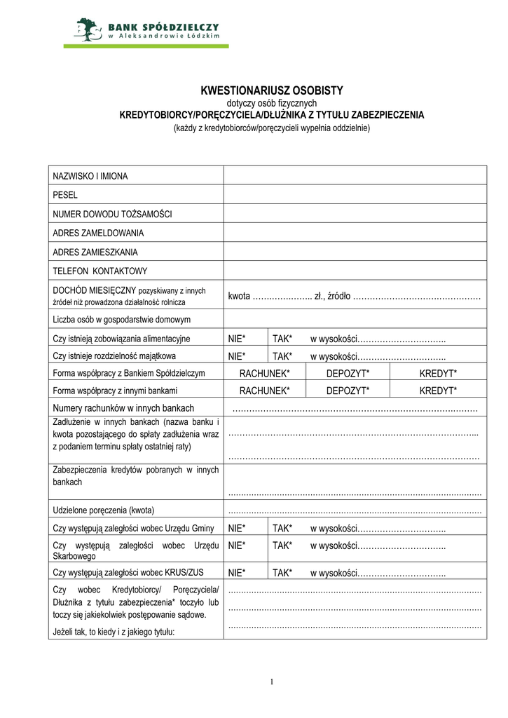 kwestionariusz osobisty - Bank Spółdzielczy w Aleksandrowie