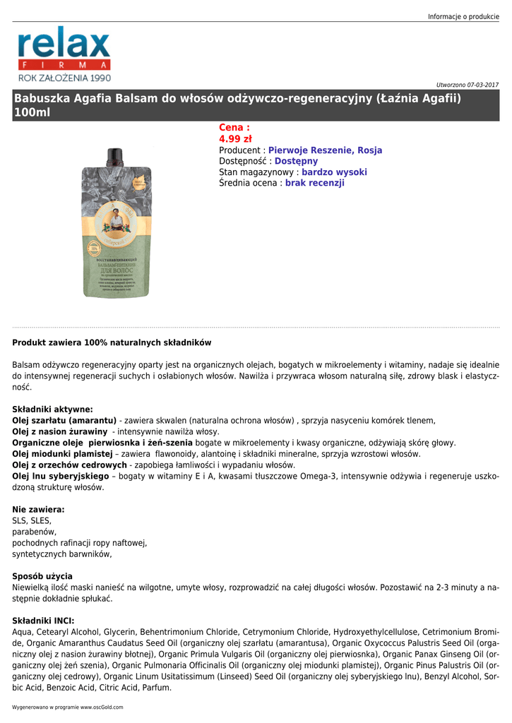 Informacje o produkcie Utworzono 07-03-2017 Babuszka Agafia Balsam do włosów odżywczo-regeneracyjny (Łaźnia Agafii) 100ml Cena : 4.99 zł Producent : Pierwoje Reszenie, Rosja Dostępność : Dostępny Stan magazynowy : bardzo wysoki Średnia ocena : brak recenzji Produkt zawiera 100% naturalnych składników Balsam odżywczo regeneracyjny oparty jest na organicznych olejach, bogatych w mikroelementy i witaminy, nadaje się idealnie do intensywnej regeneracji suchych i osłabionych włosów. Nawilża i przywraca włosom naturalną siłę, zdrowy blask i elastyczność. Składniki aktywne: Olej szarłatu (amarantu) - zawiera skwalen (naturalna ochrona włosów) , sprzyja nasyceniu komórek tlenem, Olej z nasion żurawiny - intensywnie nawilża włosy. Organiczne oleje pierwiosnka i żeń-szenia bogate w mikroelementy i kwasy organiczne, odżywiają skórę głowy. Olej miodunki plamistej – zawiera flawonoidy, alantoinę i składniki mineralne, sprzyja wzrostowi włosów. Olej z orzechów cedrowych - zapobiega łamliwości i wypadaniu włosów. Olej lnu syberyjskiego – bogaty w witaminy E i A, kwasami tłuszczowe Omega-3, intensywnie odżywia i regeneruje uszkodzoną strukturę włosów. Nie zawiera: SLS, SLES, parabenów, pochodnych rafinacji ropy naftowej, syntetycznych barwników, Sposób użycia Niewielką ilość maski nanieść na wilgotne, umyte włosy, rozprowadzić na całej długości włosów. Pozostawić na 2-3 minuty a następnie dokładnie spłukać. Składniki INCI: Aqua, Cetearyl Alcohol, Glycerin, Behentrimonium Chloride, Cetrymonium Chloride, Hydroxyethylcellulose, Cetrimonium Bromide, Organic Amaranthus Caudatus Seed Oil (organiczny olej szarłatu (amarantusa), Organic Oxycoccus Palustris Seed Oil (organiczny olej z nasion żurawiny błotnej), Organic Primula Vulgaris Oil (organiczny olej pierwiosnka), Organic Panax Ginseng Oil (organiczny olej żeń szenia), Organic Pulmonaria Officinalis Oil (organiczny olej miodunki plamistej), Organic Pinus Palustris Oil (organiczny olej cedrowy), Organic Linum Usitatissimum (Linseed) Seed Oil (organiczny olej syberyjskiego lnu), Benzyl Alcohol, Sorbic Acid, Benzoic Acid, Citric Acid, Parfum. Wygenerowano w programie www.oscGold.com Opakowanie: 100ml