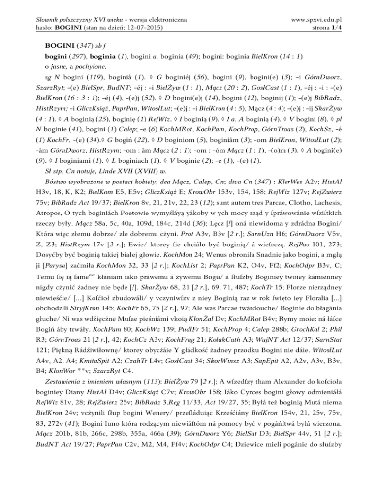 Słownik polszczyzny XVI wieku - wersja elektroniczna hasło: BOGINI (stan na dzień: 12-07-2015) www.spxvi.edu.pl strona 1/4 BOGINI (347) sb f bogini (297), boginia (1), bogini a. boginia (49); bogini: boginia BielKron (14 : 1) o jasne, a pochylone. sg N bogini (119), boginiå (1). ◊ G boginiéj (56), bogini (9), bogini(e) (3); -i GórnDworz, SzarzRyt; -(e) BielSpr, BudNT; -éj : -i BielŻyw (1 : 1), Mącz (20 : 2), GosłCast (1 : 1), -éj : -i : -(e) BielKron (16 : 3 : 1); -éj (4), -(e)j (52). ◊ D bogini(e)j (14), bogini (12), boginij (1); -(e)j BibRadz, HistRzym; -i GliczKsiąż, PaprPan, WitosłLut; -(e)j : -i BielKron (4 : 5), Mącz (4 : 4); -(e)j : -ij SkarŻyw (4 : 1). ◊ A boginią (25), boginię (1) RejWiz. ◊ I boginią (9). ◊ I a. A boginią (4). ◊ V bogini (8). ◊ pl N boginie (41), bogini (1) Calep; -e (6) KochMRot, KochPam, KochProp, GórnTroas (2), KochSz, -é (1) KochFr, -(e) (34).◊ G bogiń (22). ◊ D boginiom (5), boginiåm (3); -om BielKron, WitosłLut (2); -åm GórnDworz, HistRzym; -om : åm Mącz (2 : 1); -om : -óm Mącz (1 : 1), -(o)m (3). ◊ A bogini(e) (9). ◊ I boginiami (1). ◊ L boginiach (1). ◊ V boginie (2); -e (1), -(e) (1). Sł stp, Cn notuje, Linde XVII (XVIII) w. Bóstwo wyobrażone w postaci kobiety; dea Mącz, Calep, Cn; diva Cn (347) : KlerWes A2v; HistAl H3v, 18, K, K2; BielKom E5, E5v; GliczKsiąż E; KrowObr 153v, 154, 158; RejWiz 127v; RejZwierz 75v; BibRadz Act 19/37; BielKron 8v, 21, 21v, 22, 23 (12); sunt autem tres Parcae, Clotho, Lachesis, Atropos, O tych boginiách Poetowie wymyśláyą yákoby w ych mocy rząd y ſpráwowánie wſziſtkich rzeczy były. Mącz 58a, 5c, 40a, 109d, 184c, 214d (36); Lęcz [!] oná niewidoma y zdrádna Bogini/ Która więc złemu dobrze/ zle dobremu cżyni. Prot A3v, B3v [2 r.]; SarnUzn H6; GórnDworz V5v, Z, Z3; HistRzym 17v [2 r.]; Ewie/ ktorey ſie chciáło być boginią/ á wieſzczą. RejPos 101, 273; Dosyćby być boginią takiej białej głowie. KochMon 24; Wenus obroniła Snadnie jako bogini, a mgłą ji [Parysa] zaćmiła KochMon 32, 33 [2 r.]; KochList 2; PaprPan K2, O4v, Ff2; KochOdpr B3v, C; Temu ſię ią ſamemv kłániam iako práwemu á żywemu Bogu/ á ſłuſzby Boginiey twoiey kámienney nigdy cżynić żadney nie będe [!]. SkarŻyw 68, 21 [2 r.], 69, 71, 487; KochTr 15; Florze nierządney niewieśćie/ [...] Koſćioł zbudowáli/ y vczyniwſzv z niey Boginią raz w rok ſwięto iey Floralia [...] obchodzili StryjKron 145; KochFr 65, 75 [2 r.], 97; Ale was Parcae twárdouche/ Boginie do błagánia głuche/ Ni was wdźięcżne Muſae pieśniámi vkoią KlonŻal Dv; KochMRot B4v; Rymy moie: ná łáſce Bogiń áby trwáły. KochPam 80; KochWz 139; PudłFr 51; KochProp 4; Calep 288b; GrochKal 2; Phil R3; GórnTroas 21 [2 r.], 42; KochCz A3v; KochFrag 21; KołakCath A3; WujNT Act 12/37; SarnStat 121; Piękną Rádźiwiłownę/ ktorey obycżáie Y głádkość żadney przodku Bogini nie dáie. WitosłLut A4v, A2, A4; KmitaSpit A2; CzahTr L4v; GosłCast 34; SkorWinsz A3; SapEpit A2, A2v, A3v, B3v, B4; KlonWor **v; SzarzRyt C4. Zestawienia z imieniem własnym (113): BielŻyw 79 [2 r.]; A wſzedſzy tham Alexander do koſcioła boginiey Diany HistAl D4v; GliczKsiąż C7v; KrowObr 158; Iáko Cyrces bogini głowy odmieniáłá RejWiz 81v, 28; RejZwierz 25v; BibRadz 3.Reg 11/33, Act 19/27, 35; Byłá też boginią Mutá niema BielKron 24v; vcżynili ſłup bogini Wenery/ przeſláduiąc Krześćiány BielKron 154v, 21, 25v, 75v, 83, 272v (41); Bogini Iuno która rodzącym niewiáſtóm ná pomocy być v pogáńſtwá byłá wierzona. Mącz 201b, 81b, 266c, 298b, 355a, 466a (39); GórnDworz Y6; BielSat D3; BielSpr 44v, 51 [2 r.]; BudNT Act 19/27; PaprPan C2v, M2, M4, Ff4v; KochOdpr C4; Dziewice mieli pogánie do słuſzby Słownik polszczyzny XVI wieku - wersja elektroniczna hasło: BOGINI (stan na dzień: 12-07-2015) www.spxvi.edu.pl strona 2/4 báhvochwálſkiey/ Weśćie Boginiy. SkarŻyw 68, 68, 69, 188, 443; StryjKron 145; Wielka bogini/ Thetys/ będźie ćie zwáć ſwoią. GórnTroas 58; WujNT Act 19/27 marg, 35, Yyyyy2; WitosłLut A6; Wándá Bogini/ walecżna mężycá. KmitaSpit C; KlonFlis G4. Cf »bogini efeska«, »bogini sydońska«. Fraza: »jest by (jak) bogini« (3): RejWiz 27, 27v; W tancuś iák iedná bogini KochSob 69. Wyrażenia: »bogini nieśmiertelna«: Boginie nieśmiertelne: ktorym áni kraſy/ Ani wonnośći odiąć nie mogą złe cżáſy. WitosłLut A3. »bogini pogańska; pogańska bogini« (5 : 1): Mniſzy vtzynili s Pánny Máryey Boginią Pogáńſką. KrowObr [251v], 151, 153, 154, 158, 166. »święta bogini; bogini święta« (2 : 1): GórnDworz Y6v; Do tego mi pomożćie/ o Boginie święté KochMuza 26; GosłCast 23. peryfr. »wdzięcznołaskawe boginie« = muzy: Kędy wdźięcznołáſkáwé Boginie mieſzkáią/ Co z nich piſorimowie ſławni wſzytko máią. KochProp 4. Zestawienia: »bogini brzemiennych niewiast« = Diana: przeto [Diana] rzecżoná byłá bogini brzemiennych niewiaſt. BielKron 20v. »bogini brzemiennych« = Egeria: Egeria. Bogini brzemyennych w pogańſtwie. Mącz 100d. »bogini brzucha« = Cerera: Cererę boginią brzuchá być powiádaſz HistAl Kv. »boginie czasu« = Horae: Horae Boginie czáſu/służebnice słońcá. Mącz 158a. »bogini członkow tajemnych« = Wenus: przeto iż [Wenus] byłá mátká niecżyſtoſći/ boginią cżłonkow táiemnych być mniemaſz. HistAl Kv. »boginie drzewne, lasow« = driady (2): Mącz 153a; Driades duſze álbo boginie drzewne. KlonŻal Bv marg. »bogini efeska«: DIANA Bogini Epheſka. WujNT Yyyyy2. »bogini egipska«: Isis, Bogini Egipska. Mącz 175a. »boginie gor, gorne« = oready (3): Mącz 59c, 268b; Oreades boginie gorne. KlonŻal Bv marg. »bogini kwiatkow i pol« = Napea: Napaeae, Bogini kwiatkow y pól. Mącz 240d. »bogini kwiatkow i żyt, kwiecia« = Flora (2): Flora, Bogini kwiatków y żyt. Mącz 131a, 58a. »bogini leśna, nad lasy« = Diana (3):gniew Dyany bogi