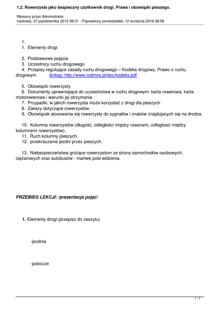 1,2. Rowerzysta jako bezpieczny użytkownik drogi. Prawa i obowiązki pieszego. Wpisany przez Administrator niedziela, 07 października 2012 08:31 - Poprawiony poniedziałek, 12 września 2016 08:58 1. 1. Elementy drogi 2. Podstawowe pojęcia 3. Uczestnicy ruchu drogowego 4. Przepisy regulujące zasady ruchu drogowego – Kodeks drogowy, Prawo o ruchu drogowym http://www.rodmos.pl/doc/kodeks.pdf 5. Obowiązki rowerzysty 6. Dokumenty uprawniające do uczestnictwa w ruchu drogowym: karta rowerowa, karta motorowerowa i warunki jej otrzymania 7. Przypadki, w jakich rowerzysta może korzystać z drogi dla pieszych 8. Zakazy dotyczące rowerzystów. 9. Obowiązek stosowania się rowerzysty do sygnałów i znaków znajdujacych się na drodze. 10. Kolumna rowerzystów (długość, odległości między rowerami, odległosci między kolumnami rowerzystów). 11. Ruch kolumny pieszych. 12. przekraczanie jezdni przez pieszych. 13. Niebezpieczeństwa grożące rowerzystom ze strony samochodów osobowych, ciężarowych oraz autobusów - martwe pole widzenia. PRZEBIEG LEKCJI: /prezentacja pojęć/ 1. Elementy drogi:(przepisz do zeszytu) -jezdnia -pobocze 1/7 1,2. Rowerzysta jako bezpieczny użytkownik drogi. Prawa i obowiązki pieszego. Wpisany przez Administrator niedziela, 07 października 2012 08:31 - Poprawiony poniedziałek, 12 września 2016 08:58 -chodnik -droga, ścieżka dla pieszych -droga, ścieżka dla rowerów -torowisko znajdujące się w obrębie drogi 2. Podstawowe definicje (przepisz do zeszytu) pojazd - środek transportu przeznaczony do poruszania się po drodze oraz maszynę lub urządzenie do tego przystosowane; - droga twarda – droga z jezdnią o nawierzchni bitumicznej, kostkowej, klinkierowej, brukowcowej oraz z płyt betonowych l ub kamienno-betonowych, jeżeli długość nawierzchni przekracza 20m. skrzyżowanie – przecięcie się w jednym poziomie dróg twardych mających jezdnie ich połączenia lub rozwidlenia. przejście dla pieszych – powierzchnia jezdni lub torowiska przeznaczona do przechodzenia przez pieszych. 2/7 1,2. Rowerzysta jako bezpieczny użytkownik drogi. Prawa i obowiązki pieszego. Wpisany przez Administrator niedziela, 07 października 2012 08:31 - Poprawiony poniedziałek, 12 września 2016 08:58 - pojazd uprzywilejowany – pojazd wysyłający sygnały świetlne w postaci niebieskich świateł błyskowych i jednocześnie sygnał dźwiękowy o zmiennym tonie, jadący z włączonymi światłami mijania lub drogowymi. 3. Oznakowanie dróg (przepisz do zeszytu) Drogi oznakowane są znakami drogowymi- pionowymi i poziomymi, sygnalizacją świetlną i sygnalizacją dźwiękową. 4. Na stronie internetowej www.brd.andrej.edu.pl przeczytaj informacje zawarte w dziale przepisy. Obejrzyj filmy znajdujące sie na tej stronie w dziale przekraczanie jezdni i ruch rowerzystów. 3/7 1,2. Rowerzysta jako bezpieczny użytkownik drogi. Prawa i obowiązki pieszego. Wpisany przez Administrator niedziela, 07 października 2012 08:31 - Poprawiony poniedziałek, 12 września 2016 08:58 5. Kolumna pieszych Kolumna pieszych, z wyjątkiem pieszych w wieku do 10 lat, może sie poruszać tylko prawą stroną jezdni w kolumnie maksymalnie czwórkowej. Piesi w wieku do 10 lat mogą iść w kolumnie tylko dwójkami, po chodniku lub poboczu (lewą stroną) pod nadzorem co najmniej jednej osoby pełnoletniej. Jesli nie ma chodnika lub pobocza, kolumna dzieci może iść lewą strona jezdni, ale pod warunkiem zajmowania miejsca jak najbliżej jej krawędzi i ustepowania miejsca nadjeżdżającym pojazdom. Kolumna pieszych nie może chodzic podczas mgły i w warunkach niedostatecznej widoczności powietrza. Długość kolumny pieszych nie może przekraczać 50 metrów, a odległość miedzy kolumnami nie może byc mniejsza niż 100 metrów. Dzieci w wieku do 7 lat może korzystać z drogi tylko pod opieką osoby, która osiagnęła co najmniej wiek 10 lat (w strefie zamieszkania może poruszać sie same całą szerokością jezdni). Dziecko w wieku 15 lat, poruszające się po drodze po zmierzchu, poza obszarem zabudowanym, jest obowiazane używac sygnałów odblaskowych. 6. Przekraczanie jezdni przez pieszych. Zabrania się pieszemu: 1. wchodzenia na jezdnię bezpośrednio przed jadący pojazd, 4/7 1,2. Rowerzysta jako bezpieczny użytkownik drogi. Prawa i obowiązki pieszego. Wpisany przez Administrator niedziela, 07 października 2012 08:31 - Poprawiony poniedziałek, 12 września 2016 08:58 2. wchodzenia na jezdnię spoza pojazdu lub innej przeszkody ograniczającej widoczność drogi, 3. przechodzenia przez jezdnię w miejscu o ograniczonej widoczności drogi, 4. zwalniania kroku lub zatrzymywania się bez uzasadnionej potrzeby podczas przechodzenia przez jezdnię lub torowisko, 5. przebiegania przez jezdnię, 6. chodzenia po torowisku, 7. wchodzenia na torowisko, gdy zapory lub półzapory są opuszczone lub opuszczanie ich rozpoczęto, 8. przechodzenia przez jezdnię w miejscu, w którym jest urządzenie zabezpieczające lub przeszkoda oddzielają drogę. Jeśli do najbliższych "pasów" jest więcej niż 100 metrów, pieszy może przekroczyć jezdnię pod warunkiem, że nie spowoduje zagrożenia bezpieczeństwa ruchu lub utrudnienia ruchu pojazdów, oraz że będzie: ustępował pierwszeństwa nadjeżdżającym pojazdom do przeciwległej krawędzi jezdni szedł drogą najkrótszą, prostopadle do osi jezdni. Jeżeli w odległości mniejszej niż 100 m od wyznaczonego przejścia znajduje się skrzyżowanie, przechodzenie jest dozwolone również na tym skrzyżowaniu na takich samych jak powyżej warunkach. 7. Pytania podumowujące: 1.Jakie są elementy drogi? 2. Kto jest uczestnikiem ruchu drogowego? 5/7 1,2. Rowerzysta jako bezpieczny użytkownik drogi. Prawa i obowiązki pieszego. Wpisany przez Administrator niedziela, 07 października 2012 08:31 - Poprawiony poniedziałek, 12 września 2016 08:58 3. Kto to jest pieszy? 4. Co to jest pojazd? 5. Co to jest droga twarda? 6. Co 