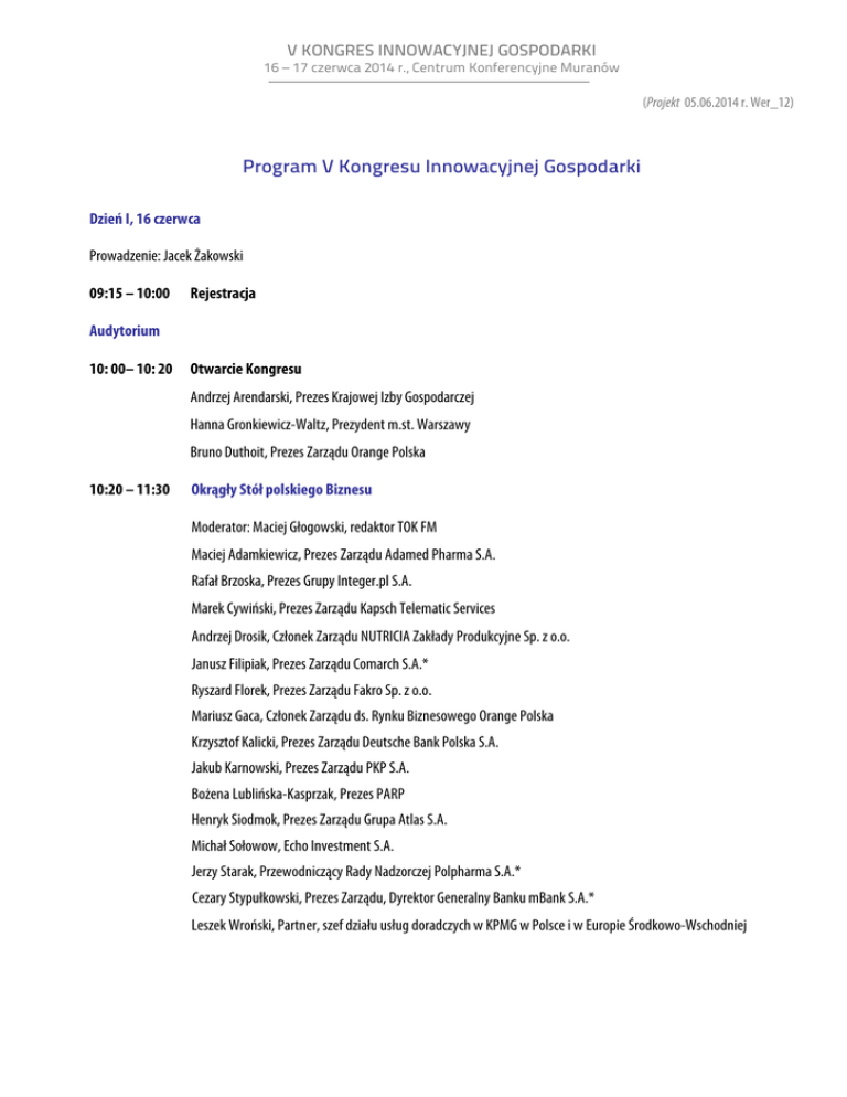 V KONGRES INNOWACYJNEJ GOSPODARKI 16 – 17 czerwca 2014 r., Centrum Konferencyjne Muranów (Projekt 05.06.2014 r. Wer_12) Program V Kongresu Innowacyjnej Gospodarki Dzień I, 16 czerwca Prowadzenie: Jacek Żakowski 09:15 – 10:00 Rejestracja Audytorium 10: 00– 10: 20 Otwarcie Kongresu Andrzej Arendarski, Prezes Krajowej Izby Gospodarczej Hanna Gronkiewicz-Waltz, Prezydent m.st. Warszawy Bruno Duthoit, Prezes Zarządu Orange Polska 10:20 – 11:30 Okrągły Stół polskiego Biznesu Moderator: Maciej Głogowski, redaktor TOK FM Maciej Adamkiewicz, Prezes Zarządu Adamed Pharma S.A. Rafał Brzoska, Prezes Grupy Integer.pl S.A. Marek Cywiński, Prezes Zarządu Kapsch Telematic Services Andrzej Drosik, Członek Zarządu NUTRICIA Zakłady Produkcyjne Sp. z o.o. Janusz Filipiak, Prezes Zarządu Comarch S.A.* Ryszard Florek, Prezes Zarządu Fakro Sp. z o.o. Mariusz Gaca, Członek Zarządu ds. Rynku Biznesowego Orange Polska Krzysztof Kalicki, Prezes Zarządu Deutsche Bank Polska S.A. Jakub Karnowski, Prezes Zarządu PKP S.A. Bożena Lublińska-Kasprzak, Prezes PARP Henryk Siodmok, Prezes Zarządu Grupa Atlas S.A. Michał Sołowow, Echo Investment S.A. Jerzy Starak, Przewodniczący Rady Nadzorczej Polpharma S.A.* Cezary Stypułkowski, Prezes Zarządu, Dyrektor Generalny Banku mBank S.A.* Leszek Wroński, Partner, szef działu usług doradczych w KPMG w Polsce i w Europie Środkowo-Wschodniej V KONGRES INNOWACYJNEJ GOSPODARKI 16 – 17 czerwca 2014 r., Centrum Konferencyjne Muranów 11:30 – 12:20 Brunch 12:20 – 13:50 Audytorium Okrągły Stół III RP: Gdzie byliśmy, gdzie jesteśmy, gdzie będziemy? Perspektywa dalszego rozwoju Polski w Unii Europejskiej Moderator: Jacek Żakowski Jan Krzysztof Bielecki, Przewodniczący Rady Gospodarczej KPRM Włodzimierz Cimoszewicz, Przewodniczący Komisji Spraw Zagranicznych Senatu RP * Aleksander Kwaśniewski, b. Prezydent RP * Kazimierz Marcinkiewicz, b. Premier RP Józef Oleksy, Wiceprzewodniczący Klubu Parlamentarnego SLD Waldemar Pawlak, Poseł na Sejm RP Janusz Steinhoff, Przewodniczący Rady KIG, b. Wicepremier RP i Minister Gospodarki 13:50 – 15:20 Okrągły Stół Polskich Metropolii: Kompleksowe wyzwania – innowacyjne miasta Michał Olszewski, Zastępca Prezydenta m.st. Warszawy Tadeusz Truskolaski, Prezydent Białegostoku Rafał Bruski, Prezydent Bydgoszczy Paweł Adamowicz, Prezydent Gdańska* Piotr Uszok, Prezydent Katowic* Jacek Majchrowski, Prezydent Krakowa* Marek Cieślak, Wiceprezydent Miasta Łodzi Ryszard Grobelny, Prezydent Poznania* Piotr Krzystek, Prezydent Szczecina* Stanisław Sienko, Wiceprezydent Miasta Rzeszów Adam Grehl, Wiceprezydent Miasta Wrocławia 15:20 – 15:40 Prezentacja raportu KPMG „Dojrzałość innowacyjna przedsiębiorstw w Polsce” Kiejstut Żagun, Dyrektor, Szef zespołu ds. ulg i dotacji w KPMG w Polsce 15:40 – 16:40 Networking 16:40 Zakończenie pierwszego dnia Kongresu 2 V KONGRES INNOWACYJNEJ GOSPODARKI 16 – 17 czerwca 2014 r., Centrum Konferencyjne Muranów Dzień II, 17 czerwca** 09:00 – 10:00 Rejestracja Audytorium 10:00 – 11:00 Wystąpienie Gościa Specjalnego: Gary Shapiro, Prezes Consumer Electronics Association 11:00 – 12:30 Panele równoległe Audytorium Energetyka: Polityka Klimatyczno-Energetyczna UE do roku 2030. Otwarte Posiedzenie Komitetu ds. Polityki Klimatyczno-Energetycznej Moderator: Herbert Leopold Gabryś, Przewodniczący Komitetu ds. polityki klimatyczno-energetycznej Krajowej Izby Gospodarczej Janusz Piechociński, Wicepremier, Minister Gospodarki * Stanisław Gawłowski, Sekretarz Stanu, Ministerstwo Środowiska Jean André Barbosa, Dyrektor Areva S.A. Janusz Turski, Dyrektor Generalny Stowarzyszenia Papierników Polskich Bolesław Jankowski, Wiceprezes EnergSys, Członek Komitetu ds. polityki klimatyczno-energetycznej Krajowej Izby Gospodarczej Stanisław Tokarski, Prezes TAURON Wytwarzanie S.A, Członek Komitetu ds. polityki klimatyczno-energetycznej Krajowej Izby Gospodarczej Waldemar Szulc, Wiceprezes Zarządu, PGE Górnictwo i Energetyka Konwencjonalna S.A. Przedstawiciel PGNiG Przedstawiciel TAURON Polska Energia Przedstawiciele EUROCHAMBRES Sala 1 Paczkomaty InPost: Od małych skrytek do wielkiego międzynarodowego sukcesu Moderator: Rafał Zgorzelski, Prezes Ogólnopolskiego Związku Pracodawców Niepublicznych Operatorów Pocztowych * Rafał Brzoska, Prezes Grupy Integer.pl Marian Szołucha, ekspert Fundacji Centrum im. Władysław Grabskiego Joanna Szalacha-Jarmużek, prezes Fundacji Kazimierza Wielkiego Janusz Jank, Dyrektor Handlowy InPost Jakub Ratajczak, Dyrektor Zarządzający easyPack 3 V KONGRES INNOWACYJNEJ GOSPODARKI 16 – 17 czerwca 2014 r., Centrum Konferencyjne Muranów 12:30 – 13:00 Przerwa Audytorium 13:00 – 13:15 Prezentacja Raportu Kongresu: „25+ Jak zapewnić Polsce kolejne 25 lat sukcesu? Od podwykonawcy do kreatora” Ryszard Petru, Prezes Towarzystwa Ekonomistów Polskich 13:15 - 13:30 Wystąpienie Bronisław Komorowski, Prezydent RP* 13:30 – 15:00 CES Unveiled Warsaw Networking Lunch 15:00 - 16:30 Panele równoległe Audytorium 25+ Digitalizacja świata Moderator: Witold Hołubowicz, UAM / ITTI Poznań Gary Shapiro, Prezes CES Unveiled Kamil Adamczyk, Prezes IntelClinic Jarosław Chałas, Kancelaria Prawna Chałas i Wspólnicy Stefan Kamiński, Prezes Zarządu Krajowa Izba Gospodarcza Elektroniki i Telekomunikacji Krzysztof Jan Kurzydłowski, Dyrektor Narodowego Centrum Badań i Rozwoju Przedstawiciel Orange Przedstawiciel Kapsch Sala 1 Medycyna 25+ e-medycyna? Moderator: Ryszard Olszanowski, Prezes Izby Gospodarczej Medycyna Polska Artur Brzóska, Prezes Kasy Rolniczego Ubezpieczenia Społecznego * Zbigniew Derdziuk, Prezes Zakładu Ubezpieczeń Społecznych Robert Gierek, ekspert Komitetu Zdrowia KIG * Andrzej Horoch, Instytut Medycyny Wsi Michał Jonczyński, Członek Zarządu Zakładu Ubezpieczeń Społecznych Wojciech Matusewicz, Dyrektor Agencji Oceny Technologii Medycznych Michał Szczerba, Szef Sejmowej Komisji Pol