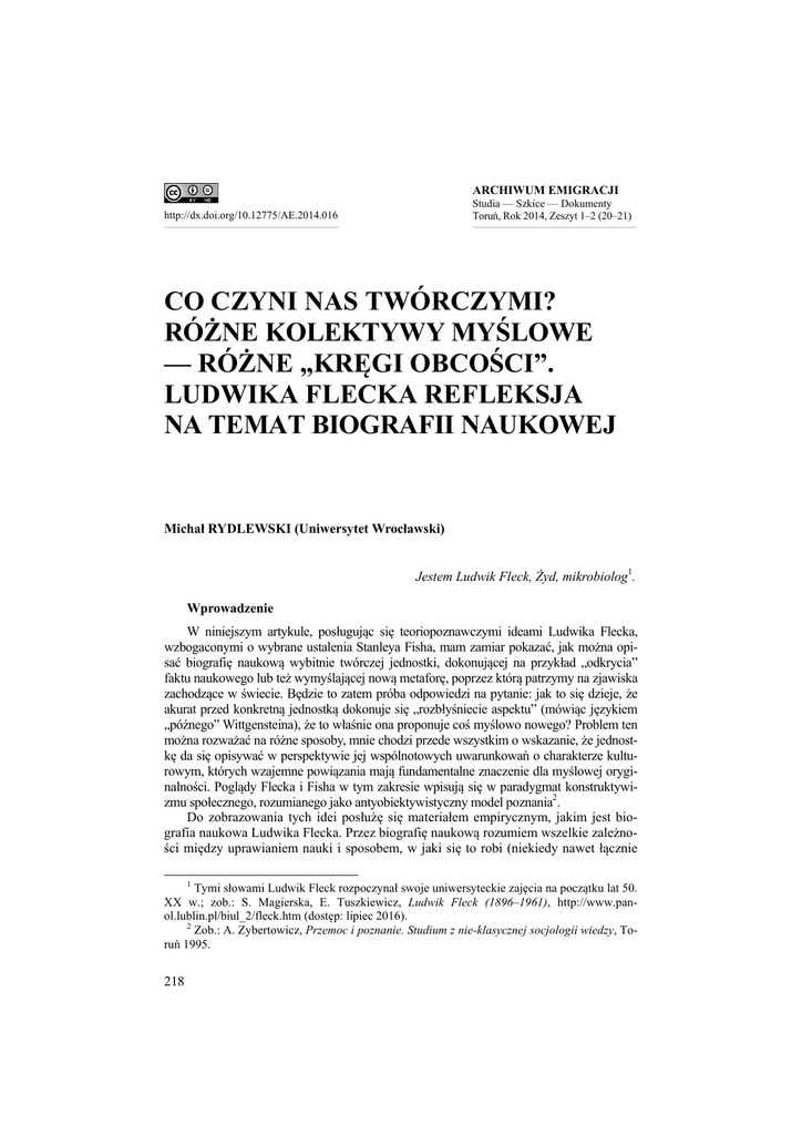 ARCHIWUM EMIGRACJI http://dx.doi.org/10.12775/AE.2014.016 Studia — Szkice — Dokumenty Toruń, Rok 2014, Zeszyt 1–2 (20–21) _________________________________________________________________ _____________________________________________________________ CO CZYNI NAS TWÓRCZYMI? RÓŻNE KOLEKTYWY MYŚLOWE — RÓŻNE „KRĘGI OBCOŚCI”. LUDWIKA FLECKA REFLEKSJA NA TEMAT BIOGRAFII NAUKOWEJ Michał RYDLEWSKI (Uniwersytet Wrocławski) Jestem Ludwik Fleck, Żyd, mikrobiolog1. Wprowadzenie W niniejszym artykule, posługując się teoriopoznawczymi ideami Ludwika Flecka, wzbogaconymi o wybrane ustalenia Stanleya Fisha, mam zamiar pokazać, jak można opisać biografię naukową wybitnie twórczej jednostki, dokonującej na przykład „odkrycia” faktu naukowego lub też wymyślającej nową metaforę, poprzez którą patrzymy na zjawiska zachodzące w świecie. Będzie to zatem próba odpowiedzi na pytanie: jak to się dzieje, że akurat przed konkretną jednostką dokonuje się „rozbłyśniecie aspektu” (mówiąc językiem „późnego” Wittgensteina), że to właśnie ona proponuje coś myślowo nowego? Problem ten można rozważać na różne sposoby, mnie chodzi przede wszystkim o wskazanie, że jednostkę da się opisywać w perspektywie jej wspólnotowych uwarunkowań o charakterze kulturowym, których wzajemne powiązania mają fundamentalne znaczenie dla myślowej oryginalności. Poglądy Flecka i Fisha w tym zakresie wpisują się w paradygmat konstruktywizmu społecznego, rozumianego jako antyobiektywistyczny model poznania2. Do zobrazowania tych idei posłużę się materiałem empirycznym, jakim jest biografia naukowa Ludwika Flecka. Przez biografię naukową rozumiem wszelkie zależności między uprawianiem nauki i sposobem, w jaki się to robi (niekiedy nawet łącznie 1 Tymi słowami Ludwik Fleck rozpoczynał swoje uniwersyteckie zajęcia na początku lat 50. XX w.; zob.: S. Magierska, E. Tuszkiewicz, Ludwik Fleck (1896–1961), http://www.panol.lublin.pl/biul_2/fleck.htm (dostęp: lipiec 2016). 2 Zob.: A. Zybertowicz, Przemoc i poznanie. Studium z nie-klasycznej socjologii wiedzy, Toruń 1995. 218 z metodą), a doświadczeniami życiowymi naukowca, wynikającymi w dużej mierze z kontekstu społecznego, w jakim przyszło mu żyć. Takie rozumienie biografii naukowej wydaje się niezwykle płodne poznawczo, czego dowodem w polskiej nauce są znakomite prace Marcina Kafara3. Od razu należy też zaznaczyć, że mój artykuł ma na celu pokazanie sposobu myślenia o biografii naukowej, a nie prezentację samej biografii, w tym przypadku Flecka. Ma to swoje uzasadnienie, po pierwsze, w objętości artykułu, a po drugie, w ogromie historycznej pracy, jaką należałoby wykonać, by opisać splot „dzieła i życia” tego badacza, tłumaczący jego genialne nowatorstwo (taka praca czeka na swojego autora). Zastanawiając się nad możliwością potraktowania teorii Flecka samozwrotnie, to jest zastosowania jego własnej teorii do niego samego jako jednostki wybitnie twórczej, należy określić, do jakich kolektywów badacz ten należał, które z nich zadecydowały, że to właśnie on wprowadził nową metaforę i dokonał zmiany w oglądzie nauki, wyznaczając nowy obszar badań. Jak to się stało, że ten lwowski mikrobiolog zaproponował, by spojrzeć na praktykę naukową raczej jako na konstruującą fakty niż je odkrywającą? Dlaczego to właśnie Fleck zaproponował metaforę, która legła u podstaw konstruktywistycznego stylu myślenia? Można też postawić fundamentalne pytanie, dotyczące nauki: czy mechanizmy przemian stylów myślowych są produktem jedynie zbiorowych działań, czy też podmiot ludzki odgrywa w nich rolę istotną? Od razu powiem, że skłaniam się do przyjęcia tezy o względnej symetryczności między tym co indywidualne, a tym co kolektywne, przy czym „to co indywidualne” należy rozumieć w bardzo specyficzny, konstruktywistyczny sposób. Ujmując zaś sprawę szerzej, można powiedzieć, że zajmować mnie będzie kwestia konstruowania wiedzy naukowej jako takiej oraz roli, jaką na tym polu odgrywają jednostki wybitne, postaci, które rzeczywiście potrafią wywołać wielki twórczy ferment, w efekcie skutkujący powstaniem całkiem nowych obszarów myśli. Tak zarysowane zagadnienie może zainteresować nie tylko naukoznawców, filozofów nauki i socjologów wiedzy, ale także literaturoznawców, bowiem wybitnie twórcze jednostki to przecież także wielcy pisarze. Proponowany przeze mnie sposób myślenia może zostać z powodzeniem włączony jako narzędzie metodologiczne w projekt komparatystyki wewnętrznej, jaki swojego czasu sformułowała Kwiryna Ziemba. Fundamentem propozycji Ziemby są „[…] badania nad wielokulturowością i wielowymiarowością tożsamości pojedynczych podmiotów i środowisk”, w ramach których: Uprzywilejowanym przedmiotem badań byłyby sytuacje, w których stykające się ze sobą języki i literatury pozostawały ze sobą w ścisłym kontakcie, to znaczy gdy pojedynczy autorzy w większym lub mniejszym stopniu należeli do różnych kultur, współ4 obecnych w ich czasoprzestrzeni . W tym sensie można mówić o wzajemnym uzupełnianiu się badań historycznych, nauk o kulturze oraz komparatystyki literackiej. Ludwik Fleck — żywot uczonego i jego dzieła Nim przejdę do opisu sposobu myślenia o biografii naukowej, jaki chciałbym zaproponować, konieczne wydaje się powiedzenie kilku słów o naukowej działalności 3 Scientific Biographies: Between the „Professional” and „Non-professional” Dimensions of Humanistic Experiences, red. M. Kafar, przeł. M. Machcińska-Szczepaniak, Łódź–Kraków, 2013; Biografie naukowe. Projekt transdycyplinarny, red. M. Kafar, Łódź 2011. 4 K. Ziemba, Projekt komparatystyki wewnętrznej, Teksty Drugie 2005 nr 1/2, s. 426. 219 Ludwika Flecka oraz krótkiej odpowiedzi na pytanie, dlaczego badacz ten jest dzisiaj tak ceniony pr