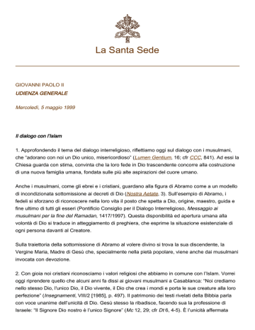 La Santa Sede GIOVANNI PAOLO II UDIENZA GENERALE Mercoledì, 5 maggio 1999 Il dialogo con l’Islam 1. Approfondendo il tema del dialogo interreligioso, riflettiamo oggi sul dialogo con i musulmani, che “adorano con noi un Dio unico, misericordioso” (Lumen Gentium, 16; cfr CCC, 841). Ad essi la Chiesa guarda con stima, convinta che la loro fede in Dio trascendente concorre alla costruzione di una nuova famiglia umana, fondata sulle più alte aspirazioni del cuore umano. Anche i musulmani, come gli ebrei e i cristiani, guardano alla figura di Abramo come a un modello di incondizionata sottomissione ai decreti di Dio (Nostra Aetate, 3). Sull’esempio di Abramo, i fedeli si sforzano di riconoscere nella loro vita il posto che spetta a Dio, origine, maestro, guida e fine ultimo di tutti gli esseri (Pontificio Consiglio per il Dialogo Interreligioso, Messaggio ai musulmani per la fine del Ramadan, 1417/1997). Questa disponibilità ed apertura umana alla volontà di Dio si traduce in atteggiamento di preghiera, che esprime la situazione esistenziale di ogni persona davanti al Creatore. Sulla traiettoria della sottomissione di Abramo al volere divino si trova la sua discendente, la Vergine Maria, Madre di Gesù che, specialmente nella pietà popolare, viene anche dai musulmani invocata con devozione. 2. Con gioia noi cristiani riconosciamo i valori religiosi che abbiamo in comune con l’Islam. Vorrei oggi riprendere quello che alcuni anni fa dissi ai giovani musulmani a Casablanca: “Noi crediamo nello stesso Dio, l'unico Dio, il Dio vivente, il Dio che crea i mondi e porta le sue creature alla loro perfezione” (Insegnamenti, VIII/2 [1985], p. 497). Il patrimonio dei testi rivelati della Bibbia parla con voce unanime dell’unicità di Dio. Gesù stesso la ribadisce, facendo sua la professione di Israele: “Il Signore Dio nostro è l’unico Signore” (Mc 12, 29; cfr Dt 6, 4-5). È l’unicità affermata 2 anche in queste parole di lode che sgorgano dal cuore dell'apostolo Paolo: “Al Re dei secoli incorruttibile, invisibile e unico Dio, onore e gloria nei secoli dei secoli. Amen” (1 Tm 1, 17). Sappiamo che alla luce della piena rivelazione in Cristo, tale unicità misteriosa non è riducibile ad un'unità numerica. Il mistero cristiano ci fa contemplare nell'unità sostanziale di Dio le persone del Padre, del Figlio e dello Spirito Santo: ciascuna in possesso dell’intera e indivisibile sostanza divina, ma una distinta dall'altra in forza della reciproca relazione. 3. Le relazioni non attenuano minimamente l'unità divina, come spiega il Concilio Lateranense IV (1215): “Ciascuna delle tre Persone è quella Realtà, cioè sostanza, essenza o natura divina . . . Essa non genera, non è generata e non procede . . .” (DS, 804). La dottrina cristiana sulla Trinità, sancita dai Concili, è esplicita nel rigetto di ogni “triteismo” o “politeismo”. In questo senso, ossia in riferimento all'unica sostanza divina, c'è una significativa corrispondenza tra Cristianesimo e Islam. Tale corrispondenza, però, non deve far dimenticare le diversità tra le due religioni. Sappiamo infatti che l’unità di Dio si esprime nel mistero delle tre divine Persone. Essendo infatti Amore (cfr 1 Gv 4, 8), Dio è da sempre Padre che si dona interamente generando il Figlio, entrambi uniti in una comunione d’amore che è lo Spirito Santo. Questa distinzione e compenetrazione (pericóresi) delle tre Persone divine non si aggiunge alla loro unità ma ne è l'espressione più profonda e caratterizzante. D’altra parte, non va dimenticato che il monoteismo trinitario tipico del cristianesimo resta un mistero inaccessibile all’umana ragione, che tuttavia è chiamata ad accettare la rivelazione dell’intima natura di Dio (cfr CCC, 237). 4. Grande segno di speranza è il dialogo interreligioso che conduce ad una più profonda conoscenza e stima dell'altro (Pontificio Consiglio per il Dialogo Interreligioso. Messaggio ai musulmani per la fine del Ramadan 1418/1998). Le due tradizioni, cristiana e musulmana, hanno una lunga storia di studio, riflessione filosofica e teologica, arte, letteratura e scienza, che ha lasciato le sue impronte nelle culture occidentali e orientali. L’adorazione verso l’unico Dio, Creatore di tutti, ci incoraggia ad intensificare in futuro la nostra reciproca conoscenza. Nel mondo di oggi, segnato tragicamente dalla dimenticanza di Dio, cristiani e musulmani sono chiamati a difendere e promuovere sempre, in uno spirito d'amore, la dignità umana, i valori morali e la libertà. Il comune pellegrinaggio verso l'eternità deve esprimersi nella preghiera, nel digiuno e nella carità, ma anche in un solidale impegno per la pace e la giustizia, per la promozione umana e la protezione dell'ambiente. Camminando insieme sulla via della riconciliazione e rinunciando nell'umile sottomissione alla volontà divina ad ogni forma di violenza come mezzo per risolvere le differenze, le due religioni potranno offrire un segno di speranza, facendo risplendere nel mondo la sapienza e la misericordia di quell'unico Dio che ha creato e governa la famiglia umana. 3 Chers frères et sœurs, J'acueille avec plaisir les francophones présents ce matin. Je salue particulièrement les pèlerins du diocèse de Port-Louis à l'Île Maurice, les Officiers de l'École nationale de la gendarmerie française, ainsi que les élèves du Collège Saint-François d'Assise de Montigny-le-Bretonneux et tous les jeunes. Que le Christ ressuscité vous garde dans sa joie et sa paix! À tous je donne de grand cœur la Bénédiction Apostolique. Dear Brothers and Sisters, Extend a special welcome to the members of the Catholic Biblical Federation who are celebrating the Federation's Thirtieth Anniversary, and I encourage you to do all you can to ensure that the inexhaustible riches of God's word become ever more truly the heart of the prayer and daily lives of Christ's faithful. Upon all the English-speaking pil