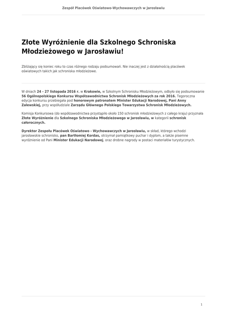 Zespół Placówek Oświatowo-Wychowawczych w Jarosławiu Złote Wyróżnienie dla Szkolnego Schroniska Młodzieżowego w Jarosławiu! Zbliżający się koniec roku to czas różnego rodzaju podsumowań. Nie inaczej jest z działalnością placówek oświatowych takich jak schroniska młodzieżowe. W dniach 24 - 27 listopada 2016 r. w Krakowie, w Szkolnym Schronisku Młodzieżowym, odbyło się podsumowanie 56 Ogólnopolskiego Konkursu Współzawodnictwa Schronisk Młodzieżowych za rok 2016. Tegoroczna edycja konkursu przebiegała pod honorowym patronatem Minister Edukacji Narodowej, Pani Anny Zalewskiej, przy współudziale Zarządu Głównego Polskiego Towarzystwa Schronisk Młodzieżowych. Komisja Konkursowa (do współzawodnictwa przystąpiło około 150 schronisk młodzieżowych z całego kraju) przyznała Złote Wyróżnienie dla Szkolnego Schroniska Młodzieżowego w Jarosławiu, w kategorii schronisk całorocznych. Dyrektor Zespołu Placówek Oświatowo - Wychowawczych w Jarosławiu, w skład, którego wchodzi jarosławskie schronisko, pan Bartłomiej Kordas, otrzymał pamiątkowy puchar i dyplom, a także pisemne wyróżnienie od Pani Minister Edukacji Narodowej, oraz drobne nagrody w postaci materiałów turystycznych. 1