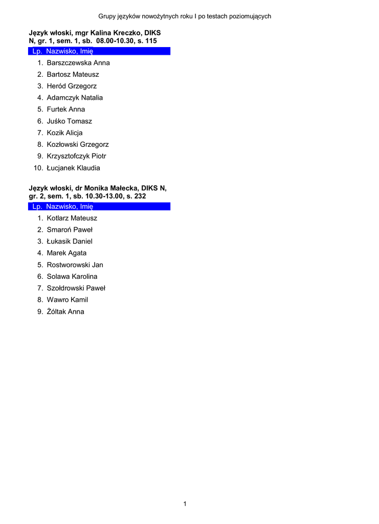 Grupy języków nowożytnych roku I po testach poziomujących Język włoski, mgr Kalina Kreczko, DIKS N, gr. 1, sem. 1, sb. 08.00-10.30, s. 115 Lp. Nazwisko, Imię 1. Barszczewska Anna 2. Bartosz Mateusz 3. Heród Grzegorz 4. Adamczyk Natalia 5. Furtek Anna 6. Juśko Tomasz 7. Kozik Alicja 8. Kozłowski Grzegorz 9. Krzysztofczyk Piotr 10. Łucjanek Klaudia Język włoski, dr Monika Małecka, DIKS N, gr. 2, sem. 1, sb. 10.30-13.00, s. 232 Lp. Nazwisko, Imię 1. Kotlarz Mateusz 2. Smaroń Paweł 3. Łukasik Daniel 4. Marek Agata 5. Rostworowski Jan 6. Solawa Karolina 7. Szołdrowski Paweł 8. Wawro Kamil 9. Żóltak Anna 1