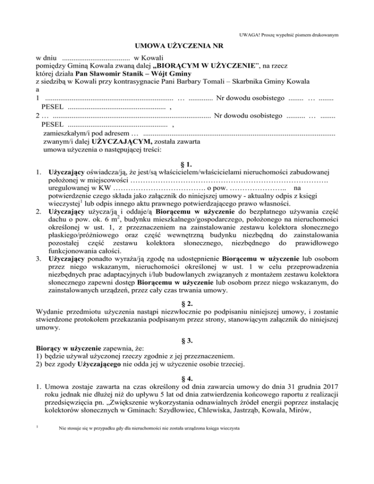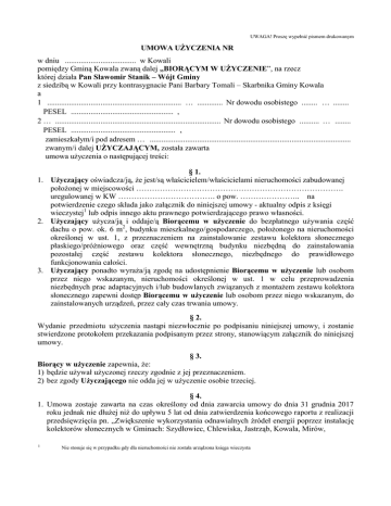UWAGA! Proszę wypełnić pismem drukowanym UMOWA UŻYCZENIA NR w dniu .................................... w Kowali pomiędzy Gminą Kowala zwaną dalej „BIORĄCYM W UŻYCZENIE”, na rzecz której działa Pan Sławomir Stanik – Wójt Gminy z siedzibą w Kowali przy kontrasygnacie Pani Barbary Tomali – Skarbnika Gminy Kowala a 1 .................................................................... … ............. Nr dowodu osobistego ........ … ........ PESEL .................................................... , 2 … .................................................................................... Nr dowodu osobistego .......... … ........ PESEL ..................................................... , zamieszkałym/i pod adresem … ...................................................................................................... zwanym/i dalej UŻYCZAJĄCYM, została zawarta umowa użyczenia o następującej treści: § 1. 1. Użyczający oświadcza/ją, że jest/są właścicielem/właścicielami nieruchomości zabudowanej położonej w miejscowości ……………………………………………………………………. uregulowanej w KW ………………………………. o pow. ………………….. na potwierdzenie czego składa jako załącznik do niniejszej umowy - aktualny odpis z księgi wieczystej1 lub odpis innego aktu prawnego potwierdzającego prawo własności. 2. Użyczający użycza/ją i oddaje/ą Biorącemu w użyczenie do bezpłatnego używania część dachu o pow. ok. 6 m2, budynku mieszkalnego/gospodarczego, położonego na nieruchomości określonej w ust. 1, z przeznaczeniem na zainstalowanie zestawu kolektora słonecznego płaskiego/próżniowego oraz część wewnętrzną budynku niezbędną do zainstalowania pozostałej część zestawu kolektora słonecznego, niezbędnego do prawidłowego funkcjonowania całości. 3. Użyczający ponadto wyraża/ją zgodę na udostępnienie Biorącemu w użyczenie lub osobom przez niego wskazanym, nieruchomości określonej w ust. 1 w celu przeprowadzenia niezbędnych prac adaptacyjnych i/lub budowlanych związanych z montażem zestawu kolektora słonecznego zapewni dostęp Biorącemu w użyczenie lub osobom przez niego wskazanym, do zainstalowanych urządzeń, przez cały czas trwania umowy. § 2. Wydanie przedmiotu użyczenia nastąpi niezwłocznie po podpisaniu niniejszej umowy, i zostanie stwierdzone protokołem przekazania podpisanym przez strony, stanowiącym załącznik do niniejszej umowy. § 3. Biorący w użyczenie zapewnia, że: 1) będzie używał użyczonej rzeczy zgodnie z jej przeznaczeniem. 2) bez zgody Użyczającego nie odda jej w użyczenie osobie trzeciej. § 4. 1. Umowa zostaje zawarta na czas określony od dnia zawarcia umowy do dnia 31 grudnia 2017 roku jednak nie dłużej niż do upływu 5 lat od dnia zatwierdzenia końcowego raportu z realizacji przedsięwzięcia pn. „Zwiększenie wykorzystania odnawialnych źródeł energii poprzez instalację kolektorów słonecznych w Gminach: Szydłowiec, Chlewiska, Jastrząb, Kowala, Mirów, 1 Nie stosuje się w przypadku gdy dla nieruchomości nie została urządzona księga wieczysta 2. Umowa użyczenia ulega rozwiązaniu ze skutkiem natychmiastowym w następujących przypadkach: 1) gdy Biorący w użyczenie nie uzyska pozytywnego wyniku na etapie oceny formalnej lub merytorycznej wniosku aplikacyjnego o dofinansowanie realizacji przedsięwzięcia pod nazwą jak w ust. 1 – złożonego w 2010 roku w ramach RPO WM Działanie 4.3 Ochrona powietrza, energetyka – obejmującego zakup i montaż zestawów kolektorów słonecznych w indywidualnych gospodarstwach domowych mieszkańców gminy, 2) gdy nie dojdzie do zawarcia umowy o dofinansowanie realizacji przedsięwzięcia pod nazwą jak w ust. 1. 3) gdy Użyczający nie złoży Biorącemu w użyczenie dokumentu, o którym mowa w § 1 ust. 1 umowy, 4) rozwiązania umowy montażu zestawu kolektora słonecznego zawartej pomiędzy tymi samymi stronami. 5) gdy Użyczający nie zawiadomi Biorącego w użyczenie o zbyciu na rzecz innej osoby lub osób nieruchomości określonej w § 1 ust. 1 umowy. 3. W przypadku wcześniejszego rozwiązania umowy przez Użyczającego, dokona on zwrotu nakładów poniesionych przez Biorącego w użyczenie na zakup i zainstalowanie zestawu kolektora słonecznego. 4. Postanowienia ust. 3 mają zastosowanie w przypadku zbycia nieruchomości, jeśli nabywca lub następca prawny nie wstąpi w prawa strony niniejszej umowy. § 5. Po zakończeniu użyczenia, Biorący w użyczenie zwróci przedmiot umowy w niepogorszonym wraz z zainstalowaną infrastrukturą, bez dodatkowego wezwania ze Użyczającego, co zostanie stwierdzone protokołem odbioru podpisanym przez obie jednakże Biorący w użyczenie nie ponosi odpowiedzialności za zużycie rzeczy następstwem prawidłowego używania. stanie strony strony, będące § 6. Wszelkie zmiany umowy mogą być dokonywane przez strony w formie pisemnej pod rygorem nieważności. § 7. Do spraw nieuregulowanych niniejszą umową zastosowane mają właściwe przepisy Kodeksu cywilnego. § 8. Umowę sporządzono w dwóch jednobrzmiących egzemplarzach, z których jeden otrzymuje Użyczający, a drugi otrzymuje Biorący w użyczenie. UŻYCZAJĄCY ………………………………… BIORĄCY W UŻYCZENIE ………………………………….. KONTRASYGNATA ………………………………… …………………………………..