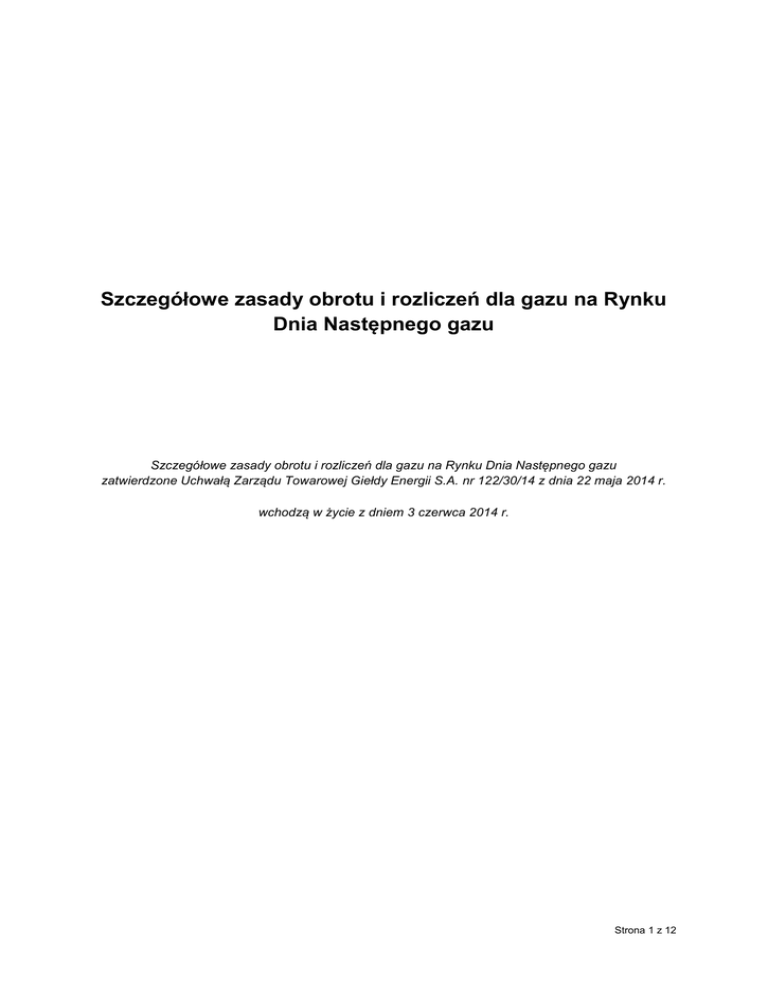 Szczegółowe zasady obrotu i rozliczeń dla gazu na Rynku Dnia Następnego gazu Szczegółowe zasady obrotu i rozliczeń dla gazu na Rynku Dnia Następnego gazu zatwierdzone Uchwałą Zarządu Towarowej Giełdy Energii S.A. nr 122/30/14 z dnia 22 maja 2014 r. wchodzą w życie z dniem 3 czerwca 2014 r. Strona 1 z 12 Rozdział 1. Definicje. 1) Członek Giełdy – podmiot posiadający status Członka Giełdy, dopuszczony przez Zarząd Giełdy do działania na RDNiBg, 2) Dzień Dostawy – odpowiada dobie gazowej w rozumieniu IRiESPg i oznacza kolejne godziny począwszy od godziny 06:00 dnia bieżącego do godziny 06:00 dnia następnego, w których gaz zakontraktowany na giełdzie w Dniu Obrotu zostanie dostarczony lub odebrany, 3) Dzień Obrotu – dzień, w którym odbywa się określenie kursów dla danego Dnia Dostawy, 4) gaz – gaz ziemny wysokometanowy grupy E, 5) giełda – Rynek Towarów Giełdowych prowadzony przez Towarową Giełdę Energii S.A. zgodnie z Regulaminem Giełdy, 6) Giełda, TGE – Towarowa Giełda Energii S.A., 7) IRiESPg – rozumie się przez to Instrukcję Ruchu i Eksploatacji Sieci Przesyłowej opracowaną przez Operatora Gazociągów Przesyłowych GAZ-SYSTEM S.A., zgodnie z art. 9 g) ustawy Prawo energetyczne, 8) Izba Rozliczeniowa – Izba Rozliczeniowa Giełd Towarowych S.A. z siedzibą w Warszawie prowadząca izbę rozliczeniową i rozrachunkową, która pełni funkcję giełdowej izby rozrachunkowej, zgodnie z ustawą o obrocie instrumentami finansowymi, 9) Kod ZUP – rozumie się przez to kod służący do identyfikacji ZUP, 10) kontrakt – umowa zawarta na RDNg pomiędzy Członkami Giełdy, w wyniku której dochodzi do przeniesienia własności gazu ze sprzedającego na kupującego, 11) kurs – jednolita cena 1 MWh gazu w danej godzinie Dnia Dostawy, określana na RDNg, 12) niepubliczna strona internetowa – strona internetowa dostępna tylko dla danego Członka Giełdy i dla Giełdy, 13) nominacja – rozumie się przez to nominację zdefiniowaną w IRiESPg, 14) Operator Systemu Przesyłowego Gazowego lub OSPg – rozumie się przez to Operatora Gazociągów Przesyłowych GAZ-SYSTEM S. A. z siedzibą w Warszawie, 15) Portfel – rozumie się przez to konto Członka Giełdy, do którego przyporządkowany jest Kod ZUP, 16) Prawo Energetyczne – ustawa z dnia 10 kwietnia 1997 r. Prawo energetyczne (j.t. Dz. U. z 2006 r. Nr 89; poz. 625; z późń. zm.), 17) przydział zdolności (PZ) - część umowy przesyłowej określająca zdolność, do której uprawniony jest ZUP w określonym punkcie wejścia lub punkcie wyjścia, 18) RDNg – wyodrębniony w ramach RDNiBg Rynek Dnia Następnego gazu, prowadzony przez Giełdę, 19) RDNiBg – Rynek Dnia Następnego i Bieżącego gazu, prowadzony przez Giełdę, 20) RTT – Rynek Terminowy Towarowy prowadzony przez Giełdę, 21) Regulamin Giełdy – Regulamin obrotu Rynku Towarów Giełdowych Towarowej Giełdy Energii S.A., 22) system informatyczny giełdy – zespół urządzeń i oprogramowania, w szczególności wyspecjalizowany program komputerowy, za pośrednictwem którego odbywa się obrót na RDNg, 23) Szczegółowe zasady obrotu i rozliczeń – niniejsze Szczegółowe zasady obrotu i rozliczeń dla gazu na Rynku Dnia Następnego gazu, Strona 2 z 12 24) transakcja – umowa sprzedaży gazu zawarta na giełdzie między Członkami Giełdy, 25) Warunki obrotu – odpowiednie Warunki obrotu dla programu instrumentów terminowych na gaz uchwalane przez Zarząd Giełdy zgodnie z § 101 ust. 3 Regulaminu Giełdy, 26) zlecenie – złożona przez Członka Giełdy oferta kupna lub sprzedaży gazu na RDNg, 27) ZUP – rozumie się przez to Zleceniodawcę Usługi Przesyłania zdefiniowanego w IRiESPg. Strona 3 z 12 Rozdział 2. Zasady obrotu. Oddział 1. Organizacja notowań na RDNg. §1. 1. Przedmiotem obrotu na RDNg jest gaz, zgodny ze standardem określonym przez Zarząd Giełdy. 2. Obrót na RDNg na instrumencie określonym w specyfikacji stanowiącej Załącznik nr 1 do Szczegółowych zasad obrotu i rozliczeń prowadzony jest na jeden dzień poprzedzający Dzień Dostawy. §2. W dobach zmiany Czasu Urzędowego w Polsce, regulowanego rozporządzeniem Prezesa Rady Ministrów w sprawie wprowadzenia i odwołania czasu letniego środkowoeuropejskiego liczba godzin w terminie wykonania kontraktu jest odpowiednio zmieniona stosownie do treści rozporządzenia (tj. 23 lub 25 godzin). Oddział 2. Harmonogram notowań na RDNg. §3. 1. Notowania odbywają się codziennie wg poniższego harmonogramu: Godziny Do 18:30 na 2 dni przed Dniem Dostawy Od 9:00 na 1 dzień przed Dniem Dostawy do 9:15 na 1 dzień przed Dniem Dostawy 9:15 na 1 dzień przed Dniem Dostawy Od 9:16 na 1 dzień przed Dniem Dostawy do 13:00 na 1 dzień przed Dniem Dostawy Do 13:00 na 1 dzień przed Dniem Dostawy Faza notowań Aktualizacja zabezpieczeń Wprowadzenie aktualnych zabezpieczeń. Faza przed notowaniami w systemie kursu jednolitego Przyjmowanie zleceń; zlecenia można usuwać i modyfikować. Zlecenia są sprawdzane ze względu na stan zabezpieczeń. Określenie Kursu Jednolitego Notowania ciągłe Przyjmowanie zleceń; zlecenia można usuwać i modyfikować; zlecenia są sprawdzane ze względu na stan zabezpieczeń. Możliwość aktualizacji w systemie rozliczeniowym wolumenów gazu przypisanych poszczególnym Kodom ZUP Do 14:00 na 1 dzień przed Dniem Dostawy Zgłaszanie transakcji handlowych do OSPg Do 17:00 na 1 dzień przed Dniem Dostawy Opublikowanie wyników notowań na publicznej stronie internetowej Oddział 3. Zlecenia na sesje RDNg. §4. Członkowie Giełdy składają zlecenia w odniesieniu do Portfeli. W systemie informatycznym giełdy Portfel jest zdefiniowany jako konto. Do Portfela przyporządkowany jest Kod ZUP. Strona 4 z 12 §5. Każdy Członek Giełdy posiada w systemie informatycznym giełdy tyle Portfeli ile posiada Kodów ZUP. Członek Giełdy może posiadać Portfele dla Kodów ZUP Udostępnionych. §6. Członek Gie
