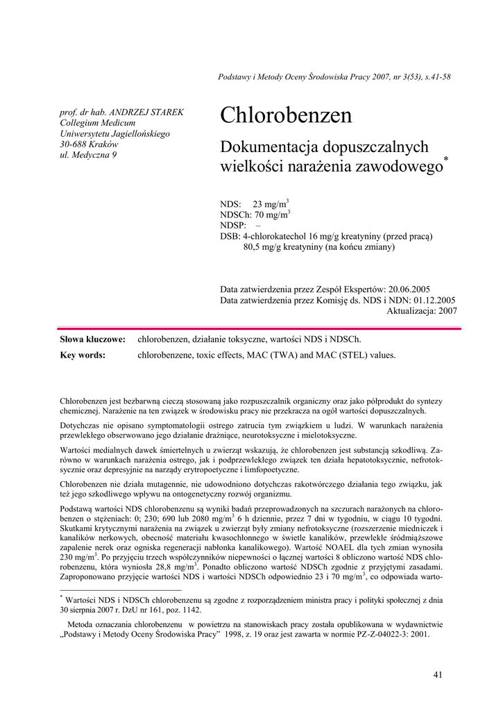Podstawy i Metody Oceny Środowiska Pracy 2007, nr 3(53), s.41-58 prof. dr hab. ANDRZEJ STAREK Collegium Medicum Uniwersytetu Jagiellońskiego 30-688 Kraków ul. Medyczna 9 Chlorobenzen Dokumentacja dopuszczalnych wielkości narażenia zawodowego* NDS: 23 mg/m3 NDSCh: 70 mg/m3 NDSP: – DSB: 4-chlorokatechol 16 mg/g kreatyniny (przed pracą) 80,5 mg/g kreatyniny (na końcu zmiany) Data zatwierdzenia przez Zespół Ekspertów: 20.06.2005 Data zatwierdzenia przez Komisję ds. NDS i NDN: 01.12.2005 Aktualizacja: 2007 Słowa kluczowe: chlorobenzen, działanie toksyczne, wartości NDS i NDSCh. Key words: chlorobenzene, toxic effects, MAC (TWA) and MAC (STEL) values. Chlorobenzen jest bezbarwną cieczą stosowaną jako rozpuszczalnik organiczny oraz jako półprodukt do syntezy chemicznej. Narażenie na ten związek w środowisku pracy nie przekracza na ogół wartości dopuszczalnych. Dotychczas nie opisano symptomatologii ostrego zatrucia tym związkiem u ludzi. W warunkach narażenia przewlekłego obserwowano jego działanie drażniące, neurotoksyczne i mielotoksyczne. Wartości medialnych dawek śmiertelnych u zwierząt wskazują, że chlorobenzen jest substancją szkodliwą. Zarówno w warunkach narażenia ostrego, jak i podprzewlekłego związek ten działa hepatotoksycznie, nefrotoksycznie oraz depresyjnie na narządy erytropoetyczne i limfopoetyczne. Chlorobenzen nie działa mutagennie, nie udowodniono dotychczas rakotwórczego działania tego związku, jak też jego szkodliwego wpływu na ontogenetyczny rozwój organizmu. Podstawą wartości NDS chlorobenzenu są wyniki badań przeprowadzonych na szczurach narażonych na chlorobenzen o stężeniach: 0; 230; 690 lub 2080 mg/m3 6 h dziennie, przez 7 dni w tygodniu, w ciągu 10 tygodni. Skutkami krytycznymi narażenia na związek u zwierząt były zmiany nefrotoksyczne (rozszerzenie miedniczek i kanalików nerkowych, obecność materiału kwasochłonnego w świetle kanalików, przewlekłe śródmiąższowe zapalenie nerek oraz ogniska regeneracji nabłonka kanalikowego). Wartość NOAEL dla tych zmian wynosiła 230 mg/m3. Po przyjęciu trzech współczynników niepewności o łącznej wartości 8 obliczono wartość NDS chlorobenzenu, która wyniosła 28,8 mg/m3. Ponadto obliczono wartość NDSCh zgodnie z przyjętymi zasadami. Zaproponowano przyjęcie wartości NDS i wartości NDSCh odpowiednio 23 i 70 mg/m 3, co odpowiada warto* Wartości NDS i NDSCh chlorobenzenu są zgodne z rozporządzeniem ministra pracy i polityki społecznej z dnia 30 sierpnia 2007 r. DzU nr 161, poz. 1142. Metoda oznaczania chlorobenzenu w powietrzu na stanowiskach pracy została opublikowana w wydawnictwie „Podstawy i Metody Oceny Środowiska Pracy” 1998, z. 19 oraz jest zawarta w normie PZ-Z-04022-3: 2001. 41 ściom normatywnym ustalonym w Unii Europejskiej. Ponadto, na podstawie dobrze udokumentowanych danych kinetycznych, zaproponowano przyjęcie wartości DSB dla 4-chlorokatecholu, głównego metabolitu chlorobenzenu, na poziomie 16 mg/g kreatyniny i 80,5 mg/g kreatyniny w moczu pobranym odpowiednio przed rozpoczęciem pracy i na końcu zmiany roboczej w dowolnym dniu tygodnia. CHARAKTERYSTYKA SUBSTANCJI, ZASTOSOWANIE, NARAŻENIE ZAWODOWE Ogólna charakterystyka substancji Ogólna charakterystyka chlorobenzenu (ACGIH 2001a; Toxicological… 1990): – wzór sumaryczny C6H5Cl – wzór strukturalny Cl – nazwa chemiczna – nazwa CAS – nunmer CAS – numer RTECS – numer indeksowy – numer WE – synonimy: chlorobenzen chlorobenzene 108-90-7 CZ0175000 602-033-00-1 203-628-5 chlorek fenylu, monochlorbenzen, chlorek benzenu, MCB i chlorobenzol. Zgodnie z rozporządzeniem ministra zdrowia z dnia 28 września 2005 r. w sprawie wykazu substancji niebezpiecznych wraz z ich klasyfikacją i oznakowaniem (DzU nr 201, poz. 1674) chlorobenzen zaklasyfikowano jako produkt łatwo palny (R10) oraz szkodliwy, który działa szkodliwie przez drogi oddechowe (Xn; R20). Właściwości fizykochemiczne substancji Właściwości fizykochemiczne chlorobenzenu (ACGIH 2001a; Patty’s… 2001; Sax’s… 2000; Merck… 2001): – postać klarowna, bezbarwna ciecz o słabym, aromatycznym zapachu – masa cząsteczkowa 112,56 – próg zapachu 1 ÷ 8 mg/m3 – temperatura topnienia -44,9 °C – temperatura krzepnięcia -55 °C – temperatura wrzenia 131 ÷ 132 °C – gęstość 1,107 (w temp. 20 °C) – prężność par 15,7 hPa (w temp. 25 ºC) – stężenie par nasyconych w powietrzu 1,55% obj. (w temp. 25 °C) – gęstość par (powietrze = 1) 3,88 – temperatura zapłonu 29,4 °C – temperatura samozapłonu 637 °C 42 – granice stężeń wybuchowych w powietrzu – wartość log oktanol/woda – rozpuszczalność – współczynniki przeliczeniowe (w temp. 25 °C, ciśn. 1013 hPa) dolna – 1,8% obj., górna – 9,6% obj. 2,84 49 mg/100 ml wody (w temp. 20 °C); rozpuszcza się w benzenie, chloroformie i eterze etylowym 1 ppm ≈ 4,7 mg/m3; 1 mg/m3 ≈ 0,22 ppm. Otrzymywanie, zastosowanie, narażenie zawodowe Chlorobenzen jest związkiem syntetycznym otrzymywanym na drodze katalitycznego chlorowania benzenu w obecności chlorku żelaza (III), chlorku glinu (III) lub chlorku cyny (IV). Produktami tej reakcji są chlorobenzen oraz dichloro- i trichlorobenzeny, które są poddawane destylacji lub krystalizacji celem wyodrębnienia chlorobenzenu (Toxcological… 1990). Chlorobenzen jest stosowany głównie jako rozpuszczalnik pestycydów w ich postaciach użytkowych, do produkcji diizocyjanianów, do odtłuszczania metalowych detali oraz do syntezy nitrochlorobenzenu. Produkcja chlorobenzenu wykazuje tendencje spadkowe. Na przykład w USA produkcja ta spadła o około 60% w 1987 r. w porównaniu z 1960 r., w którym osiągnęła maksimum (274 000 t). Było to spowodowane zaprzestaniem produkcji DDT i fenolu z chlorobenzenu jako półproduktu. Narażenie na chlorobenzen występuje podczas jego produkcji, magazynowania, konfekcjonowania i stosowania jako rozpuszczal
