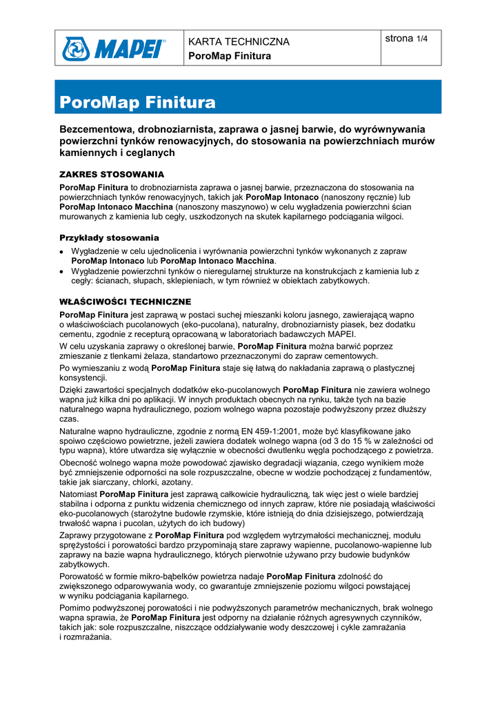 KARTA TECHNICZNA PoroMap Finitura strona 1/4 PoroMap Finitura Bezcementowa, drobnoziarnista, zaprawa o jasnej barwie, do wyrównywania powierzchni tynków renowacyjnych, do stosowania na powierzchniach murów kamiennych i ceglanych ZAKRES STOSOWANIA PoroMap Finitura to drobnoziarnista zaprawa o jasnej barwie, przeznaczona do stosowania na powierzchniach tynków renowacyjnych, takich jak PoroMap Intonaco (nanoszony ręcznie) lub PoroMap Intonaco Macchina (nanoszony maszynowo) w celu wygładzenia powierzchni ścian murowanych z kamienia lub cegły, uszkodzonych na skutek kapilarnego podciągania wilgoci. Przykłady stosowania Wygładzenie w celu ujednolicenia i wyrównania powierzchni tynków wykonanych z zapraw PoroMap Intonaco lub PoroMap Intonaco Macchina. Wygładzenie powierzchni tynków o nieregularnej strukturze na konstrukcjach z kamienia lub z cegły: ścianach, słupach, sklepieniach, w tym również w obiektach zabytkowych. WŁAŚCIWOŚCI TECHNICZNE PoroMap Finitura jest zaprawą w postaci suchej mieszanki koloru jasnego, zawierającą wapno o właściwościach pucolanowych (eko-pucolana), naturalny, drobnoziarnisty piasek, bez dodatku cementu, zgodnie z recepturą opracowaną w laboratoriach badawczych MAPEI. W celu uzyskania zaprawy o określonej barwie, PoroMap Finitura można barwić poprzez zmieszanie z tlenkami żelaza, standartowo przeznaczonymi do zapraw cementowych. Po wymieszaniu z wodą PoroMap Finitura staje się łatwą do nakładania zaprawą o plastycznej konsystencji. Dzięki zawartości specjalnych dodatków eko-pucolanowych PoroMap Finitura nie zawiera wolnego wapna już kilka dni po aplikacji. W innych produktach obecnych na rynku, także tych na bazie naturalnego wapna hydraulicznego, poziom wolnego wapna pozostaje podwyższony przez dłuższy czas. Naturalne wapno hydrauliczne, zgodnie z normą EN 459-1:2001, może być klasyfikowane jako spoiwo częściowo powietrzne, jeżeli zawiera dodatek wolnego wapna (od 3 do 15 % w zależności od typu wapna), które utwardza się wyłącznie w obecności dwutlenku węgla pochodzącego z powietrza. Obecność wolnego wapna może powodować zjawisko degradacji wiązania, czego wynikiem może być zmniejszenie odporności na sole rozpuszczalne, obecne w wodzie pochodzącej z fundamentów, takie jak siarczany, chlorki, azotany. Natomiast PoroMap Finitura jest zaprawą całkowicie hydrauliczną, tak więc jest o wiele bardziej stabilna i odporna z punktu widzenia chemicznego od innych zapraw, które nie posiadają właściwości eko-pucolanowych (starożytne budowle rzymskie, które istnieją do dnia dzisiejszego, potwierdzają trwałość wapna i pucolan, użytych do ich budowy) Zaprawy przygotowane z PoroMap Finitura pod względem wytrzymałości mechanicznej, modułu sprężystości i porowatości bardzo przypominają stare zaprawy wapienne, pucolanowo-wapienne lub zaprawy na bazie wapna hydraulicznego, których pierwotnie używano przy budowie budynków zabytkowych. Porowatość w formie mikro-bąbelków powietrza nadaje PoroMap Finitura zdolność do zwiększonego odparowywania wody, co gwarantuje zmniejszenie poziomu wilgoci powstającej w wyniku podciągania kapilarnego. Pomimo podwyższonej porowatości i nie podwyższonych parametrów mechanicznych, brak wolnego wapna sprawia, że PoroMap Finitura jest odporny na działanie różnych agresywnych czynników, takich jak: sole rozpuszczalne, niszczące oddziaływanie wody deszczowej i cykle zamrażania i rozmrażania. KARTA TECHNICZNA PoroMap Finitura strona 2/4 Zastosowanie PoroMap Finitura jest jednak zalecane w przypadku murów narażonych na silne podciąganie wilgoci. Nie należy zbyt mocno zacierać powierzchni świeżo nałożonej zaprawy, ponieważ może to ograniczyć paroprzepuszczalność zaprawy. ZALECENIA Nie używać PoroMap Finitura do konsolidacji konstrukcji murowych lub tynków (stosować MapeAntique I lub Mape-Antique F 21) Nie należy stosować PoroMap Finitura jako warstwy do wygładzania tynków o bardzo grubej teksturze. Do PoroMap Finitura nie dodawać żadnych dodatków, cementu ani innych spoiw (wapna lub gipsu). Powierzchni wykonanej z PoroMap Finitura nie należy pokrywać farbami, które mogłyby utrudnić dyfuzję pary wodnej (zastosować powłoki z wyrobów Silexcolor Pittura, Silexcolor Tonachino lub Silexcolor Marmorino, lub też preparat hydrofobizujący na bazie siloksanów Antipluviol S). Nie aplikować PoroMap Finitura w temperaturze niższej niż +5°C. PoroMap Finitura nakładać wyłącznie na odpowiednio oczyszczone powierzchnie. WYTYCZNE STOSOWANIA Przygotowanie podłoża Powierzchnię podłoża należy zwilżyć wodą do stanu nasycenia, pozostawiając nadmiar wody do odparowania. PoroMap Finitura można stosować również na świeżo nałożonym tynku, zanim wyprawa tynkarska zacznie wiązać (metoda mokre na mokre). Przygotowanie zaprawy PoroMap Finitura należy przygotować w normalnej betoniarce. Po wlaniu do niej wymaganej ilości wody (około 5,75 litra na każdy worek suchej zaprawy. Mieszać przez 3 minuty do uzyskania jednorodnej gładkiej masy bez grudek, upewniając się że na dnie i bokach betoniarki nie pozostały żadne pozostałości zaprawy. Jeżeli to konieczne do zaprawy można dodać więcej wody, tak aby nie przekroczyć całkowitej ilości 6 l na worek, a następnie mieszać przez kolejne 3 minuty. Aplikacja zaprawy Zaprawę należy nakładać w cienkich warstwach gładką pacą stalową. Wykończenie powierzchni Po nałożeniu warstwy zaprawy zaleca się wygładzenie powierzchni płaska paca lub pacą z gąbką, zanim zaprawa zacznie wiązać. Nie zaleca się stosowania PoroMap Finitura jeżeli podłoże jest niezabezpieczone przed kapilarnym podciąganiem wilgoci. W tym przypadku zalecane jest stosowanie powłok z Silexcolor Tonachino lub Silexcolor Marmorino - wypraw tynkarskich na bazie silikatów, występujących w szerokiej gamie kolorów, barwionych w systemie koloryzacji Mapei ColorMap. Warstw