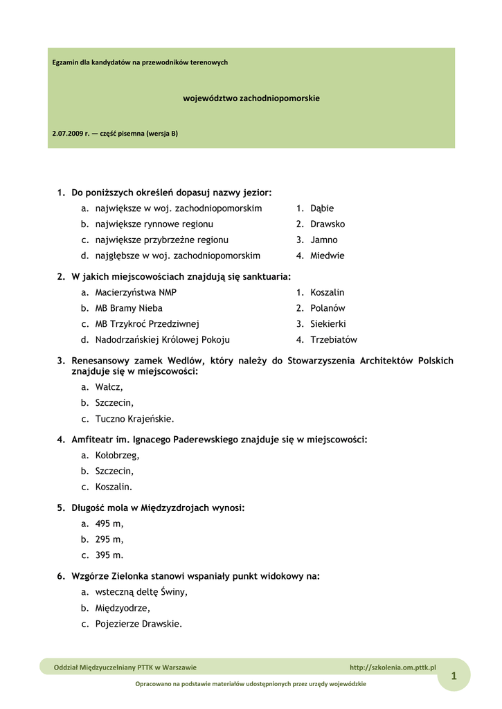 Egzamin dla kandydatów na przewodników terenowych województwo zachodniopomorskie 2.07.2009 r. — część pisemna (wersja B) 1. Do poniższych określeń dopasuj nazwy jezior: a. największe w woj. zachodniopomorskim 1. Dąbie b. największe rynnowe regionu 2. Drawsko c. największe przybrzeżne regionu 3. Jamno d. najgłębsze w woj. zachodniopomorskim 4. Miedwie 2. W jakich miejscowościach znajdują się sanktuaria: a. Macierzyństwa NMP 1. Koszalin b. MB Bramy Nieba 2. Polanów c. MB Trzykroć Przedziwnej 3. Siekierki d. Nadodrzańskiej Królowej Pokoju 4. Trzebiatów 3. Renesansowy zamek Wedlów, który należy do Stowarzyszenia Architektów Polskich znajduje się w miejscowości: a. Wałcz, b. Szczecin, c. Tuczno Krajeńskie. 4. Amfiteatr im. Ignacego Paderewskiego znajduje się w miejscowości: a. Kołobrzeg, b. Szczecin, c. Koszalin. 5. Długość mola w Międzyzdrojach wynosi: a. 495 m, b. 295 m, c. 395 m. 6. Wzgórze Zielonka stanowi wspaniały punkt widokowy na: a. wsteczną deltę Świny, b. Międzyodrze, c. Pojezierze Drawskie. Oddział Międzyuczelniany PTTK w Warszawie http://szkolenia.om.pttk.pl Opracowano na podstawie materiałów udostępnionych przez urzędy wojewódzkie 1 2.07.2009 Egzamin dla kandydatów na przewodników terenowych — województwo zachodniopomorskie 7. Jaka rzeka przepływa przez Stargard Szczeciński: a. Drawa, b. Ina, c. Rega. 8. Miejscowość wypoczynkowa Dąbki leży nad jeziorem: a. Jamno, b. Bukowo, c. Kopań. 9. Żywnik to kaszubska nazwa: a. kutra rybackiego, b. silnego wiatru, c. sołtysa. 10. Długość toru wodnego między portami w Świnoujściu i w Szczecinie wynosi: a. około 100 km, b. około 65 km, c. około 88 km. 11. W jakich miejscowościach regionu odbywają się festyny: a. Bitwa o Krowę 1. Białogard/Świdwin b. Festiwal Wikingów 2. Koszalin c. Smaki Świata 3. Trzebiatów d. Święto Kaszy 4. Wolin 12. Muzeum Oręża Polskiego znajduje się w: a. Kołobrzegu, b. Koszalinie, c. Karlinie. 13. Największe w Europie złoża ropy naftowej znajdują się w gminie: a. Dębno, b. Myślibórz, c. Chojna. 14. Skansen Kolejki Wąskotorowej znajduje się w: a. Rymaniu, b. Koszalinie, c. Gryficach. 15. Siedzibą pierwszego biskupa Pomorza był: a. Wolin, 2 http://szkolenia.om.pttk.pl Oddział Międzyuczelniany PTTK w Warszawie Opracowano na podstawie materiałów udostępnionych przez urzędy wojewódzkie Egzamin dla kandydatów na przewodników terenowych — województwo zachodniopomorskie 2.07.2009 b. Szczecin, c. Kamień Pomorski. 16. Królewski Głaz, jeden z największych w naszym województwie znajduje się w wodach: a. Zalewu Szczecińskiego, b. Zalewu Kamieńskiego, c. Jeziora Dąbie. 17. Góra Czcibora znajduje się w pobliżu: a. Koszalina, b. Świnoujścia, c. Cedyni. 18. Powierzchnia Wolińskiego Parku Narodowego wynosi około: a. 18 tys. ha, b. 11 tys. ha, c. 15 tys. ha. 19. Rezerwat archeologiczny „Kamienne Kręgi” znajduje się w miejscowości: a. Kościeżnica, b. Grzybnica, c. Mostowo. 20. Rycerz w srebrnej zbroi na białym koniu, w lewej ręce trzyma tarczę czerwoną z białym orłem piastowskim, w prawej ręce biały proporzec z gryfem – to herb: a. Koszalina, b. Kołobrzegu, c. Szczecina. 21. Koszalin leży nad rzeką: a. Regą, b. Parsętą, c. Dzierżęcinką. 22. Zabytkowa studzienka, jeden z obiektów zwiedzanych w Pyrzycach, związana jest ze: a. św. Wojciechem, b. św. Ottonem, c. św. Kazimierzem. 23. Kaplica św. Ducha, w której w XVI w. zapadła decyzja o wprowadzeniu reformacji na Pomorzu Zachodnim znajduje się w: a. Kamieniu Pomorskim, b. Pyrzycach, c. Trzebiatowie. Oddział Międzyuczelniany PTTK w Warszawie http://szkolenia.om.pttk.pl.pl Opracowano na podstawie materiałów udostępnionych przez urzędy wojewódzkie 3 2.07.2009 Egzamin dla kandydatów na przewodników terenowych — województwo zachodniopomorskie 24. Jak nazywa się kanał w Świnoujściu, przekopany w latach 1875-80 przez wyspę Uznam, którym przepływają statki płynące do Szczecina: a. Kanał Piastowski, b. Kanał Pomorski, c. Świna. 25. Pęzino znane jest ze znajdującego się tam: a. zamku, b. ośrodka doradztwa rolniczego, c. masztu TV. 26. Który rok zapoczątkował chrystianizację Pomorza Zachodniego: a. 1024, b. 1124, c. 1224. 27. Kirkut to: a. cmentarz żydowski, b. kaplica muzułmańska, c. cerkiew starokatolicka. 28. Proszę połączyć w pary odpowiednie miasto i jezioro: a. Szczecinek 1. jez. Drawsko b. Mielno 2. jez. Trzesiecko c. Borne Sulinowo 3. jez. Jamno d. Czaplinek 4. jez. Pile 29. Dyrekcja Wolińskiego Parku Narodowego znajduje się w: a. Wolinie, b. Świnoujściu, c. Międzyzdrojach. 30. Jedna z najwyższych latarni morskich na świecie znajduje się w: a. Kołobrzegu, b. Niechorzu, c. Świnoujściu. 4 http://szkolenia.om.pttk.pl Oddział Międzyuczelniany PTTK w Warszawie Opracowano na podstawie materiałów udostępnionych przez urzędy wojewódzkie