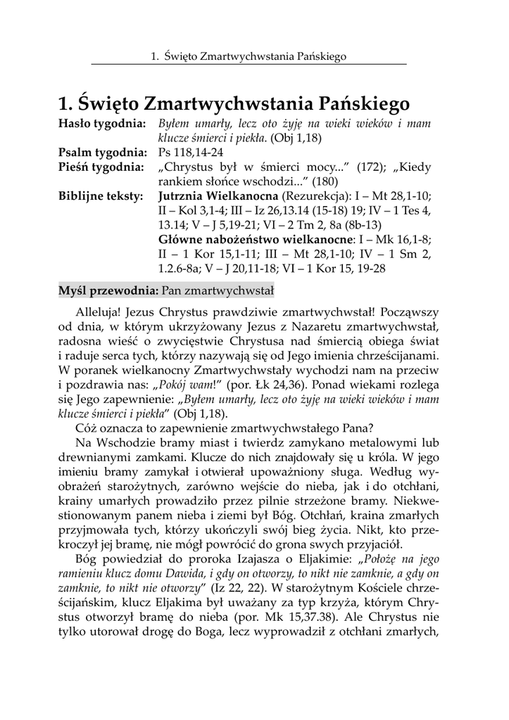 1. Święto Zmartwychwstania Pańskiego 1. Święto Zmartwychwstania Pańskiego Hasło tygodnia: Byłem umarły, lecz oto żyję na wieki wieków i mam klucze śmierci i piekła. (Obj 1,18) Psalm tygodnia: Ps 118,14-24 Pieśń tygodnia: „Chrystus był w śmierci mocy...” (172); „Kiedy rankiem słońce wschodzi...” (180) Biblijne teksty: Jutrznia Wielkanocna (Rezurekcja): I – Mt 28,1-10; II – Kol 3,1-4; III – Iz 26,13.14 (15-18) 19; IV – 1 Tes 4, 13.14; V – J 5,19-21; VI – 2 Tm 2, 8a (8b-13) Główne nabożeństwo wielkanocne: I – Mk 16,1-8; II – 1 Kor 15,1-11; III – Mt 28,1-10; IV – 1 Sm 2, 1.2.6-8a; V – J 20,11-18; VI – 1 Kor 15, 19-28 Myśl przewodnia: Pan zmartwychwstał Alleluja! Jezus Chrystus prawdziwie zmartwychwstał! Począwszy od dnia, w którym ukrzyżowany Jezus z Nazaretu zmartwychwstał, radosna wieść o zwycięstwie Chrystusa nad śmiercią obiega świat i raduje serca tych, którzy nazywają się od Jego imienia chrześcijanami. W poranek wielkanocny Zmartwychwstały wychodzi nam na przeciw i pozdrawia nas: „Pokój wam!” (por. Łk 24,36). Ponad wiekami rozlega się Jego zapewnienie: „Byłem umarły, lecz oto żyję na wieki wieków i mam klucze śmierci i piekła” (Obj 1,18). Cóż oznacza to zapewnienie zmartwychwstałego Pana? Na Wschodzie bramy miast i twierdz zamykano metalowymi lub drewnianymi zamkami. Klucze do nich znajdowały się u króla. W jego imieniu bramy zamykał i otwierał upoważniony sługa. Według wyobrażeń starożytnych, zarówno wejście do nieba, jak i do otchłani, krainy umarłych prowadziło przez pilnie strzeżone bramy. Niekwestionowanym panem nieba i ziemi był Bóg. Otchłań, kraina zmarłych przyjmowała tych, którzy ukończyli swój bieg życia. Nikt, kto przekroczył jej bramę, nie mógł powrócić do grona swych przyjaciół. Bóg powiedział do proroka Izajasza o Eljakimie: „Położę na jego ramieniu klucz domu Dawida, i gdy on otworzy, to nikt nie zamknie, a gdy on zamknie, to nikt nie otworzy” (Iz 22, 22). W starożytnym Kościele chrześcijańskim, klucz Eljakima był uważany za typ krzyża, którym Chrystus otworzył bramę do nieba (por. Mk 15,37.38). Ale Chrystus nie tylko utorował drogę do Boga, lecz wyprowadził z otchłani zmarłych, 1. Święto Zmartwychwstania Pańskiego którzy pod panowaniem prawa ulegli mocy śmierci (Mt 27,51-53). Chrystus zatriumfował nad śmiercią. Słowa zmartwychwstałego i wywyższonego Jezusa Chrystusa: „Byłem umarły, lecz oto żyję na wieki wieków i mam klucze śmierci i piekła” znaczą, że Bóg w Jego ręce złożył władzę nad śmiercią i piekłem, a więc otchłanią, krainą zmarłych, gdyż takie jest znaczenie greckiego słowa hades, znajdującego się na kartach ksiąg Nowego Przymierza. Poselstwo o zmartwychwstaniu Jezusa Chrystusa, ukrzyżowanego Syna Bożego, dominuje nad wszelkim świadectwem o Jezusie w Nowym Testamencie. Wiara w zmartwychwstanie Chrystusa przenika wszystkie warstwy apostolskiego zwiastowania o zbawczym dziele Syna Bożego. Bez tej wiary nie byłoby chrześcijaństwa. Apostoł Paweł pisał do Koryntian: „Jeśli Chrystus nie został wzbudzony, daremna jest wiara wasza; jesteście jeszcze w grzechach swoich” (1 Kor 15, 17). Dlatego w tradycji ewangelicznej ważne miejsce zajmują świadectwa o zmartwychwstaniu Jezusa. Różnice pomiędzy poszczególnymi relacjami ewangelistów świadczą o rozpowszechnieniu ewangelicznej tradycji o pustym grobie Jezusa i zjawieniach Zmartwychwstałego. Ewangeliści korzystali niewątpliwie z różnych źródeł tej żywej tradycji, ukształtowanej w Kościele Bożym w Jerozolimie dla potrzeb duszpasterskich i apologetycznych. Nic nie jest tak pewne jak wiara w zmartwychwstanie Chrystusa Pana. Fenomenu tej wiary nie da się wytłumaczyć racjonalnie. U jej podstawy znajdują się przeżycia uczniów Jezusa, ich doświadczenie obcowania z Panem po Jego ukrzyżowaniu. Chrześcijańska wiara jest spotykaniem ze zmartwychwstałym Panem. Chrystus staje na drodze naszego życia i pozdrawia nas: „Pokój wam!”. On żyje i nie możemy o Nim myśleć jedynie jako o postaci z przeszłości. Myśleć o Nim, o Jego słowach i czynach wyłącznie jako o historycznym wydarzeniu, znaczy szukać go w grobie historii. w poranek wielkanocny Anioł powiedział do kobiet: „Jezusa szukacie Nazareńskiego, ukrzyżowanego; wstał z martwych, nie ma go tu, oto miejsce gdzie go złożono” (Mk 16,6; por. Łk 24,5.6). Zwycięstwo Jezusa Chrystusa nad śmiercią jest także naszym triumfem nad ciemnością grobu. Syn Boży wcielił się w nasze ludzkie ciało, został ukrzyżowany rękami grzeszników i wzbudzony z martwych przez chwałę Ojca dla naszego zbawienia. Chrystus przez swoją śmierć i zmartwychwstanie wyjednał nam wieczne życie. Pusty grób Ukrzyżowanego jest przeto zapowiedzią naszego zwycięstwa nad śmiercią. Moc śmierci została złamana. Wiara w zmartwychwstanie 1. Święto Zmartwychwstania Pańskiego Chrystusa – to równocześnie wiara w powszechne zmartwychwstanie. Apostoł Paweł pisał do Koryntian wątpiących w zmartwychwstanie ciała: „A jeśli się o Chrystusie opowiada, że został z martwych wzbudzony, jakże mogą mówić niektórzy między wami, że zmartwychwstania nie ma? Bo jeśli nie ma zmartwychwstania to i Chrystus nie został wzbudzony ... Zatem i ci, którzy zasnęli w Chrystusie, poginęli. Jeśli tylko w tym życiu pokładamy nadzieję w Chrystusie, jesteśmy ze wszystkich ludzi najbardziej pożałowania godni. A jednak Chrystus został wzbudzony z martwych i jest pierwiastkiem tych, którzy zasnęli” (1 Kor 15, 12.13.18-20). „Jezus żyje! Z Nim i Ja! Śmierci, gdzież twej grozy cienie? Jezus żyje, więc mi da Zmartwychwstanie i zbawienie! Do Swej chwały przyjmie mnie W tej nadziei wytrwać chcę”. *** „Jezus Chrystus powstał z umarłych i z tym złączona jest mocna, pewna wiara, w której umacnia i utwierdza nas ten artyku