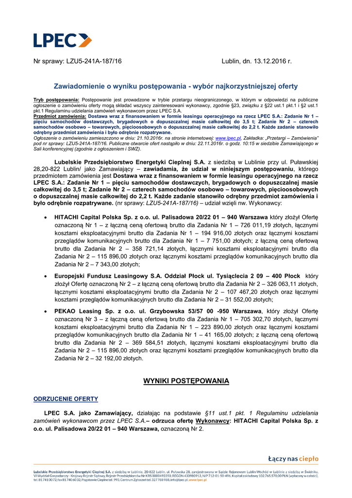 Nr sprawy: LZU5-241A-187/16 Lublin, dn. 13.12.2016 r. Zawiadomienie o wyniku postępowania - wybór najkorzystniejszej oferty Tryb postępowania: Postępowanie jest prowadzone w trybie przetargu nieograniczonego, w którym w odpowiedzi na publiczne ogłoszenie o zamówieniu oferty mogą składać wszyscy zainteresowani wykonawcy, zgodnie §23, związku z §22 ust.1 pkt.1 i §2 ust.1 pkt.1 Regulaminu udzielania zamówień wykonawcom przez LPEC S.A. Przedmiot zamówienia: Dostawa wraz z finansowaniem w formie leasingu operacyjnego na rzecz LPEC S.A.: Zadanie Nr 1 – pięciu samochodów dostawczych, brygadowych o dopuszczalnej masie całkowitej do 3,5 t; Zadanie Nr 2 – czterech samochodów osobowo – towarowych, pięcioosobowych o dopuszczalnej masie całkowitej do 2,2 t. Każde zadanie stanowiło odrębny przedmiot zamówienia i było odrębnie rozpatrywane. Ogłoszenie o zamówieniu zamieszczono w dniu: 21.10.2016r. na stronie internetowej: www.lpec.pl, Zakładka: „Przetargi – Zamówienia” pod nr sprawy: LZU5-241A-187/16. Publiczne otwarcie ofert nastąpiło w dniu: 22.11.2016r. o godz. 10:15 w siedzibie Zamawiającego w Sali konferencyjnej (zgodnie z ogłoszeniem i SWZ). Lubelskie Przedsiębiorstwo Energetyki Cieplnej S.A. z siedzibą w Lublinie przy ul. Puławskiej 28,20-822 Lublin/ jako Zamawiający – zawiadamia, że udział w niniejszym postępowaniu, którego przedmiotem zamówienia jest Dostawa wraz z finansowaniem w formie leasingu operacyjnego na rzecz LPEC S.A.: Zadanie Nr 1 – pięciu samochodów dostawczych, brygadowych o dopuszczalnej masie całkowitej do 3,5 t; Zadanie Nr 2 – czterech samochodów osobowo – towarowych, pięcioosobowych o dopuszczalnej masie całkowitej do 2,2 t. Każde zadanie stanowiło odrębny przedmiot zamówienia i było odrębnie rozpatrywane. (nr sprawy: LZU5-241A-187/16) – udział wzięli nw. Wykonawcy: HITACHI Capital Polska Sp. z o.o. ul. Palisadowa 20/22 01 – 940 Warszawa który złożył Ofertę oznaczoną Nr 1 – z łączną ceną ofertową brutto dla Zadania Nr 1 – 726 011,19 złotych, łącznymi kosztami eksploatacyjnymi brutto dla Zadania Nr 1 – 194 916,00 złotych oraz łącznymi kosztami przeglądów komunikacyjnych brutto dla Zadania Nr 1 – 7 751,00 złotych; z łączną ceną ofertową brutto dla Zadania Nr 2 – 358 721,14 złotych, łącznymi kosztami eksploatacyjnymi brutto dla Zadania Nr 2 – 115 896,00 złotych oraz łącznymi kosztami przeglądów komunikacyjnych brutto dla Zadania Nr 2 – 7 343,00 złotych; Europejski Fundusz Leasingowy S.A. Oddział Płock ul. Tysiąclecia 2 09 – 400 Płock który złożył Ofertę oznaczoną Nr 2 – z łączną ceną ofertową brutto dla Zadania Nr 2 – 326 063,11 złotych, łącznymi kosztami eksploatacyjnymi brutto dla Zadania Nr 2 – 107 467,20 złotych oraz łącznymi kosztami przeglądów komunikacyjnych brutto dla Zadania Nr 2 – 31 552,00 złotych; PEKAO Leasing Sp. z o.o. ul. Grzybowska 53/57 00 -950 Warszawa, który złożył Ofertę oznaczoną Nr 3 – z łączną ceną ofertową brutto dla Zadania Nr 1 – 705 302,70 złotych, łącznymi kosztami eksploatacyjnymi brutto dla Zadania Nr 1 – 223 890,00 złotych oraz łącznymi kosztami przeglądów komunikacyjnych brutto dla Zadania Nr 1 – 41 165,00 złotych; z łączną ceną ofertową brutto dla Zadania Nr 2 – 369 584,51 złotych, łącznymi kosztami eksploatacyjnymi brutto dla Zadania Nr 2 – 115 896,00 złotych oraz łącznymi kosztami przeglądów komunikacyjnych brutto dla Zadania Nr 2 – 32 192,00 złotych. WYNIKI POSTĘPOWANIA ODRZUCENIE OFERTY LPEC S.A. jako Zamawiający, działając na podstawie §11 ust.1 pkt. 1 Regulaminu udzielania zamówień wykonawcom przez LPEC S.A.– odrzuca ofertę Wykonawcy: HITACHI Capital Polska Sp. z o.o. ul. Palisadowa 20/22 01 – 940 Warszawa, oznaczoną Nr 2. Uzasadnienie prawne: Oferta Wykonawcy podlega odrzuceniu zgodnie z §11 ust.1 pkt. 1 Regulaminu udzielania zamówień wykonawcom przez LPEC S.A., cyt.: „Zamawiający odrzuci ofertę, jeżeli jej treść nie odpowiada treści SWZ, z zastrzeżeniem §10 ust. 2 pkt. 3”. Uzasadnienie faktyczne: Wykonawca HITACHI Capital Polska Sp. z o.o. ul. Palisadowa 20/22 01 – 940 Warszawa został wezwany do wyjaśnienia treści oferty, gdyż dla Zadania Nr 1 w tabeli Koszty przeglądów komunikacyjnych zgodnie z Częścią XII SWZ w poz. Razem koszty przeglądów Wykonawca podał kwotę 7 751,00 złotych brutto. Zamawiający zwrócił się z prośbą o wyjaśnienie czy Wykonawca podał ww. koszty dla pięciu samochodów. Poza tym dla Zadania Nr 2 w tabeli Koszty przeglądów komunikacyjnych zgodnie z Częścią XII SWZ w poz. Razem koszty przeglądów Wykonawca podał kwotę 7 343,00 złotych brutto. Zamawiający zwrócił się z prośbą o wyjaśnienie czy Wykonawca podał ww. koszty dla czterech samochodów. Termin złożenia wyjaśnień, jaki wyznaczono Wykonawcy – do dnia 25.11.2016 r. do godz. 10.00. W odpowiedzi na wezwanie do wyjaśnienia treści oferty Wykonawca w terminie ponownie złożył formularz ofertowy, w którym poprawił wartości, co do których był wzywany odpowiednio przemnażając je przez 5 – dla Zadania nr 1 oraz przez 4 – dla Zadania nr 2. A zatem kwoty przeglądów komunikacyjnych dla Zadania Nr 1 i Zadania Nr 2 w złożonej w terminie ofercie zostały podane dla jednego samochodu, a nie jak wymagał Zamawiający dla pięciu dla Zadania Nr 1 i czterech dla Zadania Nr 2. W związku z tym oferta ww. Wykonawcy jest niezgodna z treścią SWZ. Wobec powyższego Oferta Nr 2 nie spełnia warunków SWZ, jest nieważna i podlega odrzuceniu zgodnie z Częścią VII ust. 7 pkt. 1 SWZ w związku z §11 ust. 1 pkt. 1 Regulaminu udzielania zamówień wykonawcom przez LPEC S.A. WYBÓR OFERTY NAJKORZYSTNIEJSZEJ Jednocześnie LPEC S.A. jako Zamawiający zawiadamia, że w wyniku przeprowadzonego postępowania przetargowego dotyczącego niniejszego zamówienia dokonano wyboru oferty najkorzystnie