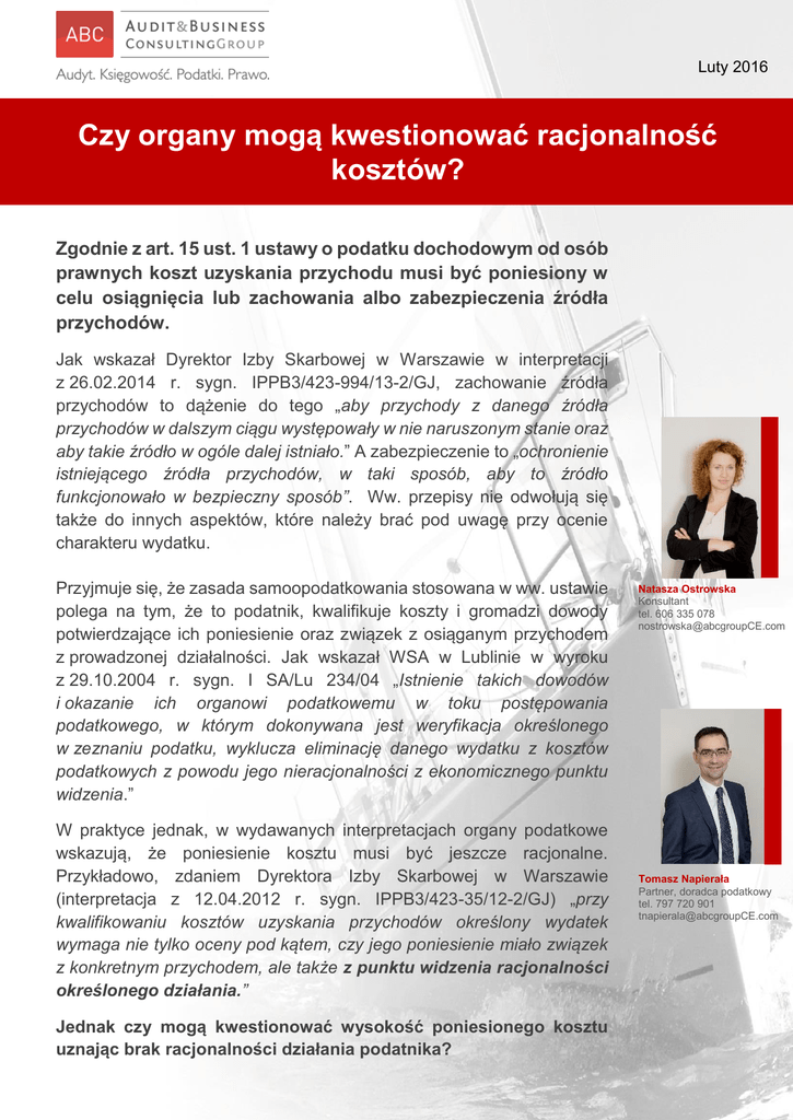 Luty 2016 Czy organy mogą kwestionować racjonalność kosztów? Zgodnie z art. 15 ust. 1 ustawy o podatku dochodowym od osób prawnych koszt uzyskania przychodu musi być poniesiony w celu osiągnięcia lub zachowania albo zabezpieczenia źródła przychodów. Jak wskazał Dyrektor Izby Skarbowej w Warszawie w interpretacji z 26.02.2014 r. sygn. IPPB3/423-994/13-2/GJ, zachowanie źródła przychodów to dążenie do tego „aby przychody z danego źródła przychodów w dalszym ciągu występowały w nie naruszonym stanie oraz aby takie źródło w ogóle dalej istniało.” A zabezpieczenie to „ochronienie istniejącego źródła przychodów, w taki sposób, aby to źródło funkcjonowało w bezpieczny sposób”. Ww. przepisy nie odwołują się także do innych aspektów, które należy brać pod uwagę przy ocenie charakteru wydatku. Przyjmuje się, że zasada samoopodatkowania stosowana w ww. ustawie polega na tym, że to podatnik, kwalifikuje koszty i gromadzi dowody potwierdzające ich poniesienie oraz związek z osiąganym przychodem z prowadzonej działalności. Jak wskazał WSA w Lublinie w wyroku z 29.10.2004 r. sygn. I SA/Lu 234/04 „Istnienie takich dowodów i okazanie ich organowi podatkowemu w toku postępowania podatkowego, w którym dokonywana jest weryfikacja określonego w zeznaniu podatku, wyklucza eliminację danego wydatku z kosztów podatkowych z powodu jego nieracjonalności z ekonomicznego punktu widzenia.” W praktyce jednak, w wydawanych interpretacjach organy podatkowe wskazują, że poniesienie kosztu musi być jeszcze racjonalne. Przykładowo, zdaniem Dyrektora Izby Skarbowej w Warszawie (interpretacja z 12.04.2012 r. sygn. IPPB3/423-35/12-2/GJ) „przy kwalifikowaniu kosztów uzyskania przychodów określony wydatek wymaga nie tylko oceny pod kątem, czy jego poniesienie miało związek z konkretnym przychodem, ale także z punktu widzenia racjonalności określonego działania.” Jednak czy mogą kwestionować wysokość poniesionego kosztu uznając brak racjonalności działania podatnika? Natasza Ostrowska Konsultant tel. 606 335 078 [email protected] Tomasz Napierała Partner, doradca podatkowy tel. 797 720 901 [email protected] Zgodnie z przepisami Ordynacji podatkowej (art. 120 i 122), organy podatkowe działają w oparciu o przepisy prawa podatkowego, zaś w toku postępowania podatkowego zobowiązane są podejmować wszelkie niezbędne działania w celu dokładnego wyjaśnienia stanu faktycznego oraz załatwienia sprawy w postępowaniu podatkowym. Przepisy ww. ustawy nie skutkują jednak uprawnieniem do kwestionowania przez organy podatkowe wysokości kosztów z uwagi na uznanie działania podatnika za nieracjonalne. Prawo takie nie wynika także bezpośrednio z ww. brzmienia art. 15 ustawy o CIT. Przeciwnie, WSA w Warszawie w jednym z wyroków (wyrok z 23.7.2004 r. sygn. III 949/03) wyraźnie wskazał, że „art. 15 ustawy o podatku dochodowym od osób prawnych nie daje podstawy do oceny racjonalności wydatków” (podobnie WSA w Olsztynie w wyroku z 21.08.2008 r., sygn. akt I SA/Ol 273/08). Otoczenie gospodarcze i sytuacja przedsiębiorców podlega ciągłym zmianom. Świetnie rokująca inwestycja, może zamienić się w stratę dla inwestora, a poniesienie dodatkowych kosztów mieć na celu zabezpieczenie przed dalszą utratą przychodów (np. rozwiązanie nierentownej umowy najmu i zapłata kary umownej). Takich sytuacji podatnik zazwyczaj nie może przewidzieć, a organ podatkowy nie powinien traktować tego typu sytuacji za przejaw braku gospodarności podatnika. Orzecznictwo sądów administracyjnych wspiera ww. podejście zgodnie z którym „O celowości ponoszenia wydatków, związanych z prowadzoną działalnością gospodarczą (…) decyduje podmiot prowadzący działalność gospodarczą, a nie organ podatkowy.” (Wyrok WSA w Warszawie z 23.07.2004r. sygn. II SA 949/03, oraz z 2.06.2011 r., III SA/Wa 2593/10). W razie sporu z organem podatkowym, warto odwołać się do argumentów NSA przedstawionych w wyroku z 17.01.2012 roku, sygn. akt II FSK 1365/10, iż „(...) gospodarczo uzasadnione i racjonalne decyzje gospodarcze, podejmowane pierwotnie w określonych warunkach, mające oczywisty związek z przychodami, w związku z negatywną zmianą okoliczności mogą wywołać lub wywołują konieczność podejmowania przez podatnika działań zmierzających już nie do osiągnięcia przychodów, ale do zachowania lub zabezpieczenia źródeł przychodów.” ABC Tax Sp. z o.o., Spółka doradztwa podatkowego www.abcgroupCE.com Poznań, ul. Paderewskiego 6/7 Łódź, Al. Kościuszki 103 Audit & Business Consulting Group tworzą: tel. +48 61 852 58 45, fax +48 61 853 50 20, e-mail: [email protected] ABC Tax Sp. z o.o. ABC Audit Sp. z o.o. ABC Accounting Sp. z o.o. Śron&Łakomecki Kancelaria Prawnicza s.c. Kapitał zakładowy 50.000 PLN Sąd Rejonowy Poznań Nowe Miasto i Wilda w Poznaniu, VIII Wydział Gospodarczy: 0000335640