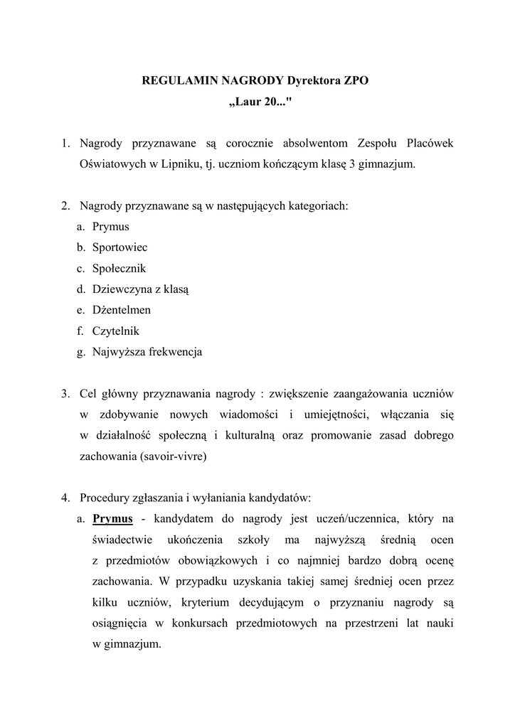 REGULAMIN NAGRODY Dyrektora ZPO „Laur 20..." 1. Nagrody przyznawane są corocznie absolwentom Zespołu Placówek Oświatowych w Lipniku, tj. uczniom kończącym klasę 3 gimnazjum. 2. Nagrody przyznawane są w następujących kategoriach: a. Prymus b. Sportowiec c. Społecznik d. Dziewczyna z klasą e. DŜentelmen f. Czytelnik g. NajwyŜsza frekwencja 3. Cel główny przyznawania nagrody : zwiększenie zaangaŜowania uczniów w zdobywanie nowych wiadomości i umiejętności, włączania się w działalność społeczną i kulturalną oraz promowanie zasad dobrego zachowania (savoir-vivre) 4. Procedury zgłaszania i wyłaniania kandydatów: a. Prymus - kandydatem do nagrody jest uczeń/uczennica, który na świadectwie ukończenia szkoły ma najwyŜszą średnią ocen z przedmiotów obowiązkowych i co najmniej bardzo dobrą ocenę zachowania. W przypadku uzyskania takiej samej średniej ocen przez kilku uczniów, kryterium decydującym o przyznaniu nagrody są osiągnięcia w konkursach przedmiotowych na przestrzeni lat nauki w gimnazjum. Kandydaci do nagrody zgłaszani są do dyrektora przez wychowawcę tydzień przed klasyfikacyjnym posiedzeniem Rady Pedagogicznej. b. Sportowiec - kandydatem do nagrody jest uczeń/uczennica klasy III gimnazjum, który w czasie nauki w szkole, za osiągnięcia sportowe uzyskał największą liczbę punktów. Punkty zbierane są począwszy od klasy I gimnazjum do zakończenia klasy III, a przyznawane wg następujących zasad: Osiągnięcia indywidualne i druŜynowe: Etap szkolny: Etap gminny: Etap rejonowy i wyŜej: I miejsce – 3pkt II miejsce – 2 pkt III miejsce – 1 pkt I miejsce – 5 pkt II miejsce – 4 pkt III miejsce – 3 pkt I miejsce – 7 pkt II miejsce – 6 pkt III miejsce – 5 pkt Kandydata do nagrody zgłaszają nauczyciele wychowania fizycznego. Warunkiem otrzymania nagrody jest co najmniej dobra ocena zachowania. c. Społecznik - kandydatem do nagrody jest uczeń/uczennica klasy III gimnazjum, który aktywnie uczestniczył w Ŝyciu szkoły przez dłuŜszy okres, poprzez: Udział w pracach Samorządu Uczniowskiego, pomoc w organizowaniu akademii, konkursów, itp. Pracę w spółdzielni uczniowskiej Działania na rzecz osób potrzebujących prowadzonych w ramach wolontariatu lub innych organizacji Redagowanie gazetki szkolnej, gazetek tematycznych Kandydatów (po jednym) do nagrody zgłaszają, na tydzień przed klasyfikacyjnym posiedzeniem Rady Pedagogicznej, odpowiednio: opiekun SU, opiekun Spółdzielni Uczniowskiej, opiekun Wolontariatu, opiekun Gazetki „Razem". Zwycięzca wyłoniony zostaje w wyniku głosowania uczniów klas 4-6 szkoły podstawowej oraz klas I-III gimnazjum. d. Dziewczyna z klasĄ oraz DŜentelmen - kandydatem do nagrody jest uczennica i uczeń klasy III gimnazjum. Kandydata do nagrody powinna cechować wysoka kultura osobista, koleŜeńskość, chęć pomocy innym, przestrzeganie obowiązujących w szkole regulaminów. Warunkiem otrzymania nagrody jest uzyskanie na zakończenie klasy III gimnazjum co najmniej bardzo dobrego zachowania. Kandydaci, 2 dziewczęta i 2 chłopców, zgłaszani są przez Samorząd Uczniowski na tydzień przed klasyfikacyjnym posiedzeniem Rady Pedagogicznej. Zwycięzca spośród zgłoszonych par, wyłoniony zostaje w wyniku głosowania uczniów klas 4-6 szkoły podstawowej oraz klas I-III gimnazjum. e. Czytelnik - kandydatem do nagrody jest uczeń/uczennica klasy III gimnazjum, który: Dba o wypoŜyczone materiały Zwraca wypoŜyczone ksiąŜki i czasopisma w wyznaczonym terminie, a przed końcem roku szkolnego rozlicza się z wypoŜyczeń Bierze udział w proponowanych zajęciach oraz innych działaniach organizowanych przez nauczyciela Szkolnej Biblioteki Swoją kulturalną postawą daje przykład młodszym czytelnikom. Kandydata do nagrody zgłasza nauczyciel Szkolnej Biblioteki na tydzień przed klasyfikacyjnym posiedzeniem Rady Pedagogicznej, biorąc pod uwagę spełnianie wyŜej wymienionych kryteriów począwszy od klasy 4 szkoły podstawowej. f. NajwyŜsza frekwencja - kandydatem do nagrody jest uczeń/uczennica klasy III gimnazjum, który przez okres uczęszczania do gimnazjum opuścił najmniejszą ilość wszystkich godzin zajęć obowiązkowych. Warunkiem otrzymania nagrody jest usprawiedliwienie wszystkich nieobecności. Kandydata do nagrody typuje wychowawca klasy na tydzień przed klasyfikacyjnym posiedzeniem Rady Pedagogicznej.