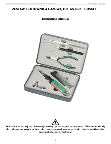 Zestaw z lutownicą gazową 1PK-GS300K Proskit Instrukcja obsługi ZESTAW Z LUTOWNICĄ GAZOWĄ 1PK-GS300K PROSKIT Instrukcja obsługi Dokładnie zapoznaj się z instrukcją obsługi przed rozpoczęciem pracy. Niestosowanie się do zaleceń zawartych w instrukcji może spowodować zagrożenie zdrowia użytkownika oraz uszkodzenie urządzenia. 1 Zestaw z lutownicą gazową 1PK-GS300K Proskit Instrukcja obsługi ZAWARTOŚĆ OPAKOWANIA Przed pierwszym użyciem otwórz ostrożnie opakowanie i wyciągnij z niego dostarczone produkty. Sprawdź czy w opakowaniu znajdują się wszystkie wymienione poniżej elementy oraz czy nie noszą one jakichkolwiek oznak uszkodzenia. ● zestaw do lutowania z lutownica gazową 1PK-GS300K w plastikowym etui rys. 1 W skład zestawu wchodzi: 1 lutownica gazowa z palnikiem 2 osłona palnika z zapalarką gazu 3, 4 wymienne nasadki 5 szczypce 6 narzędzie do wylutowywania układów scalonych 7 precyzyjna pęseta ZASADY BEZPIECZNEJ OBSŁUGI Ten symbol oznacza ważne informacje dotyczące bezpiecznej obsługi urządzenia i bezpieczeństwa użytkownika. Należy dokładnie zapoznać się z niniejszą instrukcją obsługi przed rozpoczęciem korzystania z urządzenia. Po przeczytaniu instrukcję należy zachować do późniejszego wykorzystania. Dzieci To urządzenie nie jest zabawką! Dzieci pod żadnym pozorem nie mogą użytkować tego urządzenia, ponieważ nie zdają sobie sprawy z potencjalnych zagrożeń. Należy pamiętać, aby urządzenie przechowywane było w bezpiecznym i niedostępnym dla dzieci miejscu. Dziecko może udławić się w wyniku połknięcia drobnych elementów. Bezpieczeństwo osobiste ●Nie używaj lutownicy w środowisku wybuchowym (gazy, opary). ●Nie używaj lutownicy, gdy jest uszkodzona. ●Nie pozostawiaj urządzenia bez nadzoru. ●Wszelkie naprawy może wykonywać tylko wykwalifikowany personel. 2 Zestaw z lutownicą gazową 1PK-GS300K Proskit Instrukcja obsługi ●Niedopuszczalne są jakiekolwiek modyfikacje urządzenia. ●Podczas pracy używaj zawsze okularów ochronnych. ●Miejsce pracy zawsze utrzymuj w czystości. Pracuj tylko w warunkach dobrego oświetlenia. Bałagan w miejscu pracy oraz złe oświetlenie mogą prowadzić do wypadku. ●Nie dotykaj metalowych elementów urządzenia podczas pracy ponieważ są rozgrzane do bardzo wysokiej temperatury. ●W miejscu pracy z lutownicą gazową zadbaj o zaopatrzenie w odpowiednie środki gaśnicze. ●Używaj narzędzia jedynie w dobrze wietrzonych i wentylowanych pomieszczeniach, aby uniknąć wdychania oparów i spalin. ●Nie napełniaj zbiornika gazem w pobliżu źródeł otwartego ognia i rozgrzanych przedmiotów. ●Nie pozostawiaj urządzenia w miejscu narażonym na bezpośrednie działanie promieni słonecznych oraz w miejscach, gdzie temperatura może być wyższa niż 40°C. ●Po zakończeniu pracy pozostaw urządzenie, aż do osiągnięcia przez nie temperatury pokojowej. PRZEZNACZENIE Zestaw 1PK-GS300K został zaprojektowany i wykonany specjalnie do lutowania i rozlutowywania elementów elektronicznych. DANE TECHNICZNE Gaz gaz do zapalniczek Temperatura lutowania 400°C Temperatura przechowywania poniżej 40°C BUDOWA 1 wymienny palnik 2 otwór blokady głowicy 3 regulator płomienia 4 zawór do napełniania rys. 2 OBSŁUGA ➊ Napełnianie zbiornika gazu Do napełniania zbiornika używaj wyłącznie filtrowanego gazu do zapalniczek wysokiej jakości. W celu napełnienia zbiornika gazu: – przekręć regulator płomienia maksymalnie w lewo w celu zamknięcia wypływu gazu – – – – odwróć lutownicę zaworem do napełniania do góry dociśnij dyszę wylotową pojemnika z gazem do zaworu lutownicy po całkowitym napełnieniu zbiornika lutownicy odłącz pojemnik z gazem od zaworu po napełnieniu zaczekaj kilka minut z uruchomieniem palnika, aby gaz mógł się ustabilizować rys. 3 ❷ Zapłon Wciśnij regulator płomienia i przekręć go w prawo, aż z dyszy wylotowej zacznie dochodzić dźwięk wydobywającego się gazu (rys. 4). Niezwłocznie zbliż do dyszy palnika zapalniczkę znajdującą się w osłonie 3 Zestaw z lutownicą gazową 1PK-GS300K Proskit Instrukcja obsługi palnika lub zapalarkę piezoelektryczną i zapal płomień (rys. 5). rys. 4 rys. 5 ❸ Regulacja płomienia Za pomocą pokrętła regulacji płomienia możesz ustawić żądaną długość płomienia. W celu włączenia regulacji przesuń najpierw pokrętło w kierunku palnika, aby wyłączyć blokadę bezpieczeństwa. Przekręcanie pokrętła w prawo powoduje zwiększanie płomienia, a przekręcanie w lewo zmniejszanie, aż do całkowitego wygaszenia (rys. 6). rys. 6 ❹ Wymiana nasadek W celu wymiany nasadki zablokuj głowicę lutownicy poprzez włożenie do otworu blokady 2 śrubokręta o odpowiedniej średnicy, a następnie odkręć nasadkę od głowicy i nakręć nową. Pamiętaj, aby wymianę nasadki przeprowadzać dopiero po całkowitym ochłodzeniu wszystkich elementów lutownicy do temperatury pokojowej ➎ Wylutowywanie układów scalonych Do wylutowywania układów scalonych użyj znajdującej się w zestawie nasadki 5PK-GS003-H1. Wsuń druciane końcówki narzędzia do wylutowywania układów scalonych pod dwa rzędy końcówek układu i podgrzej lutownicą spoiny lutownicze. Po roztopieniu spoiwa podnieś odseparuj układ scalony od płytki drukowanej (rys. 7). rys. 7 4