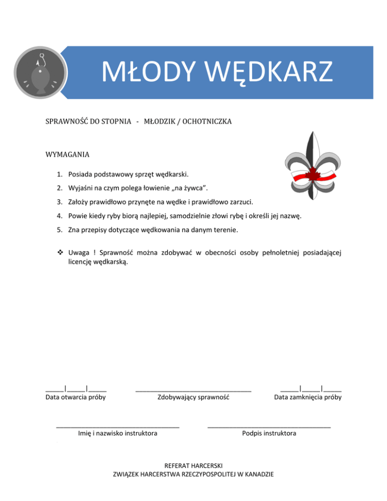 MŁODY WĘDKARZ SPRAWNOŚĆ DO STOPNIA - MŁODZIK / OCHOTNICZKA WYMAGANIA 1. Posiada podstawowy sprzęt wędkarski. 2. Wyjaśni na czym polega łowienie „na żywca”. 3. Założy prawidłowo przynęte na wędke i prawidłowo zarzuci. 4. Powie kiedy ryby biorą najlepiej, samodzielnie złowi rybę i określi jej nazwę. 5. Zna przepisy dotyczące wędkowania na danym terenie. Uwaga ! Sprawność można zdobywać w obecności osoby pełnoletniej posiadającej licencję wędkarską. _____|_____|_____ Data otwarcia próby ________________________________ Zdobywający sprawność __________________________________ Imię i nazwisko instruktora _____|_____|_____ Data zamknięcia próby __________________________________ Podpis instruktora 1. REFERAT HARCERSKI ZWIĄZEK HARCERSTWA RZECZYPOSPOLITEJ W KANADZIE
