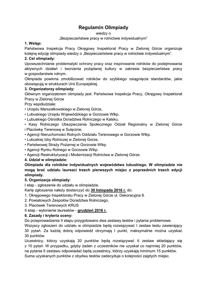 Regulamin Olimpiady wiedzy o „Bezpieczeństwie pracy w rolnictwie indywidualnym” 1. Wstęp: Państwowa Inspekcja Pracy Okręgowy Inspektorat Pracy w Zielonej Górze organizuje kolejną edycję olimpiady wiedzy o „Bezpieczeństwie pracy w rolnictwie indywidualnym”. 2. Cel olimpiady: Upowszechnianie problematyki ochrony pracy oraz inspirowanie rolników do podejmowania aktywnych działań i tworzenia pożądanej kultury w zakresie bezpieczeństwa pracy w gospodarstwie rolnym. Olimpiada powinna zmobilizować rolników do szybkiego osiągnięcia standardów, jakie obowiązują w strukturach Unii Europejskiej. 3. Organizatorzy olimpiady: Głównym organizatorem olimpiady jest: Państwowa Inspekcja Pracy, Okręgowy Inspektorat Pracy w Zielonej Górze Przy współudziale: • Urzędu Marszałkowskiego w Zielonej Górze, • Lubuskiego Urzędu Wojewódzkiego w Gorzowie Wlkp. • Lubuskiego Ośrodka Doradztwa Rolniczego w Kalsku, • Kasy Rolniczego Ubezpieczenia Społecznego Odział Regionalny w Zielonej Górze i Placówkę Terenową w Sulęcinie, • Agencji Nieruchomości Rolnych Oddziału Terenowego w Gorzowie Wlkp. • Lubuskiej Izby Rolniczej w Zielonej Gorze, • Państwowej Straży Pożarnej w Gorzowie Wlkp. • Agencji Rynku Rolnego w Gorzowie Wlkp. • Agencji Restrukturyzacji i Modernizacji Rolnictwa w Zielonej Górze. 4. Udział w olimpiadzie: Olimpiada dla rolników indywidualnych województwa lubuskiego. W olimpiadzie nie mogą brać udziału laureaci trzech pierwszych miejsc z poprzednich trzech edycji olimpiady. 5. Organizacja olimpiady: I etap - zgłoszenie do udziału w olimpiadzie. Kartę zgłoszenia należy dostarczyć do 30 listopada 2016 r. do: 1. Okręgowego Inspektoratu Pracy w Zielonej Górze ul. Dekoracyjna 8. 2. Powiatowych Zespołów Doradztwa Rolniczego. 3. Placówek Terenowych KRUS II etap - wyłonienie laureatów - grudzień 2016 r. 6. Zasady i kryteria oceny: Do przeprowadzenia II etapu przygotowano dwa zestawy testów i pytania problemowe. Wszyscy zgłoszeni do udziału w olimpiadzie będą rozwiązywać I zestaw testu zawierający 30 pytań. Za każdą dobrą odpowiedź otrzymają I punkt, maksymalnie można uzyskać 30 punktów. Uczestnicy, którzy uzyskają 20 punktów będą rozwiązywać II zestaw składający się z 10 pytań. W przypadku, gdyby żaden z uczestników nie uzyskał co najmniej 20 punktów, na pytania II zestawu odpowiadać będą uczestnicy, którzy uzyskają minimum 15 punktów. Suma uzyskanych punktów z obydwu testów zadecyduje o kolejności zajętych miejsc. W przypadku uzyskania jednakowej liczby punktów o kolejności miejsc w finale zadecydują pytania problemowe, za które będzie można uzyskać maksymalnie 5 punktów. Przedstawiciele wyżej wymienionych organizatorów będą wchodzić w skład Komisji na szczeblu wojewódzkim. Po zakończeniu prac komisji zostanie sporządzony protokół. 7. Nagrody, wyróżnienia, dyplomy: Komisja konkursowa na podstawie sumy uzyskanych punktów decyduje o kolejności zajętych miejsc w olimpiadzie. Komisja ogłosi wyniki w dniu sprawdzenia wiedzy. Laureaci olimpiady otrzymują nagrody rzeczowe, wyróżnienia i dyplomy. Uwaga: Nagrody rzeczowe podlegają opodatkowaniu podatkiem dochodowym od osób fizycznych. 8. Miejsce przeprowadzenia olimpiady: Lubuski Ośrodek Doradztwa Rolniczego w Kalsku. 9. Źródła finansowania olimpiady: Środki finansowe przeznaczone na finale olimpiady pochodzą od organizatorów i sponsorów wspierających ideę olimpiady. 10. Karta zgłoszenia udziału w Olimpiadzie - załącznik do regulaminu. 11. Upowszechnienie i promocja wyników XII Olimpiady wiedzy o „bezpieczeństwie pracy w rolnictwie indywidualnym” w czasopismach Lubuskich Ośrodkach Doradztwa Rolniczego w Kalsku - „Lubuskie Aktualności Rolnicze” i Lubuskiej Izby Rolniczej - „Rolniczy Puls” oraz na stronach internetowych organizatorów.