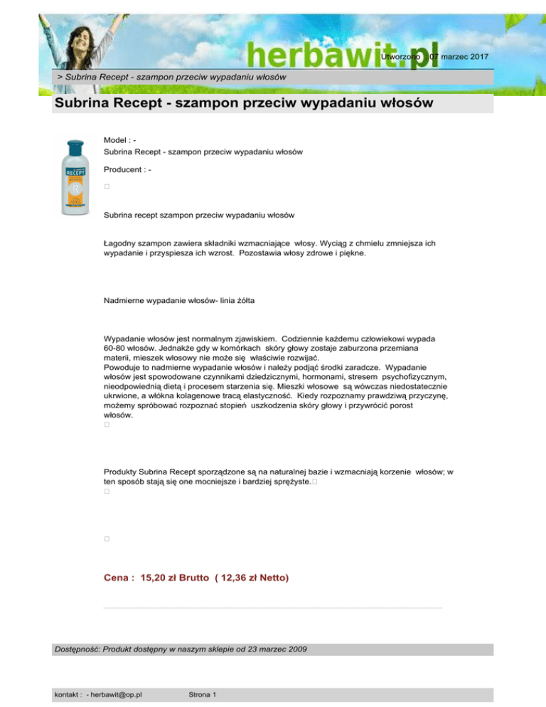 Utworzono : 07 marzec 2017 > Subrina Recept - szampon przeciw wypadaniu włosów Subrina Recept - szampon przeciw wypadaniu włosów Model : Subrina Recept - szampon przeciw wypadaniu włosów Producent : � Subrina recept szampon przeciw wypadaniu włosów Łagodny szampon zawiera składniki wzmacniające włosy. Wyciąg z chmielu zmniejsza ich wypadanie i przyspiesza ich wzrost. Pozostawia włosy zdrowe i piękne. Nadmierne wypadanie włosów- linia żółta Wypadanie włosów jest normalnym zjawiskiem. Codziennie każdemu człowiekowi wypada 60-80 włosów. Jednakże gdy w komórkach skóry głowy zostaje zaburzona przemiana materii, mieszek włosowy nie może się właściwie rozwijać. Powoduje to nadmierne wypadanie włosów i należy podjąć środki zaradcze. Wypadanie włosów jest spowodowane czynnikami dziedzicznymi, hormonami, stresem psychofizycznym, nieodpowiednią dietą i procesem starzenia się. Mieszki włosowe są wówczas niedostatecznie ukrwione, a włókna kolagenowe tracą elastyczność. Kiedy rozpoznamy prawdziwą przyczynę, możemy spróbować rozpoznać stopień uszkodzenia skóry głowy i przywrócić porost włosów. � Produkty Subrina Recept sporządzone są na naturalnej bazie i wzmacniają korzenie włosów; w ten sposób stają się one mocniejsze i bardziej sprężyste.� � � Cena : 15,20 zł Brutto ( 12,36 zł Netto) Dostępność: Produkt dostępny w naszym sklepie od 23 marzec 2009 kontakt : - [email protected] Strona 1