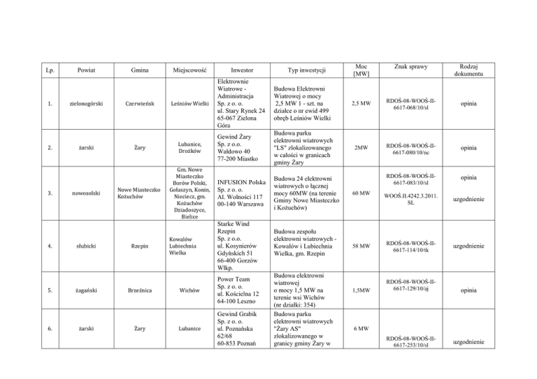 Lp. 1. 2. 3. 4. 5. 6. Powiat zielonogórski żarski nowosolski słubicki żagański żarski Gmina Czerwieńsk Moc [MW] Znak sprawy Rodzaj dokumentu Budowa Elektrowni Wiatrowej o mocy 2,5 MW 1 - szt. na działce o nr ewid 499 obręb Leśniów Wielki 2,5 MW RDOŚ-08-WOOŚ-II6617-068/10/sl opinia Gewind Żary Sp. z o.o. Wałdowo 40 77-200 Miastko Budowa parku elektrowni wiatrowych "LS" zlokalizowanego w całości w granicach gminy Żary 2MW RDOŚ-08-WOOŚ-II6617-080/10/nc opinia Budowa 24 elektrowni wiatrowych o łącznej mocy 60MW (na terenie Gminy Nowe Miasteczko i Kożuchów) RDOŚ-08-WOOŚ-II6617-083/10/sl opinia WOOŚ.II.4242.3.2011. SL uzgodnienie RDOŚ-08-WOOŚ-II6617-114/10/tk uzgodnienie Miejscowość Inwestor Leśniów Wielki Elektrownie Wiatrowe Administracja Sp. z o. o. ul. Stary Rynek 24 65-067 Zielona Góra Żary Lubanice, Drożków Nowe Miasteczko Kożuchów Gm. Nowe Miasteczko Borów Polski, Gołaszyn, Konin, Nieciecz, gm. Kożuchów Dziadoszyce, Bielice INFUSION Polska Sp. z o. o. Al. Wolności 117 00-140 Warszawa Kowalów Lubiechnia Wielka Starke Wind Rzepin Sp. z o.o. ul. Kosynierów Gdyńskich 51 66-400 Gorzów Wlkp. Rzepin Brzeźnica Żary Wichów Power Team Sp. z o. o. ul. Kościelna 12 64-100 Leszno Lubanice Gewind Grabik Sp. z o. o. ul. Poznańska 62/68 60-853 Poznań Typ inwestycji Budowa zespołu elektrowni wiatrowych Kowalów i Lubiechnia Wielka, gm. Rzepin Budowa elektrowni wiatrowej o mocy 1,5 MW na terenie wsi Wichów (nr działki: 354) Budowa parku elektrowni wiatrowych "Żary AS" zlokalizowanego w granicy gminy Żary w 60 MW 58 MW 1,5MW RDOŚ-08-WOOŚ-II6617-129/10/aj opinia 6 MW RDOŚ-08-WOOŚ-II6617-253/10/sl uzgodnienie obrębie ewidencyjnym Lubanice na działkach o nr ew.: 494, 504/1 i 510 7. żarski 8. 9. sulęciński żagański Lubsko Dłużek GEWIND BUDZIECHÓW Sp. z o. o. Wałdowo 40 77-200 Miasteczko Sulęcin Trzemeszno, Grochowo L.P. Sulęcin Sp. z o.o. ul. Paderewskiego 9 76-200 Słupsk Niegosławice, Szprotawa Mycielin, Gościeszowice, Długie, Dzikowice, Sucha Dolna Monsun Sp. z o.o. AL. Wojska Polskiego 156 71-324 Szczecin 10. żagański Małomice Janowice GEWIND Szprotawa Sp. z o. o. Wałdowo 40 77-200 Miastko 11. nowosolski Kożuchów Lasocin Osoba fizyczna Budowa parku elektrowni wiatrowych "Budziechów AS" zlokalizowanych w całości w granicach gminy Lubsko w obrębie ewidencyjnym Dłużek na działce o nr ew. 103/3 Budowa parku elektrowni wiatrowych "Sulęcin LS" zlokalizowanego w całości w granicach gminy Sulęcin w obrębie ewidencyjnym Trzemeszno na działkach o nr: 49/2, 4/1, 8, 12, 66 i Grochowo na działkach nr: 17, 57/1, 94, 96, 97, 98/1, 98/2, 169, 167/11, 19/3 Budowa zespołu elektrowni wiatrowych wraz z infrastrukturą towarzyszącą "FW Mycielin" Budowa parku elektrowni wiatrowych "KARTOWICE AS" zlokalizowanego w całości w granicach gminy Małomice Budowa małej siłowni RDOŚ-08-WOOŚ-II6617-278/10/sl opinia 6 MW RDOŚ-08-WOOŚ-II6617-597/10/sl uzgodnienie 3MW RDOŚ-08-WOOŚ-II6617-306/10/aj opinia 75MW RDOŚ-08-WOOŚ-II6617-315/10/pk opinia 6,8 MW WOOŚ .II.4242.9.2011.SL 60 kW uzgodnienie wiatrowej - turbiny o wysokości 18-29 m, średnicy wirnika 10-20 m, średnicy u podstawy poniżej 2 m, u wierzchołka poniżej 1 m 12. 13. żagański międzyrzecki Niegosławice, Szprotawa Przytoczna Mycielin, Niegosławice, Długie, Gościszowice, Sucha Dolna, Dzikowice Monsun Sp. z o.o. AL. Wojska Polskiego 156 71-324 Szczecin Chełmsko Nowa Niedrzwica Starke Wind Nowa Nied Sp. z o. o. ul. Kosynierów Gdyńskich 51 66-400 Gorzów Wlkp. Starke Wind Sława Sp. z o. o. ul. Kosynierów Gdyńskich 51 66-400 Gorzów Wlkp. 14. wschowski Sława Stare Strącze, Przybyszów, Lipinki 15. świebodziński Skąpe Darnawa, Niekarzyn, Juron Sp. z o. o. Budowa zespołu elektrowni wiatrowych wraz z infrastrukturą towarzyszącą na terenie gminy Niegosławice Budowa zespołu elektrowni wiatrowych wraz z niezbędną infrastrukturą towarzyszącą w obrębie miejscowości Chełmsko Nowa Niedrzwica, gmina Przytoczna oraz przebudowa drogi gminnej publicznej dz. nr 385 w obrębie Chełmsko Budowa zespołu elektrowni wiatrowych wraz z niezbędną infrastrukturą towarzyszącą w obrębie miejscowości Stare Strącze, Przybyszów i Lipinki, gmina Sława oraz przebudowa dróg wojewódzkich, drogi gminnej i powiatowej Budowa zespołu RDOŚ-08-WOOS-II6617-633/10/nc WOOSII.4242.23.2011.PK opinia uzgodnienie 3MW 50-62,5 MW od 2,0 – 2,5 MW 30 MW WOOŚII.4240.61.2011.SL opinia WOOŚII.4240.123.2011.NC opinia WOOŚ-II- Radoszyn żarski Lubsko Tuchola Żarska 16. 17. 18. żarski żarski Żary Żary Lubanice, Drożków Lubanice, Drożków AL. Wojska Polskiego 156 71-324 Szczecin ENEWIA Sp. z o. o. ul. Grabiszyńska 163 53-439 Wrocław Eneregio Sp. z o. o. al. KEN 97 lok. UH 31 A 02-777 Warszawa FW Żary Sp. z o. o. Włodowo 40 77-200 Miastko 4240.136.2011.SL elektrowni wiatrowych "Ferma Niekarzyn" wraz z infrastrukturą towarzyszącą na terenie gminy Skąpe Budowa jednej elektrowni wiatrowej o łącznej mocy 3000 kW (wraz z przyłączami energetycznymi, drogą dojazdową i placem Budowa maksymalnie 7 sztuk elektrowni wiatrowych o łącznej mocy do 21 MW wraz z infrastrukturą towarzyszącą w postaci przyłączy elektroenergetycznych, złączy kablowopomiarowych, dróg dojazdowych, placów manewrowomontażowych, zjazdów z drogi oraz stacji transformatorowej GPZ, zlokalizowanych w miejscowościach: Lubanice nr ewi. działek: 642, 591, Drożków nr ewid. działek: 424, 110/8, 110/10 Budowa parku elektrowni wiatrowych "FW Żary" WOOŚII.4242.121.2011.SL Opinia uzgodnienie 3000 kW WOOŚII.4240.261.2011.SL opinia WOOŚII.4240.280.2011.NC opinia WOOŚII.4242.87.2012.NC uzgodnienie 21 MW WOOŚII.4242.68.2013.NC 72 MW WOOSII.4240.322.2011.AJ WOOŚII.4242.136.2011.AJ uzgodnienie opinia uzgodnienie 19. 20. 21. 22. 23. strzeleckodrezdenecki krośnieński krośnieński Zdzisław Kondrat ASSA Poland ul. Wielicka 38/U2 02-657 Warszawa Strzelce Krajeńskie, Zwierzyn Dąbie Dąbie