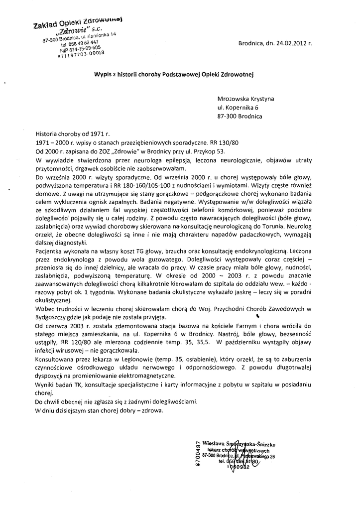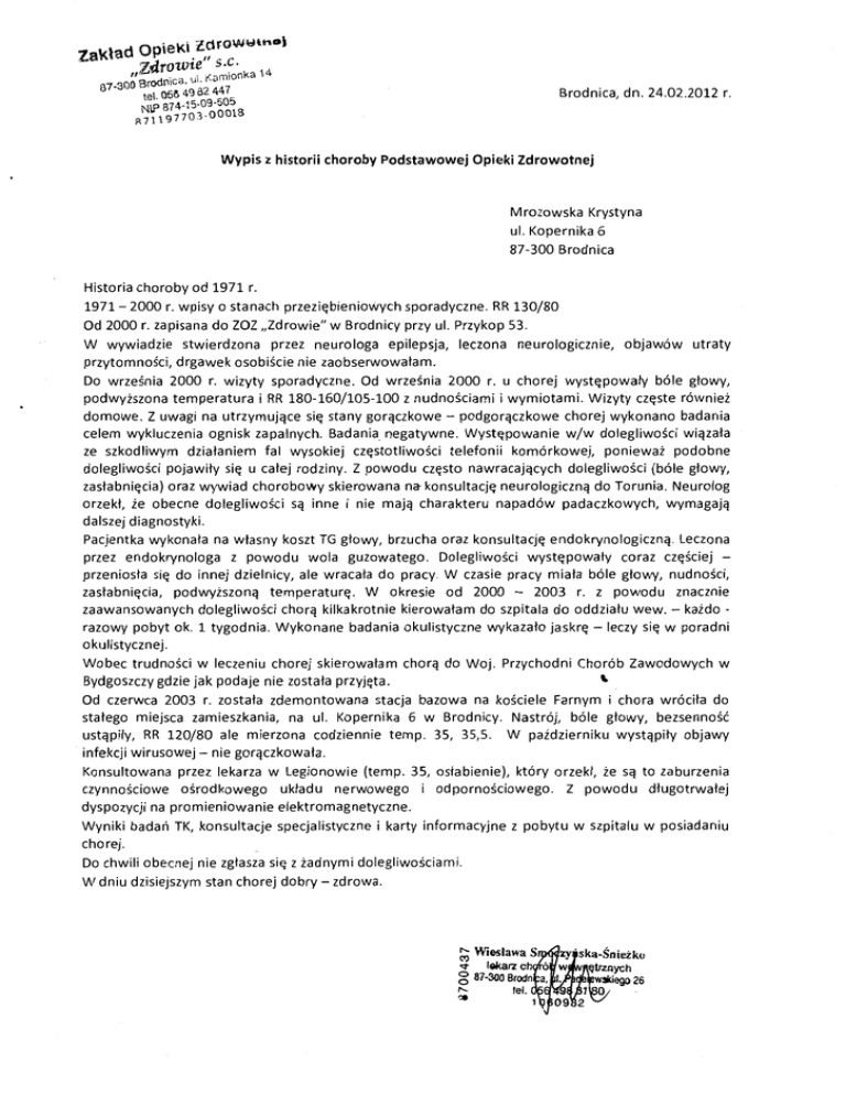 Od 2000 r. zapisana do ZOZ "Zdrowie" w Brodnicy przy ul. Przykop 53.