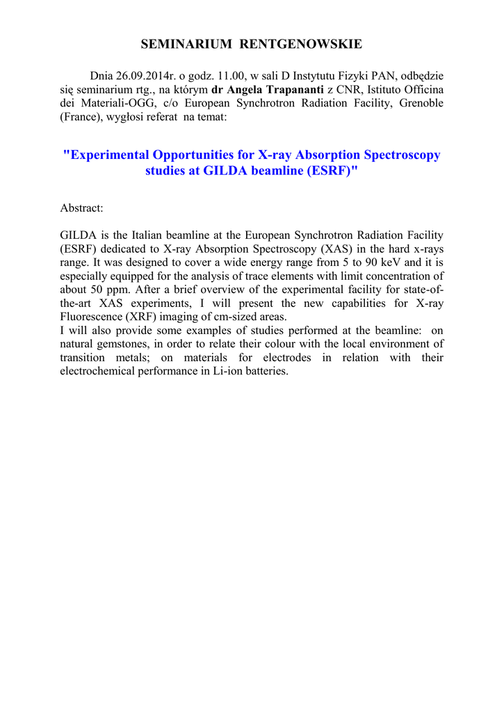 SEMINARIUM RENTGENOWSKIE Dnia 26.09.2014r. o godz. 11.00, w sali D Instytutu Fizyki PAN, odbędzie się seminarium rtg., na którym dr Angela Trapananti z CNR, Istituto Officina dei Materiali-OGG, c/o European Synchrotron Radiation Facility, Grenoble (France), wygłosi referat na temat: "Experimental Opportunities for X-ray Absorption Spectroscopy studies at GILDA beamline (ESRF)" Abstract: GILDA is the Italian beamline at the European Synchrotron Radiation Facility (ESRF) dedicated to X-ray Absorption Spectroscopy (XAS) in the hard x-rays range. It was designed to cover a wide energy range from 5 to 90 keV and it is especially equipped for the analysis of trace elements with limit concentration of about 50 ppm. After a brief overview of the experimental facility for state-ofthe-art XAS experiments, I will present the new capabilities for X-ray Fluorescence (XRF) imaging of cm-sized areas. I will also provide some examples of studies performed at the beamline: on natural gemstones, in order to relate their colour with the local environment of transition metals; on materials for electrodes in relation with their electrochemical performance in Li-ion batteries.