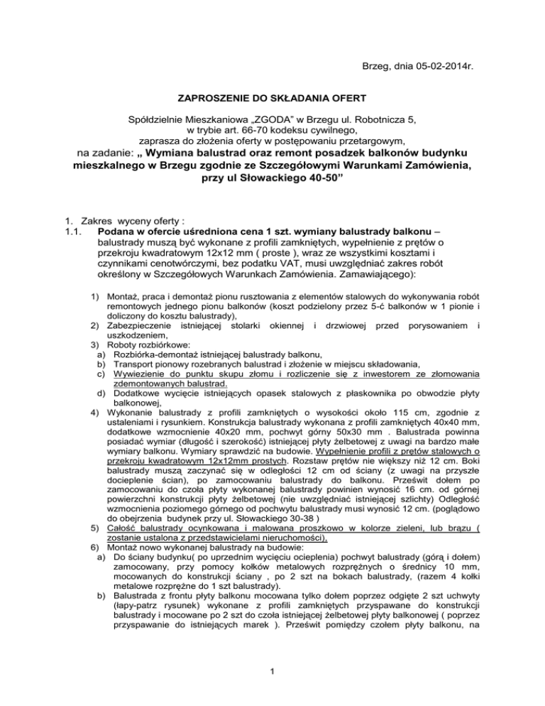 Brzeg, dnia 05-02-2014r. ZAPROSZENIE DO SKŁADANIA OFERT Spółdzielnie Mieszkaniowa „ZGODA” w Brzegu ul. Robotnicza 5, w trybie art. 66-70 kodeksu cywilnego, zaprasza do złożenia oferty w postępowaniu przetargowym, na zadanie: „ Wymiana balustrad oraz remont posadzek balkonów budynku mieszkalnego w Brzegu zgodnie ze Szczegółowymi Warunkami Zamówienia, przy ul Słowackiego 40-50” 1. Zakres wyceny oferty : 1.1. Podana w ofercie uśredniona cena 1 szt. wymiany balustrady balkonu – balustrady muszą być wykonane z profili zamkniętych, wypełnienie z prętów o przekroju kwadratowym 12x12 mm ( proste ), wraz ze wszystkimi kosztami i czynnikami cenotwórczymi, bez podatku VAT, musi uwzględniać zakres robót określony w Szczegółowych Warunkach Zamówienia. Zamawiającego): 1) Montaż, praca i demontaż pionu rusztowania z elementów stalowych do wykonywania robót remontowych jednego pionu balkonów (koszt podzielony przez 5-ć balkonów w 1 pionie i doliczony do kosztu balustrady), 2) Zabezpieczenie istniejącej stolarki okiennej i drzwiowej przed porysowaniem i uszkodzeniem, 3) Roboty rozbiórkowe: a) Rozbiórka-demontaż istniejącej balustrady balkonu, b) Transport pionowy rozebranych balustrad i złożenie w miejscu składowania, c) Wywiezienie do punktu skupu złomu i rozliczenie się z inwestorem ze złomowania zdemontowanych balustrad. d) Dodatkowe wycięcie istniejących opasek stalowych z płaskownika po obwodzie płyty balkonowej, 4) Wykonanie balustrady z profili zamkniętych o wysokości około 115 cm, zgodnie z ustaleniami i rysunkiem. Konstrukcja balustrady wykonana z profili zamkniętych 40x40 mm, dodatkowe wzmocnienie 40x20 mm, pochwyt górny 50x30 mm . Balustrada powinna posiadać wymiar (długość i szerokość) istniejącej płyty żelbetowej z uwagi na bardzo małe wymiary balkonu. Wymiary sprawdzić na budowie. Wypełnienie profili z prętów stalowych o przekroju kwadratowym 12x12mm prostych. Rozstaw prętów nie większy niż 12 cm. Boki balustrady muszą zaczynać się w odległości 12 cm od ściany (z uwagi na przyszłe docieplenie ścian), po zamocowaniu balustrady do balkonu. Prześwit dołem po zamocowaniu do czoła płyty wykonanej balustrady powinien wynosić 16 cm. od górnej powierzchni konstrukcji płyty żelbetowej (nie uwzględniać istniejącej szlichty) Odległość wzmocnienia poziomego górnego od pochwytu balustrady musi wynosić 12 cm. (poglądowo do obejrzenia budynek przy ul. Słowackiego 30-38 ) 5) Całość balustrady ocynkowana i malowana proszkowo w kolorze zieleni, lub brązu ( zostanie ustalona z przedstawicielami nieruchomości), 6) Montaż nowo wykonanej balustrady na budowie: a) Do ściany budynku( po uprzednim wycięciu ocieplenia) pochwyt balustrady (górą i dołem) zamocowany, przy pomocy kołków metalowych rozprężnych o średnicy 10 mm, mocowanych do konstrukcji ściany , po 2 szt na bokach balustrady, (razem 4 kołki metalowe rozprężne do 1 szt balustrady). b) Balustrada z frontu płyty balkonu mocowana tylko dołem poprzez odgięte 2 szt uchwyty (łapy-patrz rysunek) wykonane z profili zamkniętych przyspawane do konstrukcji balustrady i mocowane po 2 szt do czoła istniejącej żelbetowej płyty balkonowej ( poprzez przyspawanie do istniejących marek ). Prześwit pomiędzy czołem płyty balkonu, na 1 wysokości płyty a uchwytem mocującym musi wynosić 6 cm ( do montażu obróbki blacharskiej) . c) Wykonywanie robót porządkowych w trakcie wykonywania robót remontowych oraz po ich zakończeniu. 7) Przywrócenie terenu do stanu pierwotnego. 1.2. Podana w ofercie uśredniona cena 1 szt. remontu posadzek balkonu wraz ze wszystkimi kosztami i czynnikami cenotwórczymi, bez podatku VAT, musi uwzględniać zakres robót określony w Szczegółowych Warunkach Zamówienia. Zamawiającego): 8) Montaż, praca i demontaż pionu rusztowania z elementów stalowych do wykonywania robót remontowych jednego pionu balkonów (koszt podzielony przez 5-ć balkonów w 1 pionie), 9) Zabezpieczenie istniejącej stolarki okiennej i drzwiowej oraz nowo zamontowanej balustrady przed porysowaniem i uszkodzeniem, 10) Roboty rozbiórkowe: a) Rozbiórka istniejącej posadzki balkonu wraz z izolacja poziomą, b) Wycięci dodatkowego pasa istniejącego ocieplenia ściany nad płytą balkonu o szerokości około 10cm, do prawidłowego wykonania izolacji poziomej płyty balkonowej i pasa izolacji na ścianie, wraz z robotami towarzyszącymi, c) Transport pionowy gruzu z rozbiórek i złożenie w miejscu składowania, d) Wywiezienie gruzu z rozbiórek oraz ich utylizacja, po zakończeniu robót, 11) Oczyszczenie powierzchni płyty balkonowej z kurzu i brudu, 12) Gruntowanie powierzchni płyty środkiem gruntującym UNI-GRUNT (np. producent „ATLAS”) pod warstwę wyrównawczą, 13) Wykonanie warstwy spadkowej na powierzchni płyty balkonu z zaprawy szybkosprawnej systemu „WIM” o grubości średniej około 6 cm, w kierunku od ściany ze spadkiem około 1,5% na zewnątrz płyty. Krawędzie płytek na połączeniu z blacharką dodatkowo doszczelnić silikonem dekarskim, 14) Wykonanie wyoblenia z zaprawy na połączeniu ściany z płytą żelbetowa balkonu (pas tynku niezbędny do wykonania izolacji poziomej i pionowej na połączenie ze ścianą, o szerokości około 10 cm ), 15) Montaż obróbek blacharskich o szerokości 25 cm z blachy ocynkowanej grubości 0,55 mm, po obwodzie krawędzi płyty balkonowej, połączenia lutowane. Krawędź obróbki musi wystawać poza płytę balkonu 5 cm, przy ścianie należy wlutować do obróbki odbojnicę wody wchodzącą w ocieplenie ściany, 16) Wklejenie taśmy uszczelniającej 12 cm „WIM”, na połączeniu obórek blacharskich z warstwą spadkową oraz wzdłuż połączenia ze ścianą (pas około 10cm ) oraz na załamaniach ściany dodatkowo zastosować narożniki systemowe, 17) Wykonanie hydro-izolacji poziomej na powierzchni nowo wykonanej warstwie spadkowej poprzez powlekanie dw