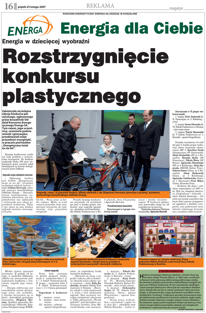 16 REKLAMA piątek 23 lutego 2007 magazyn KONCERN ENERGETYCZNY ENERGA SA ODDZIA£ W KOSZALINIE Energia dla Ciebie Energia w dziecięcej wyobraźni Rozstrzygnięcie konkursu plastycznego Zakończyła się kolejna edycja konkursu plastycznego, ogłoszonego przez koszaliński Oddział Koncernu Energetycznego Energa SA. Tym razem, jego uczestnicy, uczniowie podstawówek i gimnazjów, przedstawiali wizje przyszłości energetyki, w pracach pod hasłem „Energetyczny świat za sto lat”. Zwycięzcami w II grupie wiekowej zostali: 1. miejsce Piotr Jachowski kl. II, Gimnazjum nr 3, Kołobrzeg rower 2. miejsce Iwona Głowacka kl. VI, Szkoła Podstawowa w Boninie - mini wieża stereo 3. miejsce Patryk Okomoński kl. V Szkoła Podstawowa nr 7, Koszalin - aparat fotograficzny. Komisja konkursowa miała nie lada problem z wyłonieniem zwycięzców. Na konkurs napłynęło blisko 500 prac wykonanych przez uczniów szkół działających na terenie obsługiwanym przez Oddział. Nagrodę, rower, za pierwsze miejsce, Nikola odebrała z rąk Zbigniewa Hermana (pierwszy z prawej), dyrektora generalnego koszalińskiego oddziału Energi. Najwyżej oceniona pracę w II grupie wiekowej wykonał Piotr Jachowski z drugiej klasy Gimnazjum nr 3 w Kołobrzegu. Młodzi twórcy sprostali wyzwaniu. W piątek, 16 lutego, w siedzibie Oddziału, odbyła się uroczystość podsumowania konkursu i wręczenie nagród jego laureatom. – Energia elektryczna jest niewidzialna częścią oferowanego przez nas produktu, z którego korzystacie na co dzień – powiedział, gratulując laureatom, Zbigniew Herman, dyrektor generalny Koszalińskiego Oddziału Koncernu Energetycznego ENER- Cenne nagrody Prace były oceniane w dwóch grupach wiekowych: I - uczniowie klas 1, 2, 3 i 4 Szkół Podstawowych; II grupa - uczniowie klas 5 i 6 Szkół Podstawowych, oraz 1, 2 i 3 klasa gimnazjalna. Nagrodami w konkursie były: I - miejsce - rower II - miejsce - mini wieża stereo III - miejsce - cyfrowy aparat fotograficzny Przedstawiamy laureatów Zwycięzcami w I grupie wiekowej zostali: Na uroczystość podsumowania konkursu i wręczenia nagród laureatom, młodzi twórcy przybyli w towarzystwie nauczycieli i dumnych rodziców. ninie, za największą liczbę laureatów konkursu. – Ogromnie się cieszę z nagrody i sukcesu, jaki w konkursie odniosła nasza szkoła i nasi uczniowie – mówi Zofia Kozłowska, dyrektor Szkoły Podstawowej w Boninie. – Bierzemy udział w wielu konkursach i w wielu z nich zdobywamy nagrody. Nasi uczniowie rozwijają umiejętności plastyczne w kółku plastycznym „Wesoły pędzelek”, pod kierunkiem wychowawcy świetlicy, Ilony Maroszek-Suszka, oraz nauczycie- 1. miejsce - Nikola Różycka kl. I, Szkoła Podstawowa w Boninie - rower 2. miejsce - Kaja Szulc kl. IV, Miejsko-Gminny Ośrodek Kultury Kalisz Pomorski - mini wieża stereo 3. miejsce - Aleksandra Sypko kl. IV, Szkoła Podstawowa, Spore, gmina Wierzchowo - aparat fotograficzny – Swoją pracę wykonałam z wycinanek i zajęło mi to dwa dni – zdradziła nam Nikola Różycka. – Lubię ry- FOT. R. KOLEŚNIK sować i bardzo chciałam wygrać. W konkursie plastycznym startowałam drugi raz, ale wygrałam po raz pierwszy. Opiekunką plastyczną Nikoli jest nauczycielka, Agnieszka Bartosik. li plastyki, Anny Chojnackiej i Agnieszki Bartosik. FOT. R. KOLEŚNIK Ponadto komisja konkursowa przyznała 10 wyróżnień (po pięć w każdej grupie wiekowej), oraz nagrodę specjalną - projektor multimedialny dla Szkoły Podstawowej w Bo- GA SA. – Wasze prace są bardzo ciekawe. Myślę, że wiele waszych pomysłów może zainspirować inżynierów do realizowania wizji przyszłości energetyki. FOT. R. KOLEŚNIK – Ogłaszając konkurs pod hasłem „Energetyczny świat za sto lat”, liczyliśmy na fantazję młodych twórców – mówi Jolanta Szewczyk, rzecznik prasowy koszalińskiego Oddziału Energi. – Dziecięca, niczym nieskrępowana, wyobraźnia plastyczna, już niejednokrotnie nas zadziwiała i zachwycała przy okazji poprzednich konkursów. Także i tym razem na nasz konkurs wpłynęło mnóstwo interesujących prac. FOT. R. KOLEŚNIK Dojrzałe wizje młodych twórców Ponadto wyróżniono 10 osób (po pięć w każdej grupie wiekowej), które otrzymały odtwarzacze MP 3: Karolina Osiak (Integracyjna SP Szczecinek), Alicja Gromadzka (SP nr 4 Koszalin), Klaudia Rylik (SP Drzewiany), Nikola Klein (SP Bonin), Agnieszka Durmińska (SP nr 4 Kołobrzeg), Alicja Kapiszka (MGOK Kalisz Pom.), Jędrzej Szmat (Gimn. nr 6 Koszalin), Adam Rutkowski (Gimn. nr 3 Kołobrzeg), Agnieszka Gołębiewska (Gimn. nr 1 Złocieniec) Piotr Mikos (Gimn. Drawsko Pom). – Konkursy dla dzieci i młodzieży organizujemy od 1997 roku. Były już zmagania plastyczne, fotograficzne i literackie – mówi Jolanta Szewczyk. – Ich celem jest przede wszystkim edukacja dzieci poprzez propagowanie zagadnień z dziedziny energetyki, oraz podnoszenie świadomości właściwego korzystania z urządzeń elektrycznych. Pierwsze miejsce w I grupie wiekowej. Pracę wykonała Nikola Różycka z pierwszej klasy Szkoły Podstawowej w Boninie. Z HISTORII ENERGETYKI H istoria energetyki obejmuje zaledwie 124 lata i liczy się od czasu, kiedy Thomas Edison, w 1882 roku, uruchomił w Nowym Jorku pierwszą elektrownię publicznego użytku. Na ziemiach polskich powszechna elektryfikacja nastąpiła dopiero po II Wojnie Światowej. W tym stosunkowo niedługim czasie energia elektryczna wkroczyła do wszystkich dziedzin życia. Dzisiaj nikt nie jest w stanie wyobrazić sobie życia bez prądu, a okresowe braki w jego dostawach są źródłem wielu problemów i frustracji. Tradycyjne sposoby wytwarzania energii elektrycznej uzyskiwanej w procesie spalania węgla, będą jednak musiały stopniowo ustąpić miejsca innym metodom, bo światowe zapasy paliw kopalnych kiedyś się skończą. Przyszłość energii elektrycznej będzie zależała od umiejętności znalezienia i wykorzystania jej nowy