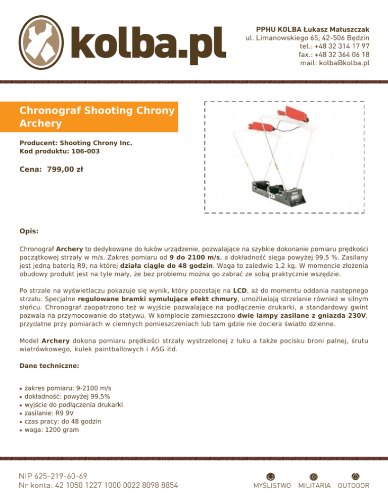 Chronograf Shooting Chrony Archery Producent: Shooting Chrony Inc. Kod produktu: 106-003 Cena: 799,00 zł Opis: Chronograf Archery to dedykowane do łuków urządzenie, pozwalające na szybkie dokonanie pomiaru prędkości początkowej strzały w m/s. Zakres pomiaru od 9 do 2100 m/s, a dokładność sięga powyżej 99,5 %. Zasilany jest jedną baterią R9, na której działa ciągle do 48 godzin. Waga to zaledwie 1,2 kg. W momencie złożenia obudowy produkt jest na tyle mały, że bez problemu można go zabrać ze sobą praktycznie wszędzie. Po strzale na wyświetlaczu pokazuje się wynik, który pozostaje na LCD, aż do momentu oddania następnego strzału. Specjalne regulowane bramki symulujące efekt chmury, umożliwiają strzelanie również w silnym słońcu. Chronograf zaopatrzono też w wyjście pozwalające na podłączenie drukarki, a standardowy gwint pozwala na przymocowanie do statywu. W komplecie zamieszczono dwie lampy zasilane z gniazda 230V, przydatne przy pomiarach w ciemnych pomieszczeniach lub tam gdzie nie dociera światło dzienne. Model Archery dokona pomiaru prędkości strzały wystrzelonej z łuku a także pocisku broni palnej, śrutu wiatrówkowego, kulek paintballowych i ASG itd. Dane techniczne: ● ● ● ● ● ● zakres pomiaru: 9-2100 m/s dokładność: powyżej 99,5% wyjście do podłączenia drukarki zasilanie: R9 9V czas pracy: do 48 godzin waga: 1200 gram Gwarancja 12 miesięcy. Kanadyjska firma Shooting Chrony od 1987 roku produkuje precyzyjne urządzenia do pomiaru prędkości pocisków. Oferta obejmuje chronografy przeznaczone do broni palnej, pneumatycznej, paintball, ASG oraz łuków, a także całą gamę akcesoriów do nich.