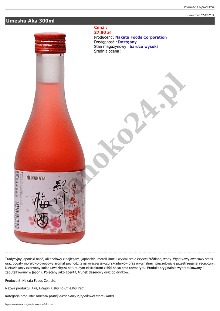 Informacje o produkcie Utworzono 07-03-2017 Umeshu Aka 300ml Cena : 27,90 zł to ra no ko 24 .p l Producent : Nakata Foods Corporation Dostępność : Dostępny Stan magazynowy : bardzo wysoki Średnia ocena : Tradycyjny japoński napój alkoholowy z najlepszej japońskiej moreli Ume i krystalicznie czystej źródlanej wody. Wyjątkowy owocowy smak oraz bogaty morelowo-owocowy aromat pochodzi z najwyższej jakości składników oraz oryginalnej i pieczołowicie przestrzeganej receptury. Nietuzinkowy czerwony kolor zawdzięcza naturalnym ekstraktom z liści shiso oraz rozmarynu. Produkt oryginalnie wyprodukowany i zabutelkowany w Japonii. Polecany jako aperitif, trunek deserowy oraz do drinków. Producent: Nakata Foods Co., Ltd. Nazwa produktu: Aka, Houjun Kishu no Umeshu Red Kategoria produktu: umeshu (napój alkoholowy z japońskiej moreli ume) Wygenerowano w programie www.oscGold.com Pojemność: 300ml Zawartość alkoholu: 12 % Skład produktu: japońska morela ume (kishu nanko ume), naturalna woda, cukier, alkohol destylowany, rozmaryn, barwiony naturalnie ekstraktem z liści shiso to ra no ko 24 .p l Sposoby serwowania: Dla pełnego aromatu najlepiej smakuje schłodzone. Można podawać z lodem lub wodą/sodą.Umeshu można pić bez żadnych dodatków ale również może być bazą dla różnych koktajli alkoholowych lub dodatkiem do ciast, deserów.