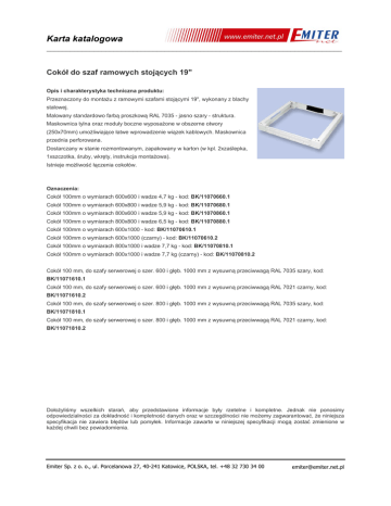 Karta katalogowa ___________________________________________________________________________ Cokół do szaf ramowych stojących 19" Opis i charakterystyka techniczna produktu: Przeznaczony do montażu z ramowymi szafami stojącymi 19", wykonany z blachy stalowej. Malowany standardowo farbą proszkową RAL 7035 - jasno szary - struktura. Maskownica tylna oraz moduły boczne wyposażone w obszerne otwory (250x70mm) umożliwiające łatwe wprowadzenie wiązek kablowych. Maskownica przednia perforowana. Dostarczany w stanie rozmontowanym, zapakowany w karton (w kpl. 2xzaślepka, 1xszczotka, śruby, wkręty, instrukcja montażowa). Istnieje możliwość łączenia cokołów. Oznaczenia: Cokół 100mm o wymiarach 600x600 i wadze 4,7 kg - kod: BK/11070660.1 Cokół 100mm o wymiarach 600x800 i wadze 5,9 kg - kod: BK/11070680.1 Cokół 100mm o wymiarach 800x600 i wadze 5,9 kg - kod: BK/11070860.1 Cokół 100mm o wymiarach 800x800 i wadze 6,5 kg - kod: BK/11070880.1 Cokół 100mm o wymiarach 600x1000 - kod: BK/11070610.1 Cokół 100mm o wymiarach 600x1000 (czarny) - kod: BK/11070610.2 Cokół 100mm o wymiarach 800x1000 i wadze 7,7 kg - kod: BK/11070810.1 Cokół 100mm o wymiarach 800x1000 i wadze 7,7 kg (czarny) - kod: BK/11070810.2 Cokół 100 mm, do szafy serwerowej o szer. 600 i głęb. 1000 mm z wysuwną przeciwwagą RAL 7035 szary, kod: BK/11071610.1 Cokół 100 mm, do szafy serwerowej o szer. 600 i głęb. 1000 mm z wysuwną przeciwwagą RAL 7021 czarny, kod: BK/11071610.2 Cokół 100 mm, do szafy serwerowej o szer. 800 i głęb. 1000 mm z wysuwną przeciwwagą RAL 7035 szary, kod: BK/11071810.1 Cokół 100 mm, do szafy serwerowej o szer. 800 i głęb. 1000 mm z wysuwną przeciwwagą RAL 7021 czarny, kod: BK/11071810.2 Dołożyliśmy wszelkich starań, aby przedstawione informacje były rzetelne i kompletne. Jednak nie ponosimy odpowiedzialności za dokładność i kompletność danych oraz w szczególności nie możemy zagwarantować, że niniejsza specyfikacja nie zawiera błędów lub pomyłek. Informacje zawarte w niniejszej specyfikacji mogą zostać zmienione w każdej chwili bez powiadomienia. Emiter Sp. z o. o., ul. Porcelanowa 27, 40-241 Katowice, POLSKA, tel. +48 32 730 34 00 [email protected]