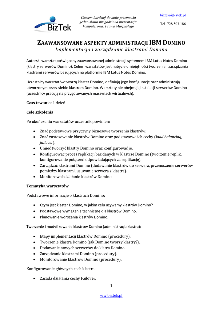 Czasem bardziej do mnie przemawia jedno s owo ni godzinna prezentacja komputerowa. Prawa Murphy'ego [email protected] Tel. 728 503 186 ZAAWANSOWANE ASPEKTY ADMINISTRACJI IBM DOMINO Implementacja zarz dzanie klastrami Domino Autorski warsztat po wi cony zaawansowanej administracji systemem IBM Lotus Notes Domino (klastry serwerów Domino). Celem warsztatów jest nabycie umiej tno ci tworzenia i zarz dzania klastrami serwerów bazuj cych na platformie IBM Lotus Notes Domino. Uczestnicy warsztatów tworz klaster Domino, definiuj jego konfiguracj oraz administruj utworzonym przez siebie klastrem Domino. Warsztaty nie obejmuj instalacji serwerów Domino (uczestnicy pracuj na przygotowanych maszynach wirtualnych). Czas trwania dzie Cele szkolenia Po uko czeniu warsztatów uczestnik powinien: Zna podstawowe przyczyny biznesowe tworzenia klastrów. Zna zastosowanie klastrów Domino oraz podstawowe ich cechy (load balancing failover). Umie tworzy klastry Domino oraz konfigurowa je. Konfigurowa proces replikacji baz danych klastrze Domino (tworzenie replik, konfigurowanie po cze odpowiadaj cych za replikacj ). Zarz dza klastrami Domino (dodawanie klastrów do serwera, przenoszenie serwerów pomi dzy klastrami, usuwanie serwera klastra). Monitorowa dzia anie klastrów Domino. Tematyka warsztatów Podstawowe informacje klastrach Domino: Czym jest klaster Domino, w jakim celu u ywamy klastrów Domino? Podstawowe wymagania techniczne dla klastrów Domino. Planowanie wdro enia klastrów Domino. Tworzenie i modyfikowanie klastrów Domino (administracja klastra): Etapy implementacji klastrów Domino (procedury). Tworzenie klastra Domino (jak Domino tworzy klastry?). Dodawanie nowych serwerów do klatra Domino. Zarz dzanie klastrami Domino (procedury). Monitorowanie klastrów Domino (procedury). Konfigurowanie ównych cech klastra: Zasada dzia ania cechy Failover. ww.biztek.pl Czasem bardziej do mnie przemawia jedno s owo ni godzinna prezentacja komputerowa. Prawa Murphy'ego [email protected] Tel. 728 503 186 Konfigurowanie Failover oraz sposoby zarz dzania Failover. Konfigurowanie zarz dzanie Load Balancing. Aplikacje Domino w klastrze: Replikacja baz danych w klastrze Domino. Zarz dzanie bazami danych w klastrze. Monitorowanie i analiza klastrów Domino: Analiza konfiguracji klastra Domino. Metody monitorowania klastrów Domino. Monitorowanie wydajno ci klastra (Cluster Performance). Monitorowanie aktywno ci klastrów (Cluster Activity). Zarz dzanie klastrami Domino: Przenoszenie serwerów pomi dzy klastrami Domino. Usuwanie serwera Domino z klastra. Materia szkoleniowe uchacze otrzymuj materia szkoleniowe zyku polskim, do których do czona jest DVD. yta DVD zawiera dodatkowe materia y: filmy demonstracyjne, dokumenty, IBM Redbooks oraz inne. ww.biztek.pl yta