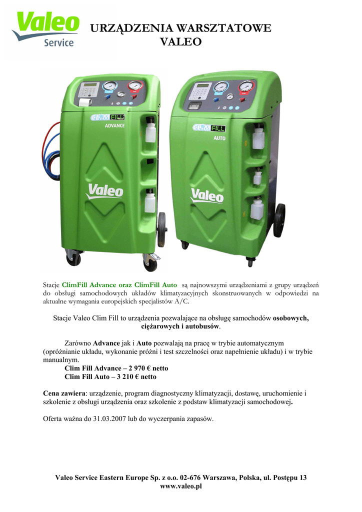 URZĄDZENIA WARSZTATOWE VALEO Stacje ClimFill Advance oraz ClimFill Auto są najnowszymi urządzeniami z grupy urządzeń do obsługi samochodowych układów klimatyzacyjnych skonstruowanych w odpowiedzi na aktualne wymagania europejskich specjalistów A/C. Stacje Valeo Clim Fill to urządzenia pozwalające na obsługę samochodów osobowych, ciężarowych i autobusów. Zarówno Advance jak i Auto pozwalają na pracę w trybie automatycznym (opróżnianie układu, wykonanie próżni i test szczelności oraz napełnienie układu) i w trybie manualnym. Clim Fill Advance – 2 970 € netto Clim Fill Auto – 3 210 € netto Cena zawiera: urządzenie, program diagnostyczny klimatyzacji, dostawę, uruchomienie i szkolenie z obsługi urządzenia oraz szkolenie z podstaw klimatyzacji samochodowej. Oferta ważna do 31.03.2007 lub do wyczerpania zapasów. Valeo Service Eastern Europe Sp. z o.o. 02-676 Warszawa, Polska, ul. Postępu 13 www.valeo.pl URZĄDZENIA WARSZTATOWE VALEO Urządzenie uniwersalne: Stacje obsługują samochody osobowe, ciężarowe i autobusy. Obsługa w języku polskim: Proste i przejrzyste komunikaty ułatwiają pracę z urządzeniem. Dzięki temu praca jest łatwa i przyjemna. Baza danych: Zawiera dane ponad 3300 modeli samochodów pozwalając na szybkie wykonanie usługi. Możliwe jest dodawanie do bazy pojazdów zdefiniowanych przez użytkownika. Wydajna pompa próżniowa Dzięki najbardziej wydajnej na rynku pompie próżniowej (180 l/min) można wykonać obsługę szybciej i efektywniej. Pozwala na dokładne osuszenie układu. Pojemny zbiornik płynu chłodniczego Pozwala na dłuższą pracę bez konieczności ponownego doładowania, co jest szczególnie przydatne podczas obsługi samochodów ciężarowych i autobusów. Drukarka w standardzie Umożliwia wydruk zawierający dane warsztatu, dane samochodu, dane klienta. Możliwość rozbudowy: Urządzenie współpracuje z przystawką do płukania. Oprogramowanie można rozszerzyć o moduł diagnostyczny pozwalający na diagnozowanie usterek klimatyzacji. Referencja Dane techniczne & wyposażenie Typ stosowanego czynnika chłodzącego Tryb obsługi Odzyskiwanie czynnika Regeneracja czynnika Odzyskiwanie i separacja oleju Wytwarzanie próżni Dozowanie oleju Dozowanie czynnika Pojemność zbiornika czynnika chłdzącego Sprężarka Filtr osuszający Skraplacz Wydajność pompy próżniowej Przewody serwisowe Drukarka termiczna Dodatkowe przewody serwisowe (2,44 m) Możliwość dozowania kontrastu 500 ml pojemnik na olej do ciężarówek Oprogramowanie do płukania układu Przystawka do płukania układu Max ciśnienie Wyświetlacz Sterowanie Klawiatura Baza danych Specjalna baza danych OE Edytowalna baza danych Możliwość uakatualniania bazy danych Manometry HP, LP Manometr ciśnienia w zbiorniku Elektroniczna kontrola szzcelności Gwarancja 699965 ClimFill ADVANCE R134a Manualny i automatyczny Automatyczne Manualny i automatyczny Automatyczna z kontrolą wzrokową Automatyczne z pomiarem czasu Manualne z kontrolą wzrokową Automatyczne ze skalą elektroniczną 20 kg 500 gr/min Przepływowy 710cc Z podwójnym wentylatorem 180 l/min SAE J2196, dł. 2,44 m z szybkozłączami Standard Nie dostępne Opcja Opcja Opcja Opcja 15 barów 80 znakowy LCD Mikroprocesor z 4 Mb pamięcią Alfanumeryczna + klawisze funkcyjne Standardowa baza danych zapisana w pamięci Opcja Standard Smart Cartridge Klasa 1, Bar, PSI, °C Tak Tak 12 m-cy 699966 ClimFill AUTO R134a Manualny i automatyczny Automatyczne Manualny i automatyczny Automatyczna ze skalą elektroniczną Automatyczne z pomiarem czasu Automatyczne ze skalą elektroniczną Automatyczne ze skalą elektroniczną 20 kg 500 gr/min Przepływowy 710cc Z podwójnym wentylatorem 180 l/min SAE J2196, dł. 2,44 m z szybkozłączami Standard Opcja Standard Opcja Opcja Opcja 15 barów 80 znakowy LCD Mikroprocesor z 4 Mb pamięcią Alfanumeryczna + klawisze funkcyjne Standardowa baza danych zapisana w pamięci Opcja Standard Smart Cartridge Klasa 1, Bar, PSI, °C Tak Tak 12 m-cy Valeo Service Eastern Europe Sp. z o.o. 02-676 Warszawa, Polska, ul. Postępu 13 www.valeo.pl