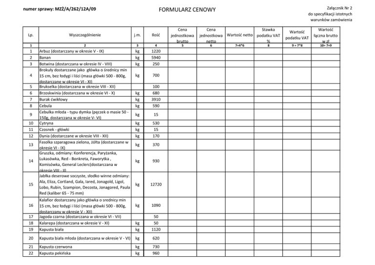 numer sprawy: MZŻ/A/262/12A/09 Lp. Wyszczególnienie j.m. Ilośd Cena jednostkowa brutto 5 1 2 3 4 1 2 3 Arbuz (dostarczany w okresie V - IX) Banan Botwina (dostarczana w okresie IV - VIII) Brokuły dostarczane jako główka o średnicy min 15 cm, bez łodygi i liści (masa główki 500 - 800g, dostarczane w okresie VI - XI) Brukselka (dostarczana w okresie VIII - XII) Brzoskwinia (dostarczana w okresie VI - X) Burak dwikłowy Cebula Cebulka młoda - typu dymka (pęczek o masie 50 150g, dostarczana w okresie V- VI) Cytryna Czosnek - główki Dynia (dostarczane w okresie VIII - XII) Fasolka szparagowa zielona, żółta (dostarczane w okresie VI - IX) Gruszka, odmiany: Konferencja, Paryżanka, Lukasówka, Red - Bonkreta, Faworytka , Komisówka, General Leclerc(dostarczana w okresie VIII - II) Jabłka deserowe soczyste, słodko winne odmiany: Ala, Eliza, Cortland, Gala, Iared, Jonagold, Ligol, Lobo, Rubin, Szampion, Decosta, Jonagored, Paula Red (kaliber 65 - 75 mm) kg kg kg 1220 5940 250 kg 700 kg kg kg 100 680 3910 590 kg 15 kg kg kg 530 15 170 kg 370 kg 930 kg 12720 kg 1090 kg kg 50 50 1120 4 5 6 7 8 9 10 11 12 13 14 15 17 18 19 Kalafior dostarczany jako główka o srednicy min 15 cm, bez łodygi i liści (masa główki 500 - 800g, dostarczany w okresie V - XII) Jagoda czarna (dostarczana w okresie VI - VII) Kalarepa (dostarczana w okresie V - XI) Kapusta biała 20 Kapusta biała młoda (dostarczana w okresie V - VI) kg 620 21 22 Kapusta czerwona Kapusta pekioska kg kg 730 960 16 Załącznik Nr 2 do specyfikacji istotnych warunków zamówienia FORMULARZ CENOWY Cena Stawka jednostkowa Wartośd netto podatku VAT netto % 6 7=4*6 8 Wartośd podatku VAT Wartośd łączna brutto w zł 9 = 7*8 10= 7+9 numer sprawy: MZŻ/A/262/12A/09 Lp. Wyszczególnienie j.m. Ilośd Cena jednostkowa brutto 5 1 2 3 4 23 Kapusta włoska Koper (dostarczany w pęczkach o masie 15 - 20g bez łodyg) Malina (dostarczane w okresie VI - XI) Owoce cytrusowe - mandarynka (dostarczane w okresie IX- IV) Owoce cytrusowe - pomaraocze (dostarczane w okresie IX- IV) Owoce cytrusowe - kiwi Marchew odmiany : Karotka, Karina, Atol, Polka, Koral, Dolanka, Amsterdamska, Lenka, Selecta, Fantazja, Perfekcja, Regulska Marchew wczesna bez naci (dostarczana w okresie VI- VII) Nad pietruszki (dostarczany w pęczkach o masie 20 - 30g bez łodyg) Nektarynka (dostarczana w okresie VI - I) Ogórek zielony szklarniowy- nowalijki (dostarczany w okresie V - VIII) Ogórek zielony - długi, wężowy, szklarniowy (dostarczany w okresie IX - IV) Papryka czerwona, zielona (dostarczana w okresie IX- III) Pieczarka uprawna Pietruszka korzeniowa Pietruszka wczesna (dostarczana w peczkach korzeo wraz z natką w okresie VI- VIII) Pomidor Por Rzodkiewka (dostarczana w pęczkach bez liści o masie 150 - 250g) Sałata masłowa (masa główki 150 - 200g) Sałata lodowa Seler korzeniowy Seler korzeniowy młody (dostarczany w okresie VI VII) kg 360 kg 300 kg 200 kg 550 kg 520 kg 560 kg 10400 kg 1390 kg 280 kg 700 kg 1230 kg 260 kg 110 kg kg 50 2770 kg 320 kg kg 2470 1180 kg 640 kg kg kg 220 15 2380 kg 205 24 25 26 27 28 29 30 31 32 33 34 35 36 37 38 39 40 41 42 43 44 45 Załącznik Nr 2 do specyfikacji istotnych warunków zamówienia FORMULARZ CENOWY Cena Stawka jednostkowa Wartośd netto podatku VAT netto % 6 7=4*6 8 Wartośd podatku VAT Wartośd łączna brutto w zł 9 = 7*8 10= 7+9 numer sprawy: MZŻ/A/262/12A/09 Lp. 1 46 47 48 49 50 51 52 53 54 Wyszczególnienie j.m. Ilośd Cena jednostkowa brutto 2 3 4 5 kg 230 kg 515 kg 885 kg 350 kg 2720 szt 480 kg kg kg 24000 3500 3425 Szczypiorek świeży, cienkolistny (w pęczkach o masie 20 - 50g) Śliwka odmiany:Węgierka zwykła, Węgierka Dąbrowicka, Cacanska Rana, President, Elena Bluefre, Brzoskwiniowa, Stanley, (dostarczana w okresie VIII - XI) Truskawki (dostarczane w okresie VI - VII) Wiśnia odmiany: Szklanka, Lucyna, Łutówka, Nefris, North Star,(dostarczana w okresie VII - VIII) Włoszczyzna Włoszczyzna młoda (dostarczana w okresie VI VII) Ziemniaki późne (dostarczane w okresie I - IV) Ziemniaki młode (dostarczane w okresie V - VI) Ziemniaki Irga (dostarczane w okresie VII - XII) Załącznik Nr 2 do specyfikacji istotnych warunków zamówienia FORMULARZ CENOWY Cena Stawka jednostkowa Wartośd netto podatku VAT netto % 6 7=4*6 Uwagi: pozycje asortymentowe przy których nie podano okresu dostaw dostępne przez cały okres trwania umowy. Jakość wyżej wymienionych warzyw i owoców świeżych nie może odbiegać od polskich norm dla klasy jakościowej I. Odmiany jednorodne przy każdorazowej dostawie, tj. tego samego pochodzenia, tej samej jakości i odmiany (typu). Cechy dyskwalifikujące (wady) warzywa i owoce: •zanieczyszczenie środkami ochrony roślin, pozostałości środki ochrony roślin •zaparzenie i zapleśnienie, •obce zapach,smak •zamarznięcie, przemarznięcie •obecność szkodników i ich pozostałości, obecność uszkodzeń spowodowanych przez szkodniki •nadgnicie, zgnicie •nadmierne zawilgocenie powierzchni •nadmierne zabrudzenie ziemią 8 Wartośd podatku VAT Wartośd łączna brutto w zł 9 = 7*8 10= 7+9 numer sprawy: MZŻ/A/262/12A/09 Załącznik Nr 2 do specyfikacji istotnych warunków zamówienia FORMULARZ CENOWY Termin przydatności do spożycia co najmniej 14 dni. Poszczególne pozycje asortymentowe dostarczane będą w ilościach określonych przez zamawiającego. Towar dostarczany będzie w opakowaniach: •z materiału dopuszczonego do kontaktu z żywnościa, •wolnych od ciał obcych, •widoczna część zawartości opakowania musi być reprezentatywna dla dla całej zawartości opakowania Do każdej partii towaru powinien dostarczony być do wglądu : atest, certyfikat, nazwa odmiany. Wartośd oferty netto ………………………………………………………………. Zł (słownie …………………………………………………………………………………………………………zł) Wartośd podatku VAT ………………