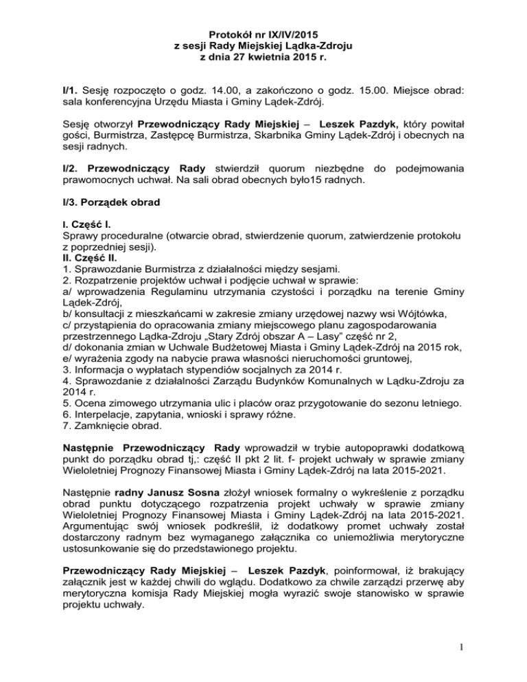 Protokół nr IX/IV/2015 z sesji Rady Miejskiej Lądka-Zdroju z dnia 27 kwietnia 2015 r. I/1. Sesję rozpoczęto o godz. 14.00, a zakończono o godz. 15.00. Miejsce obrad: sala konferencyjna Urzędu Miasta i Gminy Lądek-Zdrój. Sesję otworzył Przewodniczący Rady Miejskiej – Leszek Pazdyk, który powitał gości, Burmistrza, Zastępcę Burmistrza, Skarbnika Gminy Lądek-Zdrój i obecnych na sesji radnych. I/2. Przewodniczący Rady stwierdził quorum niezbędne do podejmowania prawomocnych uchwał. Na sali obrad obecnych było15 radnych. I/3. Porządek obrad I. Część I. Sprawy proceduralne (otwarcie obrad, stwierdzenie quorum, zatwierdzenie protokołu z poprzedniej sesji). II. Część II. 1. Sprawozdanie Burmistrza z działalności między sesjami. 2. Rozpatrzenie projektów uchwał i podjęcie uchwał w sprawie: a/ wprowadzenia Regulaminu utrzymania czystości i porządku na terenie Gminy Lądek-Zdrój, b/ konsultacji z mieszkańcami w zakresie zmiany urzędowej nazwy wsi Wójtówka, c/ przystąpienia do opracowania zmiany miejscowego planu zagospodarowania przestrzennego Lądka-Zdroju „Stary Zdrój obszar A – Lasy” część nr 2, d/ dokonania zmian w Uchwale Budżetowej Miasta i Gminy Lądek-Zdrój na 2015 rok, e/ wyrażenia zgody na nabycie prawa własności nieruchomości gruntowej, 3. Informacja o wypłatach stypendiów socjalnych za 2014 r. 4. Sprawozdanie z działalności Zarządu Budynków Komunalnych w Lądku-Zdroju za 2014 r. 5. Ocena zimowego utrzymania ulic i placów oraz przygotowanie do sezonu letniego. 6. Interpelacje, zapytania, wnioski i sprawy różne. 7. Zamknięcie obrad. Następnie Przewodniczący Rady wprowadził w trybie autopoprawki dodatkową punkt do porządku obrad tj,: część II pkt 2 lit. f- projekt uchwały w sprawie zmiany Wieloletniej Prognozy Finansowej Miasta i Gminy Lądek-Zdrój na lata 2015-2021. Następnie radny Janusz Sosna złożył wniosek formalny o wykreślenie z porządku obrad punktu dotyczącego rozpatrzenia projekt uchwały w sprawie zmiany Wieloletniej Prognozy Finansowej Miasta i Gminy Lądek-Zdrój na lata 2015-2021. Argumentując swój wniosek podkreślił, iż dodatkowy promet uchwały został dostarczony radnym bez wymaganego załącznika co uniemożliwia merytoryczne ustosunkowanie się do przedstawionego projektu. Przewodniczący Rady Miejskiej – Leszek Pazdyk, poinformował, iż brakujący załącznik jest w każdej chwili do wglądu. Dodatkowo za chwile zarządzi przerwę aby merytoryczna komisja Rady Miejskiej mogła wyrazić swoje stanowisko w sprawie projektu uchwały. 1 Skarbnik Gminy Wioletta Drangowska poinformowała, że zmiana w wieloletniej prognozie finansowej dotyczą inwestycji związanej z budową przedszkola oraz przygotowaniem planu zagospodarowania przestrzennego. Radny Janusz Sosna w dalszym ciągu podtrzymał swój wniosek formalny. Przewodniczący Rady Miejskiej – Leszek Pazdyk ogłosił 10 min. przerwę. Po przerwie Przewodniczący Rady Miejskiej – Leszek Pazdyk poddał pod głosowanie wniosek formalny w sprawie zmiany porządku obrad przez wykreślenie punktu pkt 2 lit. f- projekt uchwały w sprawie zmiany Wieloletniej Prognozy Finansowej Miasta i Gminy Lądek-Zdrój na lata 2015-2021. W wyniku głosowania przy 5 głosach „za”, 9 głosach „przeciw” i 1 głosie „wstrzymującym się”, Rada Miejska odrzuciła wniosek formalny o zmianę porządku obrad. I/3. Zatwierdzenie protokołów z poprzednich sesji. Przewodniczący Rady – Leszek Pazdyk poddał pod głosowanie protokół z poprzedniej sesji. W wyniku głosowania przy 13 głosach „za”, 2 głosach „przeciw”, Rada Miejska przyjęła protokół z poprzedniej sesji. II/1. Sprawozdanie Burmistrza z działalności między sesjami. Burmistrz Roman Kaczmarczyk zwracając się do Przewodniczącego i Wysokiej Rady poinformował o sprawach, które miały miejsce w okresie między sesjami. Burmistrz wymienił cztery najważniejsze sprawy, mianowicie: - spotkanie z mieszkańcami gminy z okazji 100 dni urzędowania, które odbyło się w Centrum Kultury i Rekreacji w Lądku-Zdroju, - powołanie nowego dyrektora Centrum Kultury i Rekreacji w Lądku-Zdroju. Został nim Paweł Pawlik, powołany na okres 3 lat od dnia 1 maja 2015 r., - obecność na spotkaniu Stowarzyszenia Gmin Ziemi Kłodzkiej, na którym omawiano min. możliwości pozyskiwania środków zewnętrznych na zadania własne gmin. Przy kolejnych naborach wniosków, preferowane będą gminy uzdrowiskowe, - stan techniczny ratusza w Lądku-Zdroju. Budynek nadaje się do natychmiastowego remontu, szczególnie remontu wymaga wieża ratuszowa. W chwili obecnej jest to najważniejsza inwestycja gminna. II/2 Rozpatrzenie projektów uchwał i podjęcie uchwał w sprawie: a/ wprowadzenia Regulaminu utrzymania czystości i porządku na terenie Gminy Lądek-Zdrój. Przewodniczący Komisji ds. Gospodarczych- Janusz Sosna poinformował, że Komisja ds. Gospodarczych pozytywnie zaopiniowała projekt uchwały. Przewodniczący Rady Miejskiej poddał pod głosowanie projekt uchwały. W wyniku głosowania przy 15 głosach „za”, Rada Miejska podjęła uchwałę nr IX/52/15, która stanowi załącznik do protokołu z sesji. b/ konsultacji z mieszkańcami w zakresie zmiany urzędowej nazwy wsi Wójtówka. Przewodnicząca Komisji ds. Społecznych- Dorota Urbańczyk poinformowała, że Komisja ds. Społecznych pozytywnie zaopiniowała projekt uchwały. 2 Przewodniczący Rady Miejskiej poddał pod głosowanie projekt uchwały. W wyniku głosowania przy 14 głosach „za”, jednym głosie „wstrzymującym się”, Rada Miejska podjęła uchwałę nr IX/53/15, która stanowi załącznik do protokołu z sesji. do opracowania zmiany miejscowego planu c/ przystąpienia zagospodarowania przestrzennego Lądka-Zdroju „Stary Zdrój obszar A – Lasy” część nr 2. Przewodniczący Komisji ds. Gospodarczych- Janusz Sosna poinformował, że Komisja ds. Gospodarczych pozytywnie zaopiniowała proje
