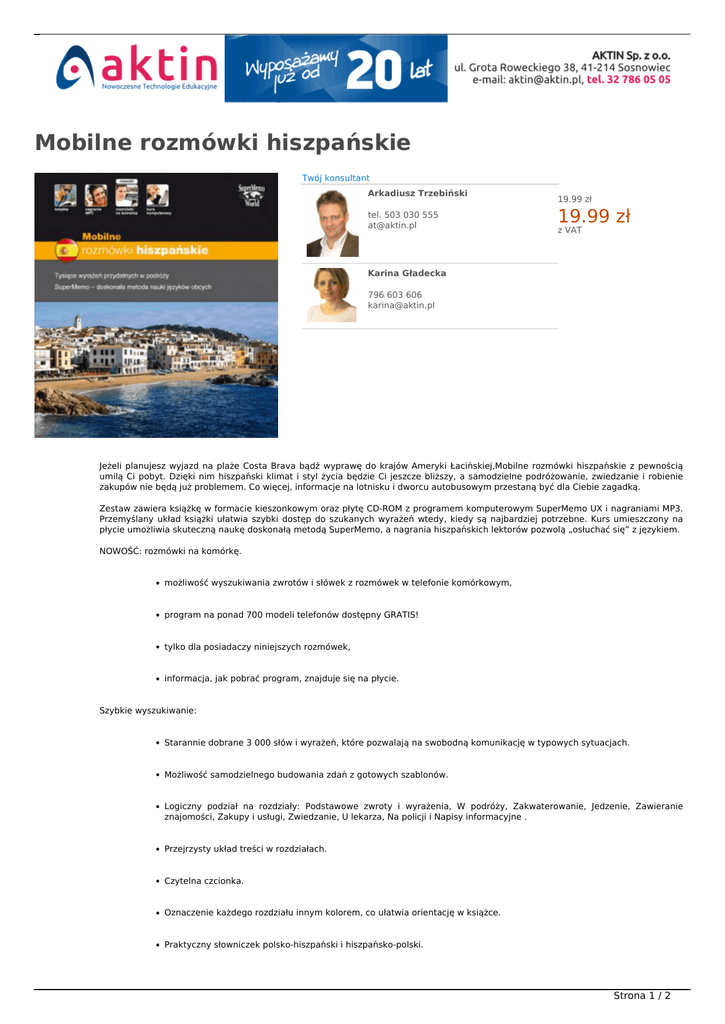 Mobilne rozmówki hiszpańskie Twój konsultant Arkadiusz Trzebiński tel. 503 030 555 [email protected] NOWOŚĆ W OFERCIE 19.99 zł 19.99 zł z VAT Karina Gładecka 796 603 606 [email protected] Jeżeli planujesz wyjazd na plaże Costa Brava bądź wyprawę do krajów Ameryki Łacińskiej,Mobilne rozmówki hiszpańskie z pewnością umilą Ci pobyt. Dzięki nim hiszpański klimat i styl życia będzie Ci jeszcze bliższy, a samodzielne podróżowanie, zwiedzanie i robienie zakupów nie będą już problemem. Co więcej, informacje na lotnisku i dworcu autobusowym przestaną być dla Ciebie zagadką. Zestaw zawiera książkę w formacie kieszonkowym oraz płytę CD-ROM z programem komputerowym SuperMemo UX i nagraniami MP3. Przemyślany układ książki ułatwia szybki dostęp do szukanych wyrażeń wtedy, kiedy są najbardziej potrzebne. Kurs umieszczony na płycie umożliwia skuteczną naukę doskonałą metodą SuperMemo, a nagrania hiszpańskich lektorów pozwolą „osłuchać się” z językiem. NOWOŚĆ: rozmówki na komórkę. możliwość wyszukiwania zwrotów i słówek z rozmówek w telefonie komórkowym, program na ponad 700 modeli telefonów dostępny GRATIS! tylko dla posiadaczy niniejszych rozmówek, informacja, jak pobrać program, znajduje się na płycie. Szybkie wyszukiwanie: Starannie dobrane 3 000 słów i wyrażeń, które pozwalają na swobodną komunikację w typowych sytuacjach. Możliwość samodzielnego budowania zdań z gotowych szablonów. Logiczny podział na rozdziały: Podstawowe zwroty i wyrażenia, W podróży, Zakwaterowanie, Jedzenie, Zawieranie znajomości, Zakupy i usługi, Zwiedzanie, U lekarza, Na policji i Napisy informacyjne . Przejrzysty układ treści w rozdziałach. Czytelna czcionka. Oznaczenie każdego rozdziału innym kolorem, co ułatwia orientację w książce. Praktyczny słowniczek polsko-hiszpański i hiszpańsko-polski. Strona 1 / 2 Skuteczna nauka: Doskonały program komputerowy SuperMemo UX do nauki słownictwa zawartego w książce na dołączonej płycie CD-ROM. Pozwala opanować cały materiał rozmówek nawet w ciągu jednego miesiąca dzięki genialnej metodzie optymalizacji powtórek. Pliki MP3 z nagraniami wszystkich słów i wyrażeń, wykonane przez profesjonalnych lektorów polskich i hiszpańskich. Można je wgrać na odtwarzacz MP3, iPod®, komórkę lub komputer, aby słuchać i powtarzać w dowolnej chwili. Ponad 6 godzin nagrań! Prosty przewodnik ułatwiający zapamiętywanie uznaną metodą SuperMemo, do wykorzystania bez użycia komputera. Wymagania sprzętowe programu: Procesor 400 MHz, 256 MB RAM, CD-ROM, karta dźwiękowa, mikrofon, Windows 2000 SP3, XP lub Vista. Wymagania sprzętowe dla nagrań MP3: dowolny odtwarzacz MP3. Informacje dodatkowe: 224 strony, 14 x 10 cm, oprawa miękka, lakierowana. Strona 2 / 2 Powered by TCPDF (www.tcpdf.org)
