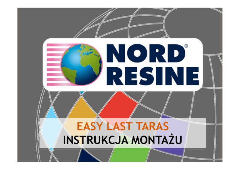 EASY LAST TARAS INSTRUKCJA MONTAŻU 1. Przygotowanie podłoża 2.Przygotowanie produktu 3.Aplikacja produktu 1. Przygotowanie podłoża 2.Przygotowanie produktu 3.Aplikacja produktu Reprofilacja podłoża oraz uzupełnienie istniejących ubytków; Wykonanie odpowiednich spadków; Służące produkty • Grove Primer – mostek szczepny • Grove Massetto – jastrych do wykonania spadków od 1 mm do 10 cm w jednej warstwie • Grove 30 – zaprawa do wyrównania powierzchni do 30 mm w jednej warstwie Osadzanie wpustów, odpływów itp... Uszczelnienia obwodowe pionpoziom oraz obróbki blacharskiej; Uszczelnienie i zabezpieczenie dylatacji i innych łączeń; Służące produkty BETONSEAL MS 2.0 – uszczelniacz polimerowy w kolorze białym lub jasno szarym BETONSEAL PRIMER – podkład pod uszczelniacz polimerowy na pory zamknięte (blacha, metal, tworzywo sztuczne) NORPHEN FONDO IGRO – podkład pod uszczelniacz polimerowy na pory otwarte (powierzchnie mineralne) 1. Przygotowanie podłoża 2.Przygotowanie produktu 3.Aplikacja produktu 1. EASY LAST 90 jest jednoskładnikowym produktem gotowym do użycia. Pakowany w 5 i 20 kilogramowe wiaderka. Po otwarciu opakowania należy dokładnie przemieszać zawartość mieszadłem mechanicznym na niskich obrotach. 2. Dodatkowo jeśli chcemy wykonać izolację na sposób samorozlewny dodajemy do opakowania EASY LAST 90 produkt o nazwie EASY LAST FLUID (na 5 kg – opakowanie 0,35 kg; na 20 kg – opakowanie 1,4 kg). Po dodaniu EASY LAST FLUID należy całość dokładnie przemieszać mechanicznie. 3. Jeśli chcemy zastosować EASY LAST 90 na powierzchnie pionowe analogicznie dodajemy do produktu dodatek o nazwie EASY LAST THICKENER (na 5 kg – opakowanie 0,2 kg; na 20 kg – opakowanie 0,8 kg). 1. Przygotowanie podłoża 2.Przygotowanie produktu 3.Aplikacja produktu 1. Po przygotowaniu mieszanki EASY LAST 90 wraz z dodatkiem EASY LAST THICKENER należy przy pomocy pędzla/wałka wykonać powierzchnie pionowe nanosząc odpowiednią ilość produktu (ok 0,8 kg/m2). 2. Przy użyciu pacy stalowej wykonujemy pierwszą warstwę produktem EASY LAST 90 bezpośrednio na suchym i czystym podłożu (wilgotność maksymalna 6%). 3. Po całkowitym utwardzeniu (ok 10-12h) powierzchnia nadaje się do wykonania kolejnej warstwy. 4. Powtarzamy poprzednią czynność tak, by powstała powłoka całkowicie hydroszczelna – minimalne wymagane całkowite zużycie produktu EASY LAST 90 to 1,6 kg/m2. 5. Ostatnia warstwa produktu EASY LAST 90 to warstwa szczepna, która zostanie na świeżo obsypana piaskiem ceramicznym. Dlatego zaleca się naniesienie minimalnej warstwy EASY LAST 90 wraz z EASY LAST FLUID przy użyciu wałka. 6. Obsypanie piaskiem należy wykonać do 15 min od nałożenie warstwy szczepnej. Po pełnym utwardzeniu zamiatamy całą powierzchnię. Nadmiar piasku zebrany na tym etapie nadaje się do ponownego użycia. 7. Na koniec należy delikatnie przeszlifować całą powierzchnię papierem ściernym (o uziarnieniu 36-40), a następnie odkurzyć odkurzaczem przemysłowym całą powierzchnie. Kolory piasków ceramicznych Kolory piasków ceramicznych 8. Przed przystąpieniem do nałożenia finalnej warstwy należy rozmieszać dwuskładnikową żywicę poliuretanową EASY LAST COAT TRASPARENTE. Do składnika A wlewamy składnik B i mieszamy mieszadłem na niskich obrotach przez około 2 min. Czas przydatności do użycia to około 25 minut. W przypadku częściowego zastosowanie produktu należy zawsze posługiwać się wagą elektroniczną i przestrzegać wskazanych proporcji mieszania (2:1) 9. Żywicę rozprowadzamy po powierzchni gumową pacą, która gwarantuje zastosowanie odpowiedniej ilości żywicy, tak by piasek został zatopiony oraz by uzyskać warstwę antypoślizgową. Powłoka finalna Powłoka finalna Dziękujemy za zainteresowanie. Prosimy o zapoznanie się ze szczegółowymi informacjami w kartach technicznych przedstawionych produktów dostępnych na www.nordresine.pl