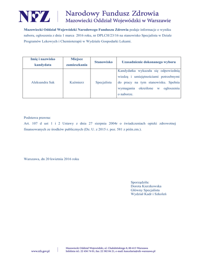 Mazowiecki Oddział Wojewódzki Narodowego Funduszu Zdrowia podaje informacje o wyniku naboru, ogłoszenia z dnia 1 marca 2016 roku, nr DPLCH/23/16 na stanowisko Specjalista w Dziale Programów Lekowych i Chemioterapii w Wydziale Gospodarki Lekami. Imię i nazwisko Miejsce kandydata zamieszkania Stanowisko Uzasadnienie dokonanego wyboru Kandydatka wykazała się odpowiednią wiedzą i umiejętnościami potrzebnymi Aleksandra Sak Kaźmierz Specjalista do pracy na tym stanowisku. Spełnia wymagania określone w ogłoszeniu o naborze. Podstawa prawna: Art. 107 d ust 1 i 2 Ustawy z dnia 27 sierpnia 2004r o świadczeniach opieki zdrowotnej finansowanych ze środków publicznych (Dz. U. z 2015 r. poz. 581 z późn.zm.). Warszawa, dn 20 kwietnia 2016 roku Sporządziła: Dorota Kierzkowska Główny Specjalista Wydział Kadr i Szkoleń