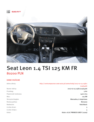 Seat Leon 1.4 TSI 125 KM FR 80200 PLN DANE OGÓLNE Adres oferty: http://centrumpoznan.seat-auto.pl/samochody/2017-02-15-14871 71465466 Numer oferty: Przebieg: Pojemność skokowa: Moc: Skrzynia biegów: Rodzaj paliwa: Nadwozie: 2017-02-15-1487171465466 5 km 1400 cm3 125 KM Manualna, 6 stopniowa Benzyna Hatchback Liczba drzwi: 5 Liczba miejsc: 5 Kolor: Kolor: 0C0C PIRINEOS GREY ( szary) Rok produkcji: 2017 WYPOSAŻENIE / ABS / Alufelgi / ASR (kontrola trakcji) / Bluetooth / Centralny zamek / Czujnik deszczu / Czujnik zmierzchu / Czujniki parkowania przednie / Czujniki parkowania tylne / Elektrochromatyczne lusterko wsteczne / Elektryczne szyby przednie / Elektryczne szyby tylne / Elektrycznie ustawiane lusterka / ESP (stabilizacja toru jazdy) / Gniazdo AUX / Gniazdo SD / Gniazdo USB / Immobilizer / Isofix / Klimatyzacja automatyczna / Klimatyzacja dwustrefowa / Komputer pokładowy / Kurtyny powietrzne / MP3 / Nawigacja GPS / Podgrzewane lusterka boczne / Podgrzewane przednie siedzenia / Poduszka powietrzna chroniąca kolana / Poduszka powietrzna kierowcy / Poduszka powietrzna pasażera / Poduszki boczne przednie / Przyciemniane szyby / Radio fabryczne / Regulowane zawieszenie / Światła do jazdy dziennej / Światła LED / Światła przeciwmgielne / Światła Xenonowe / System Start-Stop / Tempomat / Wielofunkcyjna kierownica / Wspomaganie kierownicy OPIS AUTORYZOWANY DEALER SEAT CENTRUM POZNAŃ Poznań-Komorniki ul. Głogowska/ J. Wajsówny 9 Tel.: + 4861832250 CENA katalogowa: 91 256,00 PLN RABAT: 11 056 PLN CENA po rabacie: 80 200,00 PLN* *specjalna oferta dla firm Seat Leon FR 1.4 TSI 125 KM (Skrzynia manualna 6-cio stopniowa) Kolor: 0C0C PIRINEOS GREY ( szary) Rok produkcji: 2017 4 LATA GWARANCJI FABRYCZNEJ W STANDARDZIE PK2 - Czujniki parkowania z przodu i z tyłu ZN1 + PZ1 - Nawigacja satelitarna z 8-calowym kolorowym ekranem dotykowym PNC - SEAT Sound System: 9 głośników i subwoofer PLP - Pakiet diodowego oświetlenia wnętrza: oświetlenie bagażnika w technologii LED Lampki LED do czytania z przodu, oświetlenie przestrzeni na nogi, lampki LED przy osłonach przeciwsłonecznych WYPOSAŻENIE STANDARDOWE: WNĘTRZE: - Automatyczna klimatyzacja dwustrefowa (Climatronic) z funkcją AirCare - Komputer pokładowy - 3,5-calowy monochromatyczny wyświetlacz (ze wskaźnikiem temperatury na zewnątrz pojazdu) - Media System Plus: 8-calowy kolorowy ekran dotykowy z czujnikiem zbliżeniowym, radio FM z CD/ MP3/ WMA, złącza USB z obsługą urządzeń Apple (x2), SD, Aux-in, 8 głośników, bluetooth (strumieniowe przesyłanie muzyki i prowadzenie rozmów telefonicznych), funkcja rozpoznawania mowy i sterowania głosem - Kierownica wielofunkcyjna obszyta skórą - Zróżnicowane wykończenie wnętrza (kolor i wykończenie + zestaw wskaźników 3D + pakiet chromowany) - Pakiet praktyczny: czujnik deszczu, czujnik zmierzchu (automatyczne światła), automatyczna funkcja opóźnionego wyłączania świateł Coming and Leaving Home, automatycznie ściemniające się lusterko wsteczne ELEKTRONIKA: - Elektrycznie regulowane, podgrzewane i składane lusterka boczne - Tempomat - ASR + ABS + XDS - Asystent Podjazdu (Hill Hold Control) - Funkcja Coming Home (włączana ręcznie) - Przednie światła przeciwmgielne z funkcją doświetlania zakrętów NADWOZIE: - Światła do jazdy dziennej LED - Pakiet Full LED: pełne przednie światła LED z funkcją świateł autostradowych, pełne tylne światła LED z oświetleniem tablicy rejestracyjnej w technologii LED, światła do jazdy dziennej LED, przednie światła przeciwmgielne LED z funkcją doświetlania zakrętów - 16-calowe aluminiowe felgi Design 30/2 - Sportowe zawieszenie typu FR BEZPIECZEŃSTWO: - 7 poduszek powietrznych (2 przednie, 2 boczne i 2 kurtynowe + poduszka chroniąca kolana) z systemem dezaktywacji poduszki pasażera - 4 zaczepy iSOFIX do mocowania fotelika dla dziecka (2 tylne siedzenia), 2 górne pasy mocujące w systemie iSOFIX na tylnych siedzeniach - ESC z ABS, ASR, EBA i system kontroli ciśnienia powietrza w oponach - Elektromechaniczny hamulec postojowy z Asystentem podjazdu i zatrzymania (Auto Hold) - XDS - Elektroniczna blokada mechanizmu różnicowego - Zaczepy iSOFIX i Top Tether przy tylnych siedzeniach (dla 2 fotelików dziecięcych) - Zagłówek fotela kierowcy i pasażera z systemem WOKS - Automatyczny hamulec pokolizyjny ograniczający skutki kolejnych kolizji (Multi Collision Brake) Zapytaj sprzedawcę o szczegóły oferty: Marcin Domagała GSM: + 48 785 505 7 25 Tel.: + 48 61 832 72 61 e-mail: marcin.domagala(at)centrumpoznan.pl Grzegorz Jarmurz GSM: +48 785 502 8 59 Tel.: +48 61 832 72 63 e-mail: grzegorz.jarmurz(at)centrumpoznan.pl Mikołaj Ratajszczak GSM: + 48 601 257 3 17 Tel.: + 48 61 832 72 62 e-mail: mikolaj.ratajszczak(at)centrumpoznan.pl SPECJALNA OFERTA DLA FIRM I WYBRANYCH GRUP ZAWODOWYCH - SPRAWDŹ Wybierz promocyjne finansowanie: - KREDYT Moc Trzech Zer - KREDYT Moc niskich Rat 0% - LEASING 101,99% - LEASING Moc Niskich Rat ==PRZYJMUJEMY SAMOCHODY UŻYWANE W ROZLICZENIU== CENTRUM POZNAŃ Poznań-Komorniki ul. Głogowska/ J. Wajsówny 9 Tel.: +48 61 832725 0 GPS: 52.360381,16.849849 Przedstawione w treści ogłoszenia informacje są wyłącznie informacją handlową oraz nie stanowią oferty w rozumieniu art. 66 kodeksu cywilnego. 28727