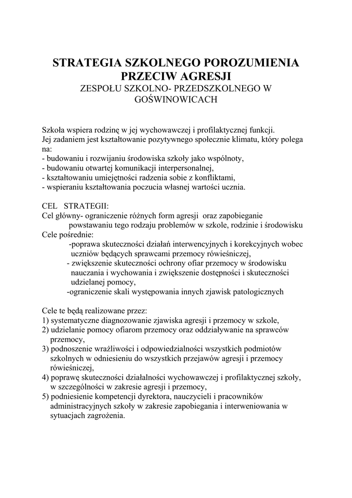 STRATEGIA SZKOLNEGO POROZUMIENIA PRZECIW AGRESJI ZESPOŁU SZKOLNO- PRZEDSZKOLNEGO W GOŚWINOWICACH Szkoła wspiera rodzinę w jej wychowawczej i profilaktycznej funkcji. Jej zadaniem jest kształtowanie pozytywnego społecznie klimatu, który polega na: - budowaniu i rozwijaniu środowiska szkoły jako wspólnoty, - budowaniu otwartej komunikacji interpersonalnej, - kształtowaniu umiejętności radzenia sobie z konfliktami, - wspieraniu kształtowania poczucia własnej wartości ucznia. CEL STRATEGII: Cel główny- ograniczenie różnych form agresji oraz zapobieganie powstawaniu tego rodzaju problemów w szkole, rodzinie i środowisku Cele pośrednie: -poprawa skuteczności działań interwencyjnych i korekcyjnych wobec uczniów będących sprawcami przemocy rówieśniczej, - zwiększenie skuteczności ochrony ofiar przemocy w środowisku nauczania i wychowania i zwiększenie dostępności i skuteczności udzielanej pomocy, -ograniczenie skali występowania innych zjawisk patologicznych Cele te będą realizowane przez: 1) systematyczne diagnozowanie zjawiska agresji i przemocy w szkole, 2) udzielanie pomocy ofiarom przemocy oraz oddziaływanie na sprawców przemocy, 3) podnoszenie wrażliwości i odpowiedzialności wszystkich podmiotów szkolnych w odniesieniu do wszystkich przejawów agresji i przemocy rówieśniczej, 4) poprawę skuteczności działalności wychowawczej i profilaktycznej szkoły, w szczególności w zakresie agresji i przemocy, 5) podniesienie kompetencji dyrektora, nauczycieli i pracowników administracyjnych szkoły w zakresie zapobiegania i interweniowania w sytuacjach zagrożenia. Szkoła stanowi dobry teren skutecznych oddziaływań profilaktycznych, wpływających na całokształt funkcjonowania społecznego dzieci i młodzieży, ponieważ jest miejscem: -spotkania dzieci, młodzieży oraz osób dorosłych odpowiedzialnych za opiekę i wychowanie (rodzice i nauczyciele); -intensywnego rozwoju interpersonalnego i społecznego; -zadaniowej działalności uczniów; -konfrontacji autorytetów i kształtowania się poczucia własnej tożsamości ucznia; -wypełniania znacznej części aktywnego życia dzieci i młodzieży; -weryfikacji oczekiwań rodziców związanych z własnym dzieckiem. PODSTAWOWE ZASADY PROGRAMU: 1. Uświadomienie powagi problemu oraz uwarunkowania powodzenia podjętych działań od stopnia zaangażowania się wszystkich dorosłych. 2. Zainteresowanie i zaangażowanie w realizację działań przeciw agresji poprzez stworzenie ścisłej współpracy środowiska szkolnego i domowego. 3. Określenie jasnych granic nieakceptowanego zachowania z wykorzystaniem norm społecznych. 4. Posługiwanie się wypracowanymi w szkole procedurami postępowania w sytuacjach trudnych. Adresaci programu: 1) uczniowie szkoły, 2) dyrektor, nauczyciele i pracownicy administracyjni szkoły, 3) rodzice uczniów . Czas trwania programu Wychowanie jest z definicji procesem długofalowym, rozłożonym w czasie. Z tego względu realizację programu zaplanowano na lata 2007-2013 W roku 2007 przeprowadzone zostaną badania dotyczące występowania zjawiska agresji i przemocy w środowisku szkolnym. oraz działania o charakterze interwencyjnym. MAPA ZAGROŻEŃ: • Narastające patologie życia rodzinnego: alkoholizm rodziców i starszego rodzeństwa. • Brak właściwej opieki nad dziećmi: pozostawianie dzieci bez opieki oraz nieuzasadniona absencja uczniów. • Przerzucanie wielu problemów, które mogłyby być rozwiązywane w ramach pomocy rodzinnej czy sąsiedzkiej do sfery rozwiązań instytucjonalnych • Przenoszenie niewłaściwych relacji rodzinnych i sąsiedzkich na relacje koleżeńskie w szkole. • Spadek zainteresowania rodziców życiem szkolnym uczniów klas IV-VI. KIERUNKI DZIAŁAŃ: • Zacieśnić współprace z Ośrodkiem Pomocy Społecznej w Nysie, celem motywowania rodziców uczniów korzystających z pomocy społecznej do aktywności własnej w rozwiązywaniu problemów. • Wskazywać dzieciom sposoby szukania pomocy w przypadku skutków alkoholizmu w rodzinie • Spotkania Policji z rodzicami dotyczące odpowiedzialności za pozostawianie dzieci bez opieki. • Spotkania, warsztaty z psychologiem, pedagogiem na temat wpływu relacji między dorosłymi na zachowania dzieci w szkole. • Włączyć księdza proboszcza- jako sprzymierzeńca- do integracji środowiska przez uczenie przestrzegania norm oraz moralnej odpowiedzialności rodziców za zainteresowanie się życiem szkolnym dziecka. DZIAŁANIA PROGRAMOWE: NA POZIOMIE SZKOŁY 1. Analiza sytuacji (diagnoza wśród uczniów kl. I-VI) – ankiety, rozmowy. 2. Pedagogizacja rodziców na zebraniach ogólnoszkolnych (spotkania z przedstawicielami prawa). 3. Integracja środowiska lokalnego-„Dzień Dziecka – dniem bez agresji” – zasady zdrowej rywalizacji sportowej. 4. Szkolenia rady pedagogicznej w zakresie: -procedury postępowania w sytuacjach zagrożenia dzieci i młodzieży przestępczością i demoralizacją, bezpieczeństwo uczniów 5. Współpraca z policją, omawianie zasad wymiany informacji pomiędzy szkołą a policją NA POZIOMIE KLASY 1. Opracowanie klasowych kontraktów – „NIE dla agresji” 2. Zajęcia służące integracji grupy i wzmacniające więzi między uczniami (organizacja wycieczek klasowych z rodzicami) 3. Zajęcia z pedagogiem – warsztaty terapeutyczne. NA POZIOMIE INDYWIDUALNYM 1. Rozmowy z agresorem i ofiarą. 2. Rozmowy z rodzicami, których dotyczy problem, w obecności uczniów (konfrontacje) 3. Kierowanie uczniów na indywidualne rozmowy ze specjalistą (psycholog, pedagog, psychiatra) POMOC I WSPARCIE DLA RODZICÓW 1. Specjalistyczna pomoc psychologiczno-pedagogiczna. 2. Pomoc w podejmowaniu decyzji dotyczących dziecka( zmiana rówieśniczego środowiska szkolnego, zmiana typu kształcenia). 3. Wskazanie możliwości doradztwa prawnego – (kuratorium, policja) – uświadomienie praw i obowiązków rodziców wobec dzieci. Wszystkie obowiązujące w