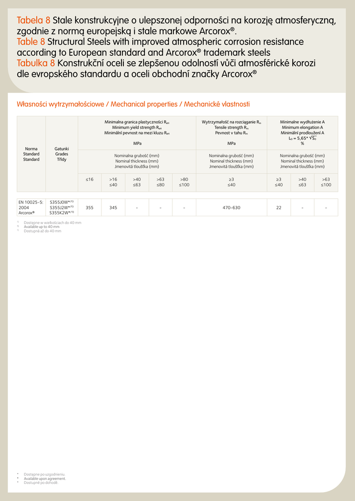 Tabela 8 Stale konstrukcyjne o ulepszonej odporności na korozję atmosferyczną, zgodnie z normą europejską i stale markowe Arcorox®. Table 8 Structural Steels with improved atmospheric corrosion resistance according to European standard and Arcorox® trademark steels Tabulka 8 Konstrukční oceli se zlepšenou odolností vůči atmosférické korozi dle evropského standardu a oceli obchodní značky Arcorox® Własności wytrzymałościowe / Mechanical properties / Mechanické vlastnosti Norma Standard Standard EN 10025-5: 2004 Arcorox® 1) 1) 1) Gatunki Grades Třídy S355J0W*/1) S355J2W*/1) S355K2W*/1) Dostępne w wielkościach do 40 mm Available up to 40 mm Dostupná až do 40 mm * Dostępne po uzgodnieniu. * Available upon agreement. * Dostupné po dohodě. Minimalna granica plastyczności ReH Minimum yield strength ReH Minimální pevnost na mezi kluzu ReH Wytrzymałość na rozciąganie Rm Tensile strength Rm Pevnost v tahu Rm MPa MPa Minimalne wydłużenie A Minimum elongation A Minimální prodloužení A LO = 5,65* S0 % Nominalna grubość (mm) Nominal thickness (mm) Jmenovitá tloušťka (mm) Nominalna grubość (mm) Nominal thickness (mm) Jmenovitá tloušťka (mm) Nominalna grubość (mm) Nominal thickness (mm) Jmenovitá tloušťka (mm) ≤16 >16 ≤40 >40 ≤63 >63 ≤80 >80 ≤100 ≥3 ≤40 ≥3 ≤40 >40 ≤63 >63 ≤100 355 345 - - - 470-630 22 - - Skład chemiczny / Chemical composition / Chemické složení Analiza próbki pobranej z kadzi Ladle analysis Pánvová analýza Norma Standard Standard EN 10025-5: 2004 Arcorox® 1) 2) 3) 4) 5) 6) 1) 2) 3) 4) 5) 6) 1) 3) 4) 5) 2) 6) Gatunki Grades Třídy S355J0W* S355J2W*/6) S355K2W*/6) C max. % Si max. % 0,16 0,50 Mn P % % max. 0,040 0,50-1,50 max. 0,035 max. 0,035 S max. % N max. % Dodatek p.w.a.1) Addition of n.b.e.1) Přísada S.b.E.1) 0,040 0,035 0,035 0,009 2)5) - tak / yes / ano tak / yes / ano Cr max. % Cu % 0,40-0,80 0,25-0,55 Pozostałe Others Ostatní 3)4) Dodatek pierwiastków wiążących azot: stale będą zawierać co najmniej jeden z następujących pierwiastków: AI łącznie ≥ 0,020%, Nb: 0,015 - 0,060%, V: 0,02-0,12%, Ti: 0,02 - 0,10%. Jeżeli te pierwiastki zostaną użyte w połączeniu, co najmniej jeden z nich musi być obecny w minimalnej podanej ilości. Dopuszczalne jest przekroczenie określonych wartości pod warunkiem, że dla każdego zwiększenia o 0,001 % N, maksymalna zawartość Pmax zostanie zredukowana o 0,005%; jednak, zawartość N w analizie próbki pobranej z kadzi, nie będzie wyższa niż 0,012%. Stale mogą wykazywać zawartość Ni w maksymalnej ilości 0,65%. Stale mogą zawierać max. 0,30% Mo i max. 0,15% Zr. Maksymalna wartość azotu nie ma zastosowania, jeżeli skład chemiczny wykazuje minimalną całkowitą zawartość AI 0,020%, lub jeżeli inne pierwiastki wiążące N obecne są w wystarczającej ilości. Pierwiastki wiążące N musza być podane w dokumencie z kontroli. Stal całkowicie uspokojona, zawierająca pierwiastki wiążące azot w ilościach wystarczających do związania dostępnego azotu (na przykład 0,02% Al). Jeżeli są używane pozostałe pierwiastki, muszą zostać podane w dokumencie z kontroli. Addition of nitrogen binding elements: the steels shall contain at least one of the following elements: AI total ≥ 0,020%, Nb: 0,015 - 0,060%, V: 0,02-0,12%, Ti: 0,02 - 0,10%. If these elements are used in combination, at least one of them shall be present with the minimum content indicated. It is permissible to exceed the specified values provided that for each increase of 0,001 % N, the Pmax content will be reduced by 0,005%; the N content of the ladle analysis, however, shall not be more than 0,012%. The steels may show a Ni content of max. 0,65%. The steels may contain max. 0,30% Mo and max. 0,15% Zr. The max. value for nitrogen does not apply if the chemical composition shows a minimum total AI content of 0,020% or if sufficient other N binding elements are present. The N binding elements shall be mentioned in the inspection document. Fully killed steel containing nitrogen binding elements in amounts sufficient to bind available nitrogen (for example 0,02% Al). If other elements are used they shall be reported in the inspection document. Přísada prvků, vázajících dusík: oceli, které obsahují alespoň jeden z následujících prvků: AI celkem ≥ 0,020%, Nb: 0,015 - 0,060%, V: 0,02-0,12%, Ti: 0,02 - 0,10%. Pokud jsou tyto prvky použity v kombinaci, alespoň jeden z nich musí být přítomen v uvedeném minimálním množství. Je přípustné překročit specifikované hodnoty za předpokladu, že pro každé zvýšení 0,001 % N, se obsah Pmax sníží o 0,005%; obsah N v pánvové analýze však nesmí přesáhnout 0,012%. Oceli mohou vykazovat obsah Ni max. 0,65%. Oceli mohou obsahovat max. 0,30% Mo a max. 0,15% Zr. Maximální hodnota dusíku se neaplikuje, jestliže chemické složení vykazuje minimální celkový obsah AI 0,020%, nebo jestliže jsou dostatečně přítomny jiné prvky vázající N. Prvky vázající N musí být uvedeny v kontrolním dokumentu. Uklidněná ocel s obsahem prvků vázajících dusík v množství dostatečném pro vázání dostupného dusíku (např. 0,02% Al). V případě použití jiných prvků musí být tyto nahlášeny v kontrolním dokumentu. * Dostępne po uzgodnieniu. * Available upon agreement. * Dostupné po dohodě. 51