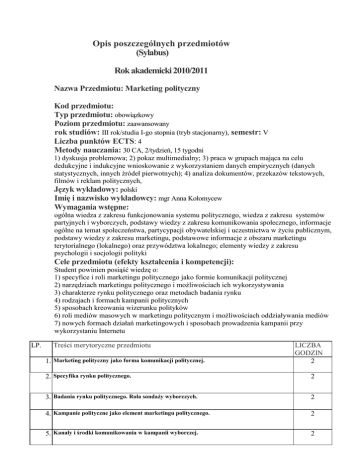 Opis poszczególnych przedmiotów (Sylabus) Rok akademicki 2010/2011 Nazwa Przedmiotu: Marketing polityczny Kod przedmiotu: Typ przedmiotu: obowiązkowy Poziom przedmiotu: zaawansowany rok studiów: III rok/studia I-go stopnia (tryb stacjonarny), semestr: V Liczba punktów ECTS: 4 Metody nauczania: 30 CA, 2/tydzień, 15 tygodni 1) dyskusja problemowa; 2) pokaz multimedialny; 3) praca w grupach mająca na celu dedukcyjne i indukcyjne wnioskowanie z wykorzystaniem danych empirycznych (danych statystycznych, innych źródeł pierwotnych); 4) analiza dokumentów, przekazów tekstowych, filmów i reklam politycznych, Język wykładowy: polski Imię i nazwisko wykładowcy: mgr Anna Kołomycew Wymagania wstępne: ogólna wiedza z zakresu funkcjonowania systemu politycznego, wiedza z zakresu systemów partyjnych i wyborczych, podstawy wiedzy z zakresu komunikowania społecznego, informacje ogólne na temat społeczeństwa, partycypacji obywatelskiej i uczestnictwa w Ŝyciu publicznym, podstawy wiedzy z zakresu marketingu, podstawowe informacje z obszaru marketingu terytorialnego (lokalnego) oraz przywództwa lokalnego; elementy wiedzy z zakresu psychologii i socjologii polityki Cele przedmiotu (efekty kształcenia i kompetencji): Student powinien posiąść wiedzę o: 1) specyfice i roli marketingu politycznego jako formie komunikacji politycznej 2) narzędziach marketingu politycznego i moŜliwościach ich wykorzystywania 3) charakterze rynku politycznego oraz metodach badania rynku 4) rodzajach i formach kampanii politycznych 5) sposobach kreowania wizerunku polityków 6) roli mediów masowych w marketingu politycznym i moŜliwościach oddziaływania mediów 7) nowych formach działań marketingowych i sposobach prowadzenia kampanii przy wykorzystaniu Internetu LP. Treści merytoryczne przedmiotu 1. Marketing polityczny jako forma komunikacji politycznej. LICZBA GODZIN 2 2. Specyfika rynku politycznego. 2 3. Badania rynku politycznego. Rola sondaŜy wyborczych. 2 4. Kampanie polityczne jako element marketingu politycznego. 2 5. Kanały i środki komunikowania w kampanii wyborczej. 2 6. Wizerunek polityczny i sposoby jego kreowania. 2 7. Media masowe i ich rola w marketingu politycznym. 3 8. Propaganda, perswazja, manipulacja czy marketing polityczny? 2 9. Reklama jako narzędzie marketingu politycznego. 3 10. Public relations w polityce. 2 11. Lokalny marketing polityczny. Komunikowanie polityczne na szczeblu lokalnym. 2 12. Rola i znaczenie opinii publicznej w polityce. 2 13. Marketing polityczny w warstwie językowej. Analiza zawartości komunikatów politycznych. 2 14. Internet i nowe media – nowe narzędzia marketingu politycznego. 2 Metody oceny: - aktywne uczestnictwo zajęciach - uzyskanie pozytywnej oceny z testu sprawdzającego wiadomości (sesja zimowa) Spis zalecanych lektur: Literatura podstawowa: Cwalina W., A. Falkowski, Marketing polityczny. Perspektywa, psychologiczna, Wydawnictwo Uniwersytetu Gdańskiego, Gdańsk 2005. Dobek-Ostrowska B., Komunikowanie polityczne i publiczne, PWN, Warszawa 2007. Dobek-Ostrowska B., Media masowe i aktorzy polityczni w świetle studiów nad komunikowaniem politycznym, Wydawnictwo Uniwersytetu Wrocławskiego, Wrocław 2004. Furman W., Dominacja czy porozumienie. Związki między dziennikarstwem a public relations, Wydawnictwo Uniwersytetu Rzeszowskiego, Rzeszów 2009. Kozłowska A., Oddziaływanie mass mediów, SGH, Warszawa 2006. Kształtowanie wizerunku, red. B. Ociepka, Wydawnictwo Uniwersytetu Wrocławskiego, Wrocław 2005. Mazur M., Marketing polityczny. Studium porównawcze prezydenckich kampanii wyborczych w USA i w Polsce, PWN, Warszawa 2004. Michalczyk S., Komunikowanie polityczne. Teoretyczne aspekty procesu, Wydawnictwo Śląsk, Katowice 2005. Literatura uzupełniająca: Bralczyk J., O języku polskiej polityki lat 80. i 90.,Wydawnictwo Trio, Warszawa 2003. Handbook of political communication, red. D. Nimmo, K.R. Sanders, London 1981. Język w marketingu, red. Kazimierz Michalewski, Wydawnictwo Uniwersytetu Łódzkiego, Łódź 2008. Kampania wyborcza: marketingowe aspekty komunikowania politycznego, red. B. Dobek-Ostrowska, Wydawnictwo Uniwersytetu Wrocławskiego, Wrocław 2005. Kampanie wyborcze – studium przypadku, red. J. Marszałek – Kawa, Wydawnictwo Adam Marszałek, Toruń 2009. Laszczak M., Political advertising : skuteczne lansowanie polityka, „Marketing w Praktyce”, nr 3/2000. Lees-Marshment J., The political marketing revolution: trans forming the government of the UK, Manchester University Press, 2004. Marketing polityczny a postawy i zachowania wyborcze społeczeństwa polskiego, red. Walczak-Duraj, Płock – Łódź 2002. McCombs M., Ustanawianie agendy. Media masowe i opinia publiczna, Wydawnictwo UJ, Kraków 2008. Mojsiewicz C., Rola opinii publicznej w polityce, Wydawnictwo Terra WSZiB, Poznań 1999. Pawlas-CzyŜ S., Aktorzy Ŝycia politycznego w świecie opinii dziennikarzy. Jacy są a jacy powinni być, Oficyna Wydawnicza Impuls, Kraków 2008. Piasecki A.K., Model przywództwa. Wymiar lokalny, krajowy, międzynarodowy, Wydawnictwo Profesja, Kraków 2006. Psychologia polityczna, red. D.O. Sears, L. Huddy, R. Jervis, Wydawnictwo Uniwersytetu Jagiellońskiego, Kraków 2008. Siewierska-Chmaj A., Język polskiej polityki : politologiczno-semantyczna analiza expose premierów Polski w latach 1919-2004, Wydawnictwo WyŜszej Szkoły Informatyki i Zarządzania, Rzeszów 2006. Steciąg M., Marketing polityczny: kreowanie wizerunków polityków w sloganach reklamowych, red. K. Michalewski, Wydawnictwo Uniwersytetu Łódzkiego, Łódź 2008. Współczesna WieŜa Babel, red. J. Chłopecki, A. Siewierska-Chmaj, Wydawnictwo WyŜszej Szkoły Informatyki i Zarządzania w Rzeszowie, Rzeszów 2003. /podpis prowadzącego/ /podpis Kierownika Zakładu/
